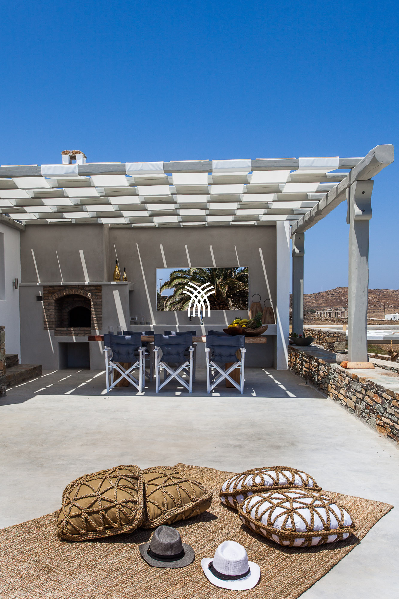 À l'intérieur, la villa dispose d'un salon spacieux avec des sièges moelleux et des vues spectaculaires sur la piscine et la mer Égée. La cuisine entièrement équipée répond à tous vos désirs culinaires, complétée par une zone de buanderie et de rangement séparée pour plus de commodité.