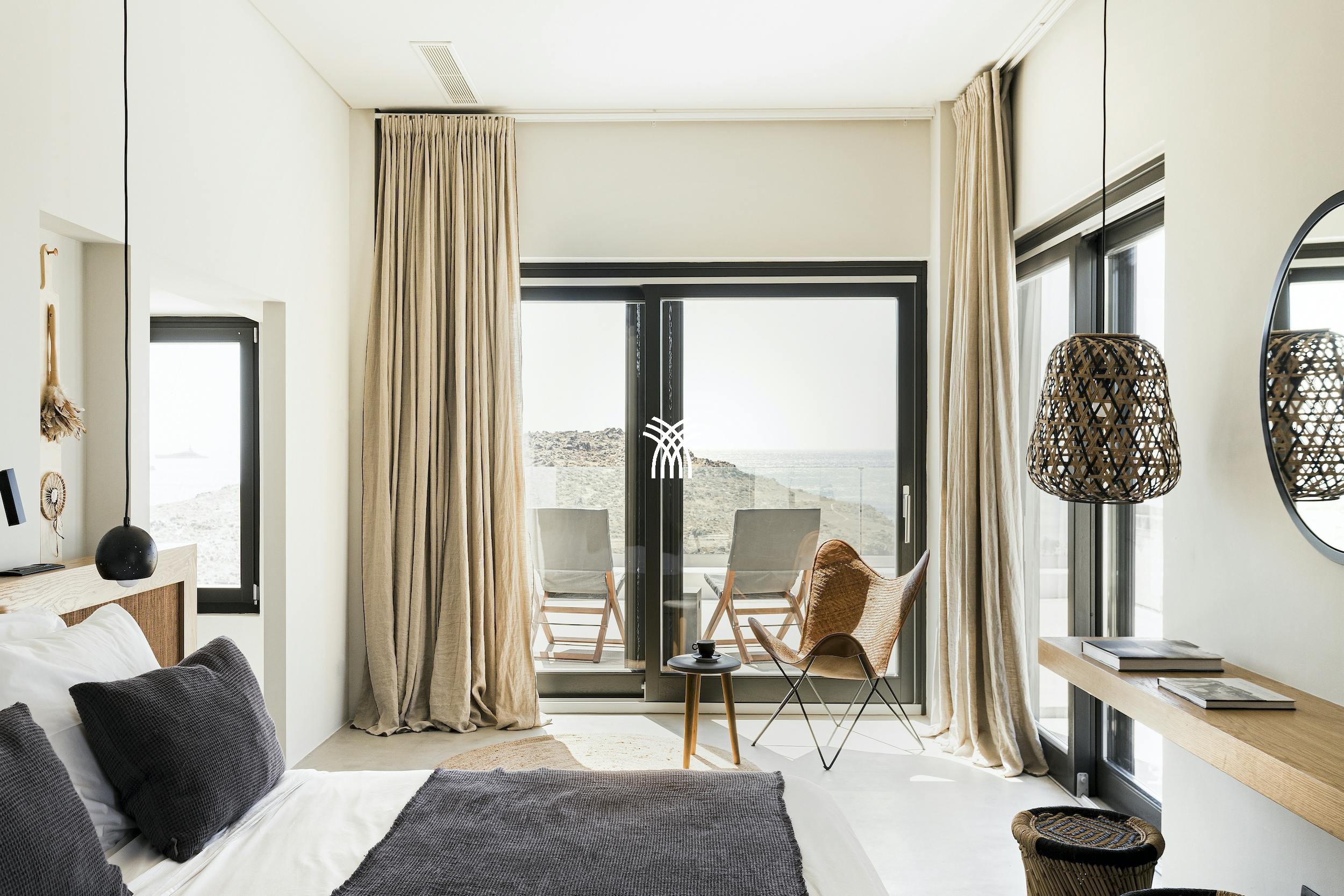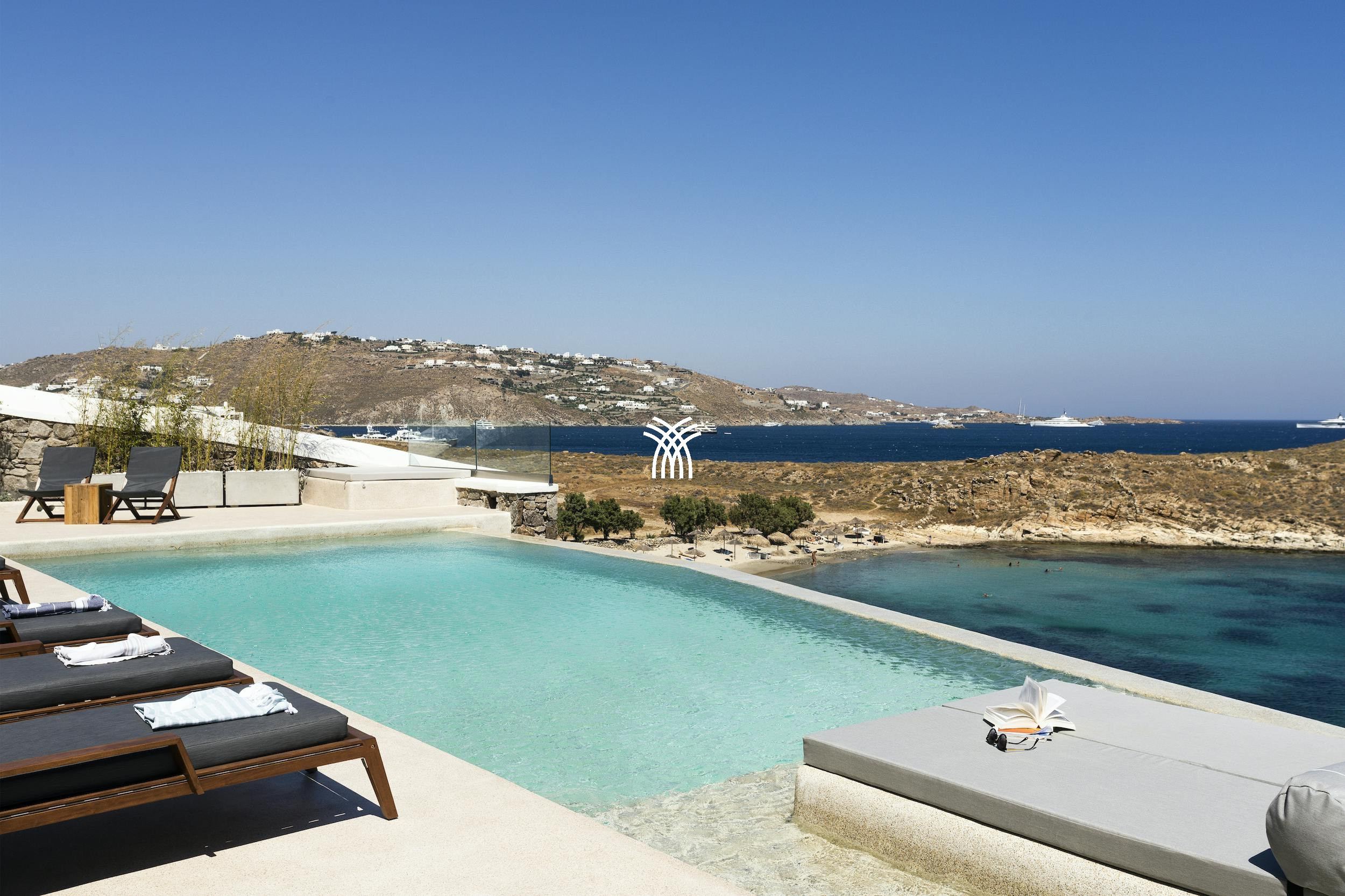 Une plage isolée se trouve à seulement deux minutes à pied, nichée en contrebas de la terrasse principale et offrant une rare intimité pour une baignade rafraîchissante dans des eaux cristallines. Pour plus de charme balnéaire et de vie insulaire animée, la plage d'Agios Ioannis, la zone cosmopolite d'Ornos et le centre animé de Mykonos ne sont qu'à une courte distance en voiture.