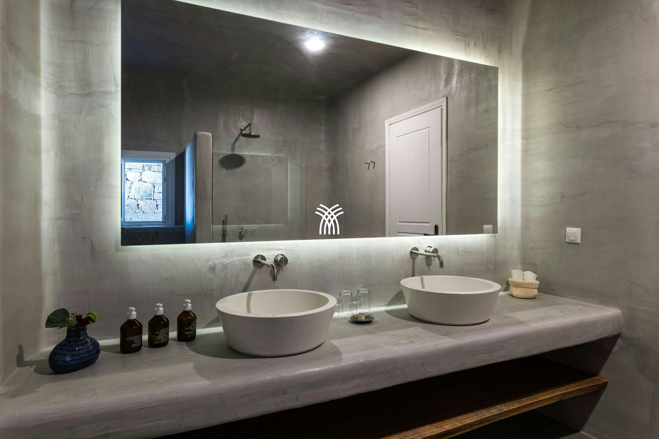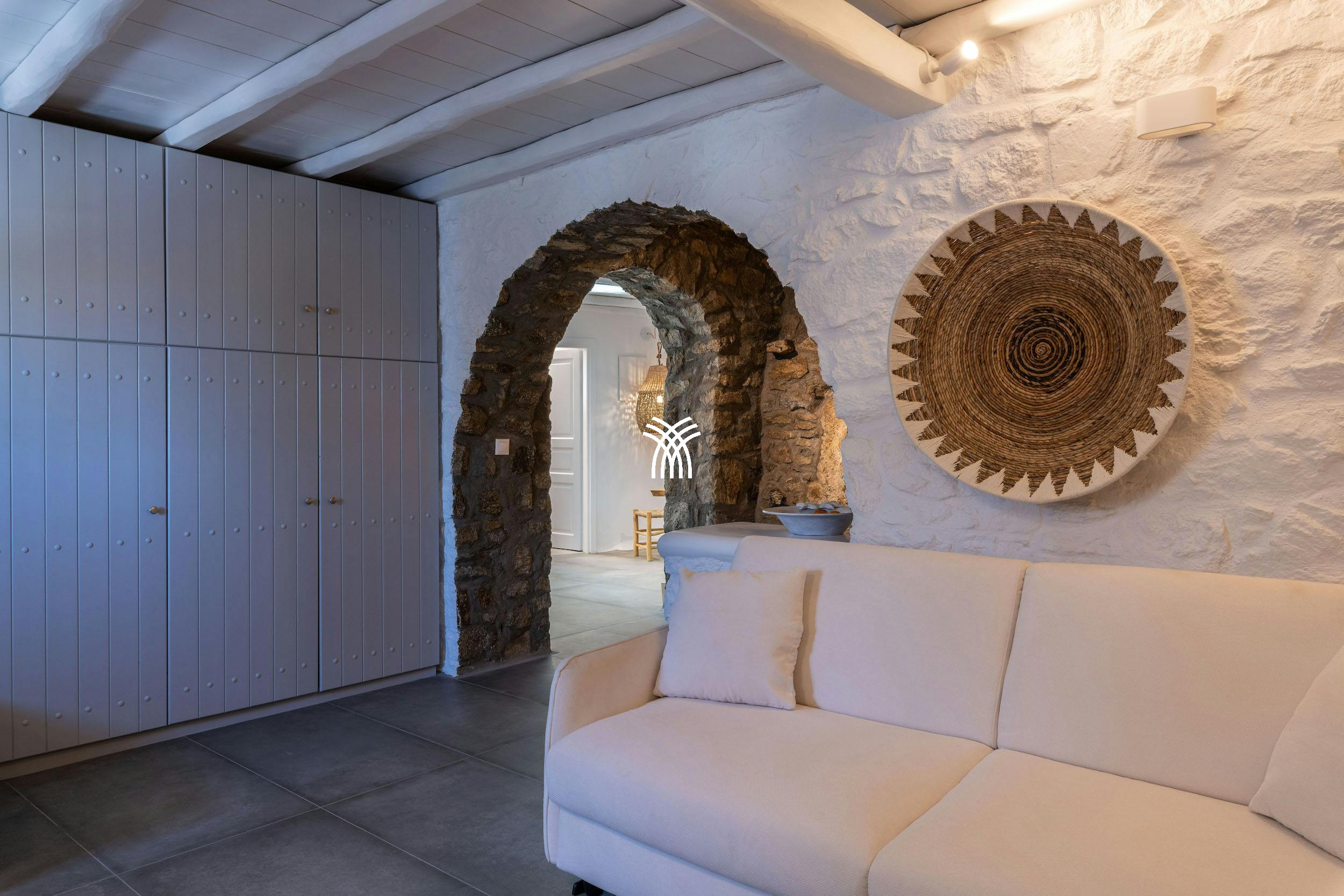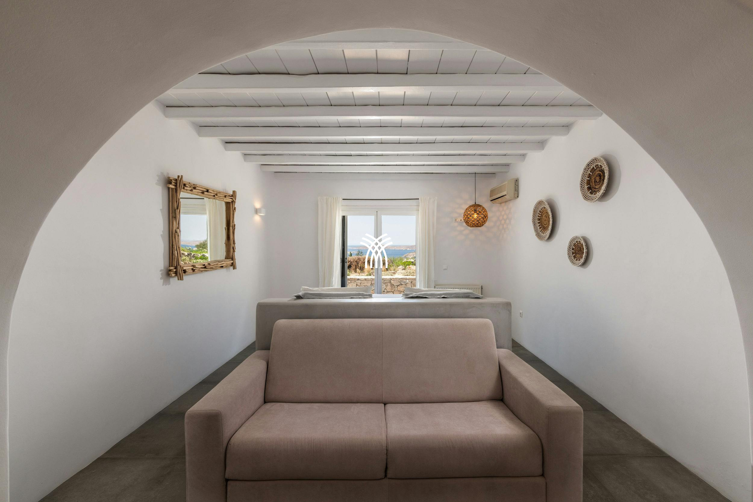 Chaque coin de cette location de villa de luxe en Grèce offre des vues panoramiques spectaculaires s'étendant à travers l'Égée, avec des panoramas qui révèlent les îles enchantantes de Siros, Serifos, Sifnos, Paros, Naxos, et les sites sacrés de Délos et Rinia. Le paysage naturel saisissant est le cadre parfait pour un séjour magique rempli de sérénité et de beauté.