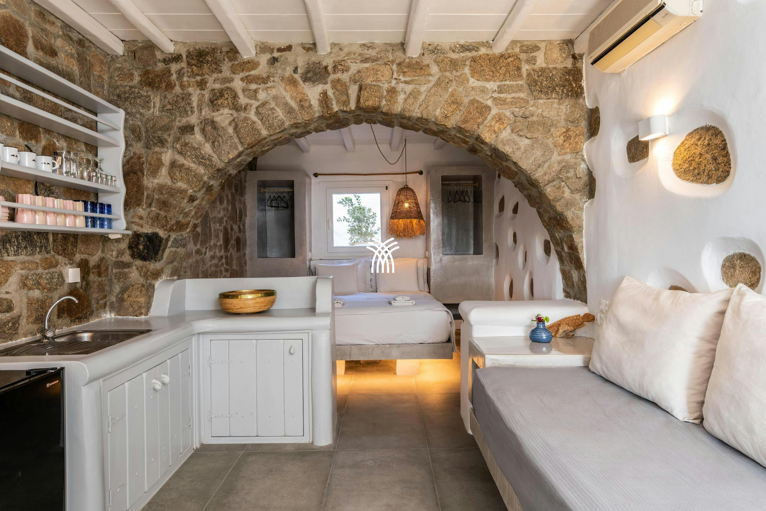 La Villa Kissos est un rare chef-d'œuvre qui allie l'architecture cycladique traditionnelle à la technologie domotique de pointe. Entourée d'un jardin luxuriant unique sur l'île, cette propriété de luxe propose huit chambres magnifiquement conçues réparties dans la maison principale et trois maisons d'hôtes privées, pouvant accueillir confortablement jusqu'à vingt invités.