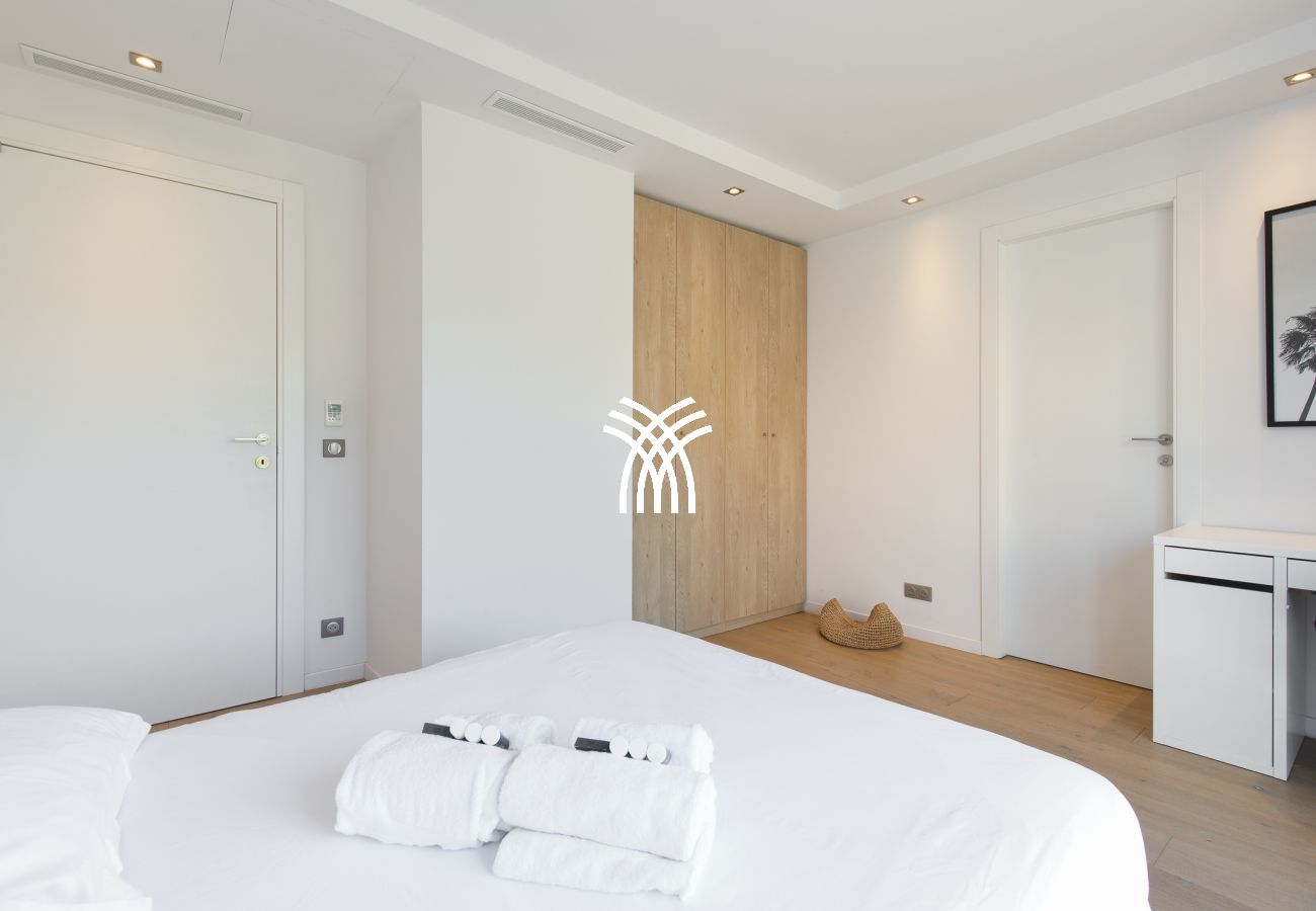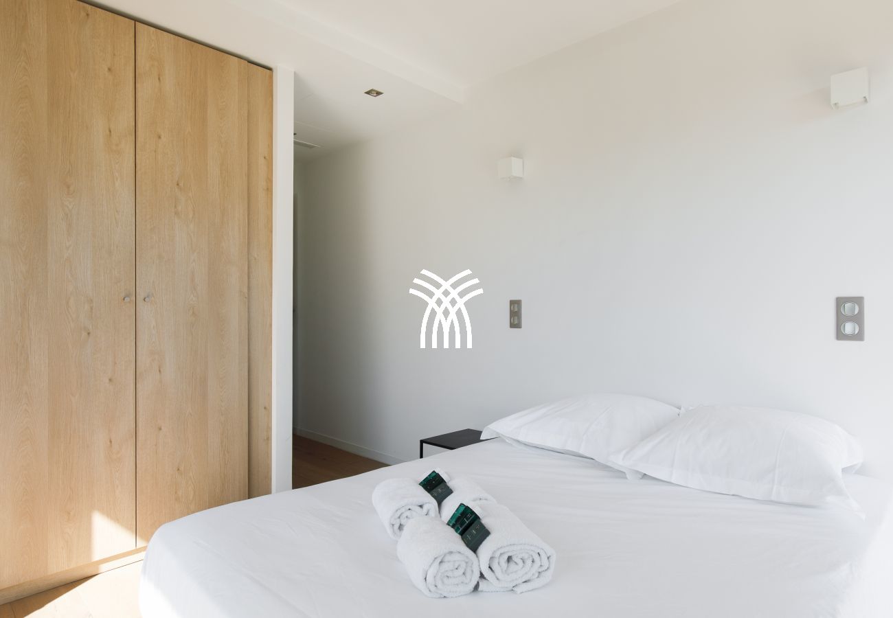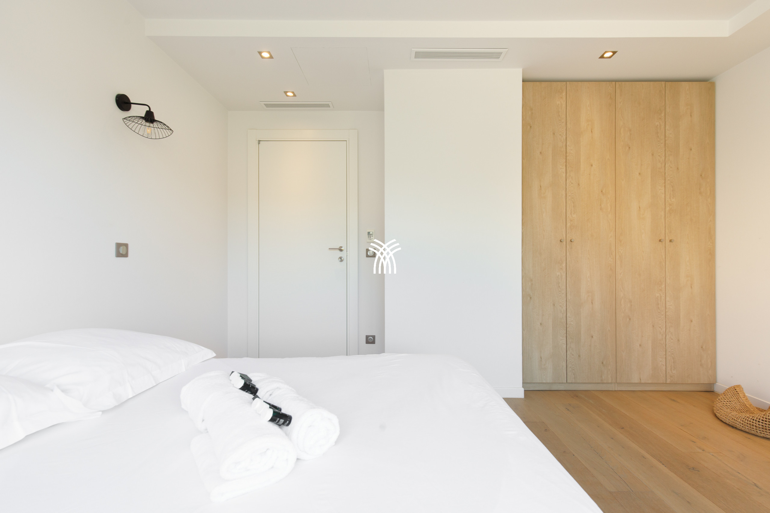 Chambre principale avec 1 lit double (160 cm), dressing, salle de bain (sol chauffant) avec baignoire, douche et toilettes. Accès à terrasse de 30 m².