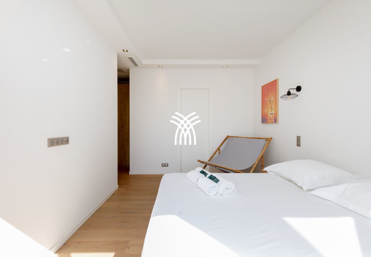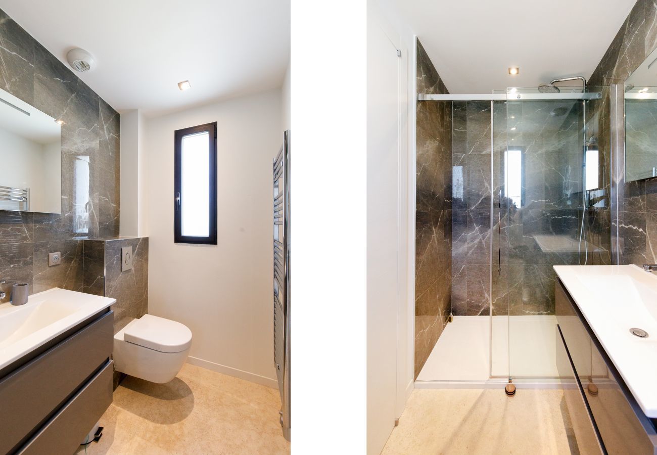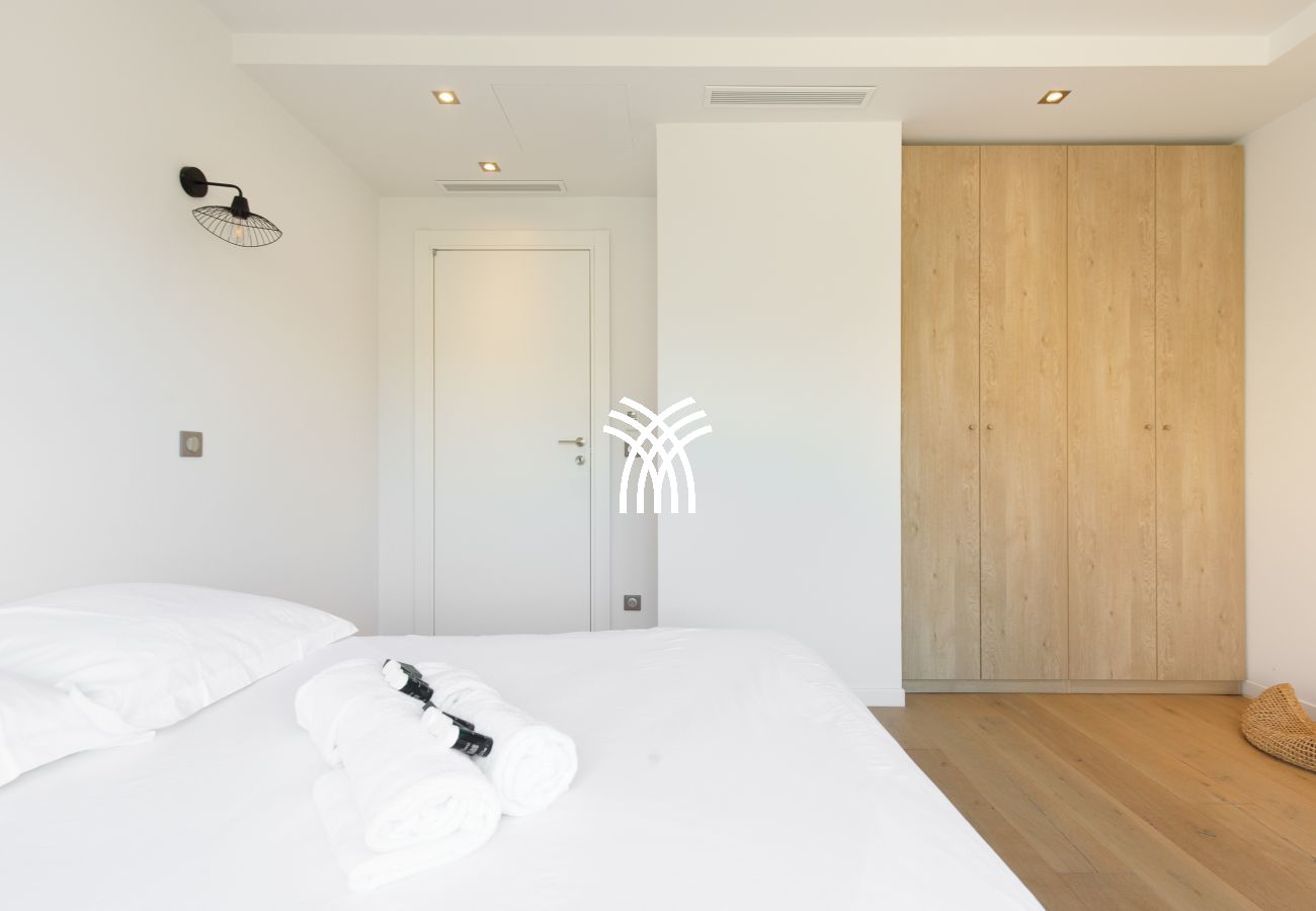 Chambre principale avec 1 lit double (160 cm), dressing, salle de bain (sol chauffant) avec baignoire, douche et toilettes. Accès à terrasse de 30 m².