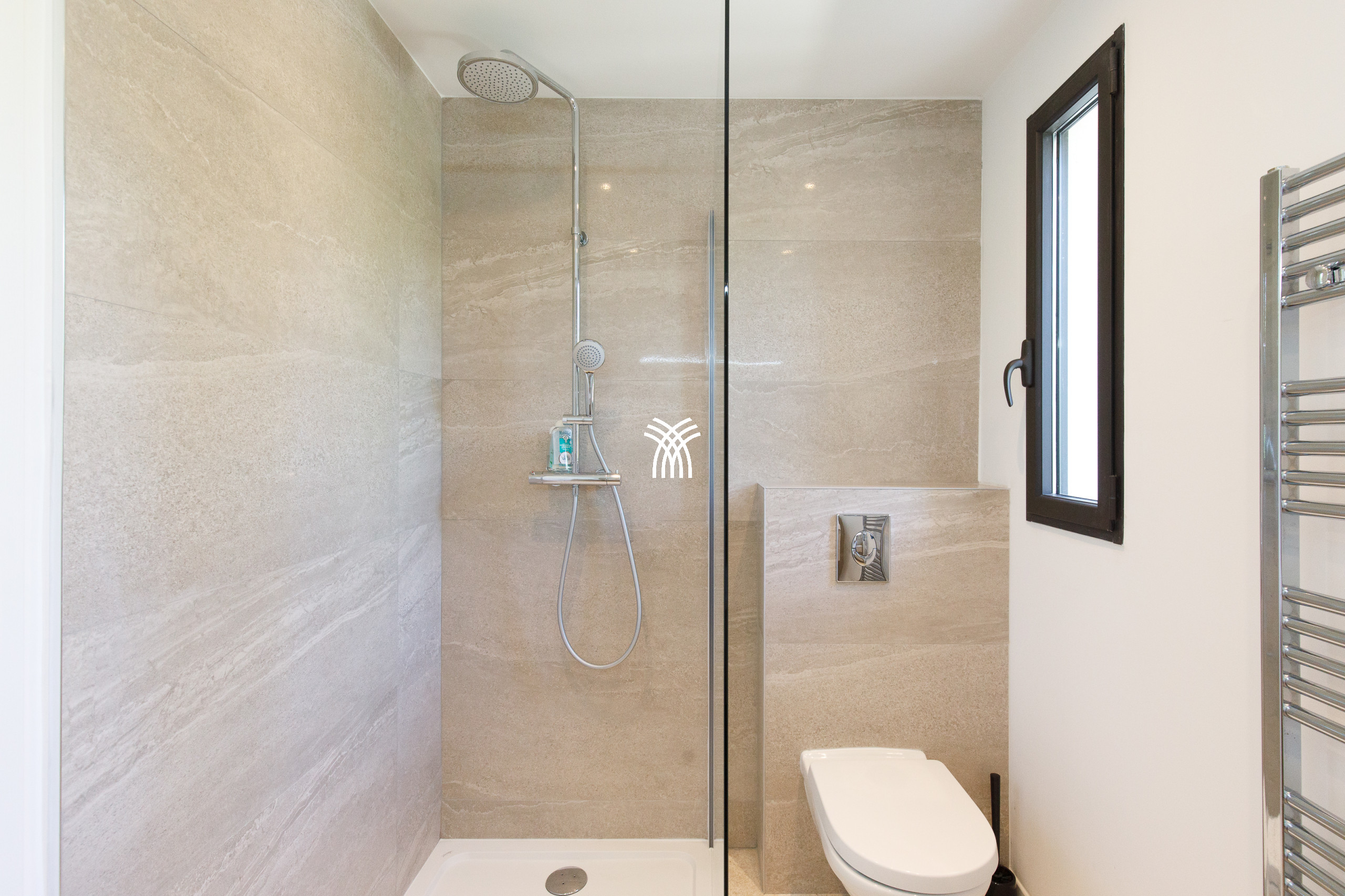 1 chambre : 1 lit double (160cm), salle de douche avec douche, sol chauffant et toilettes suspendues. Pansement