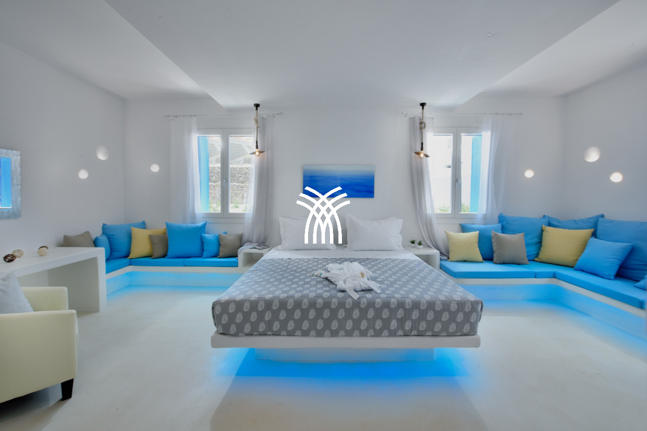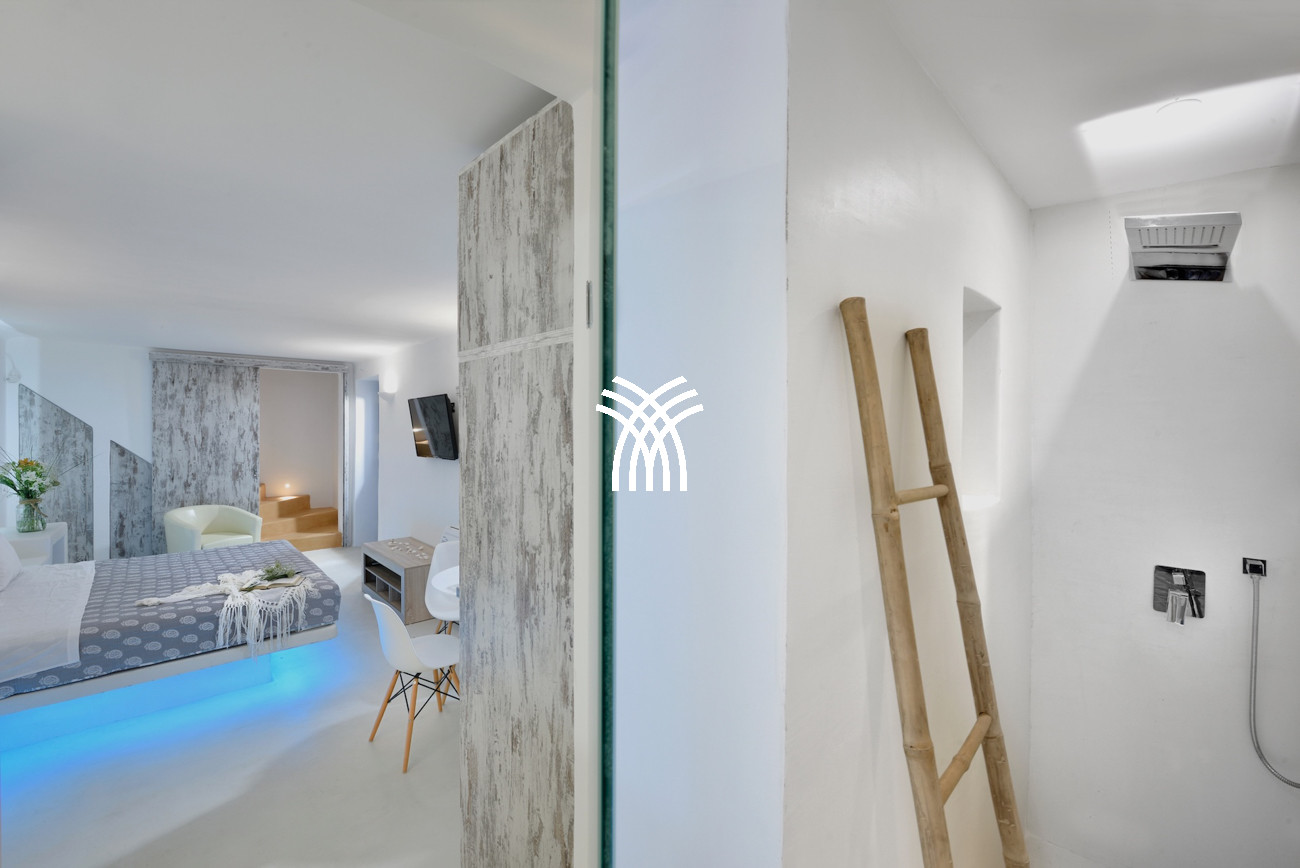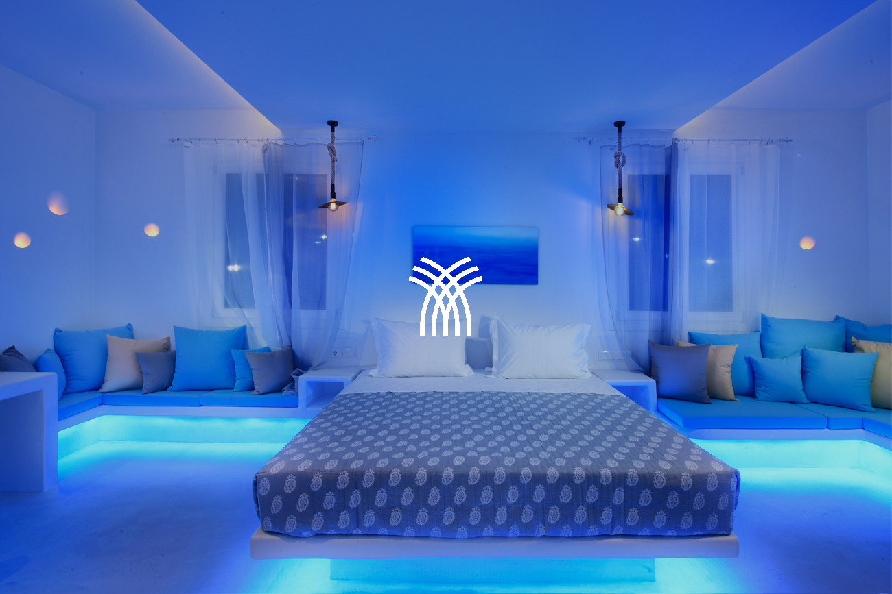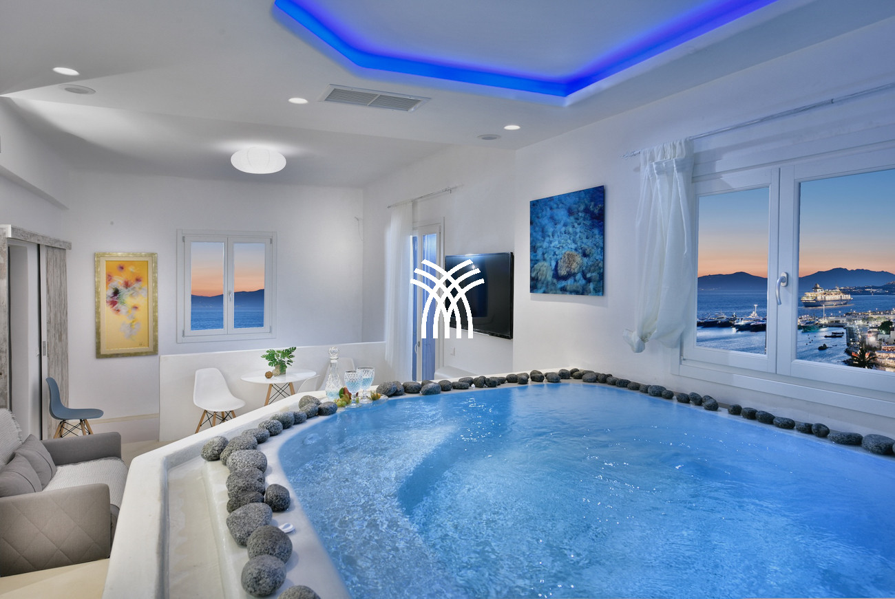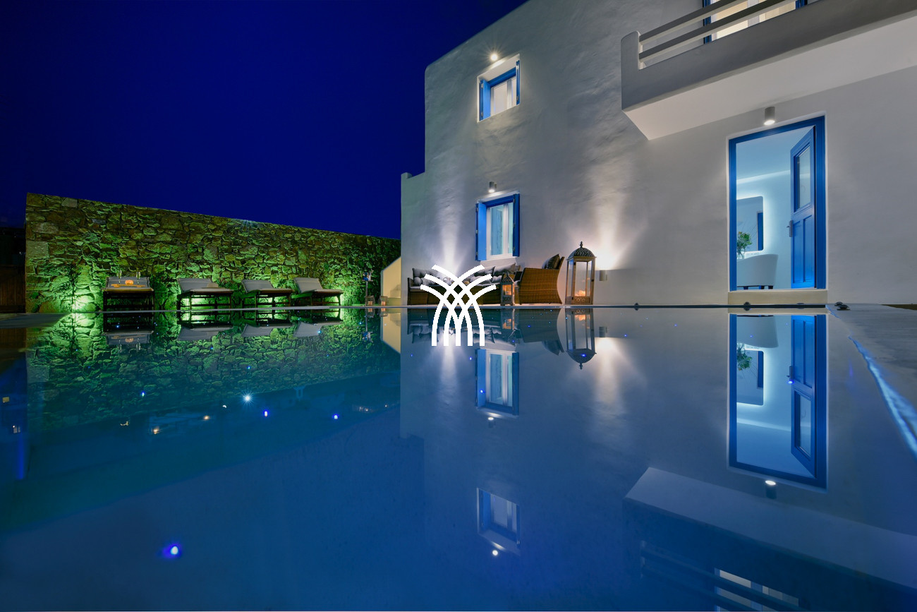La piscine extérieure de la villa brille magnifiquement après le coucher du soleil, tandis qu'un jacuzzi intérieur surdimensionné offrant des vues tout aussi inspirantes renforce le sentiment de luxe et de détente, célébrant la présence apaisante de l'eau dans toute la propriété. L'architecture cycladique est réinventée avec une touche contemporaine, où un éclairage LED moderne illumine subtilement sous les lits confortables et dans les salles de bains lumineuses et somptueuses, et un bois de haute qualité s'harmonise avec des murs blancs lumineux et des formes courbes élégantes pour créer une atmosphère de sophistication sans effort qui semble à la fois onirique et chaleureusement accueillante.
