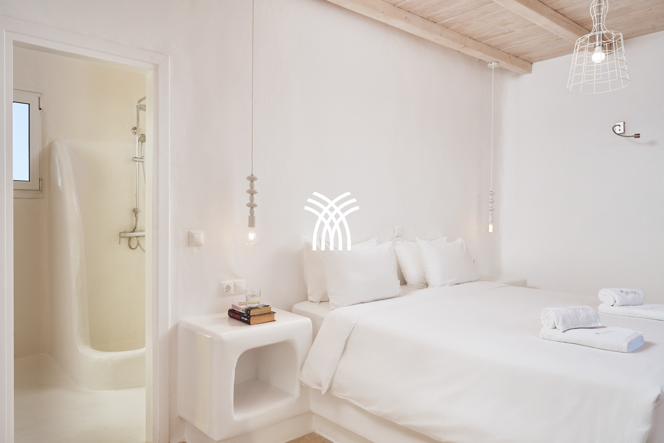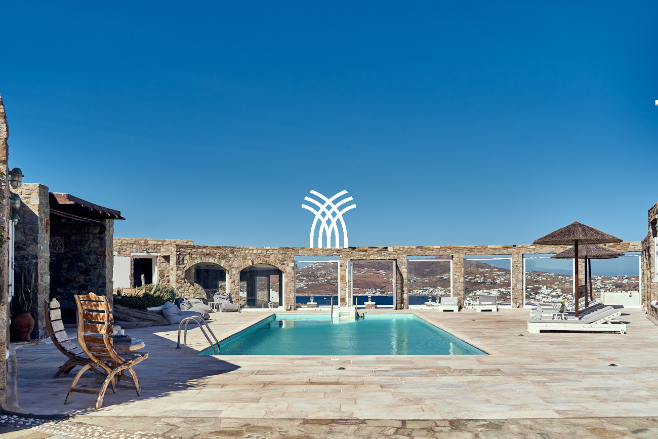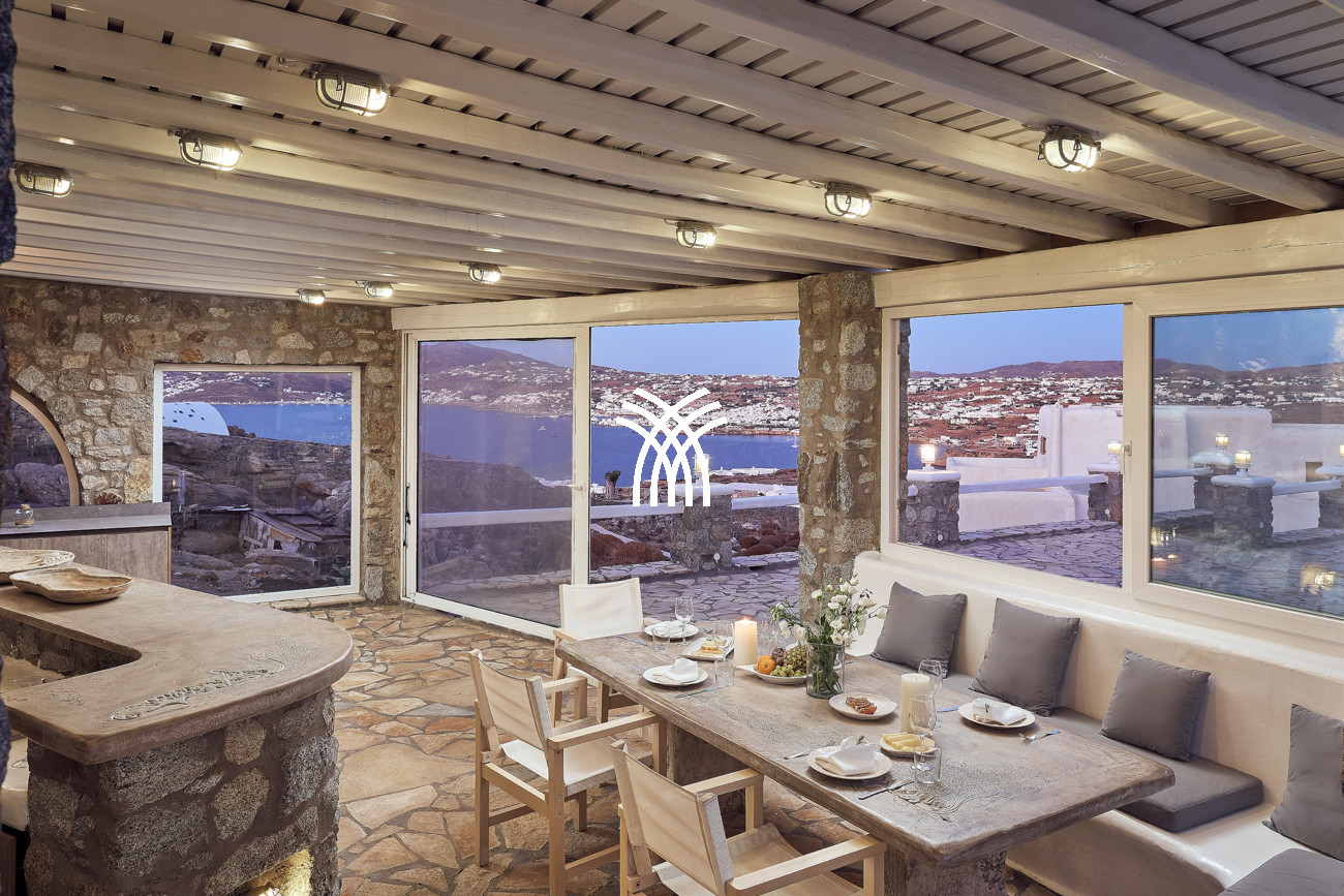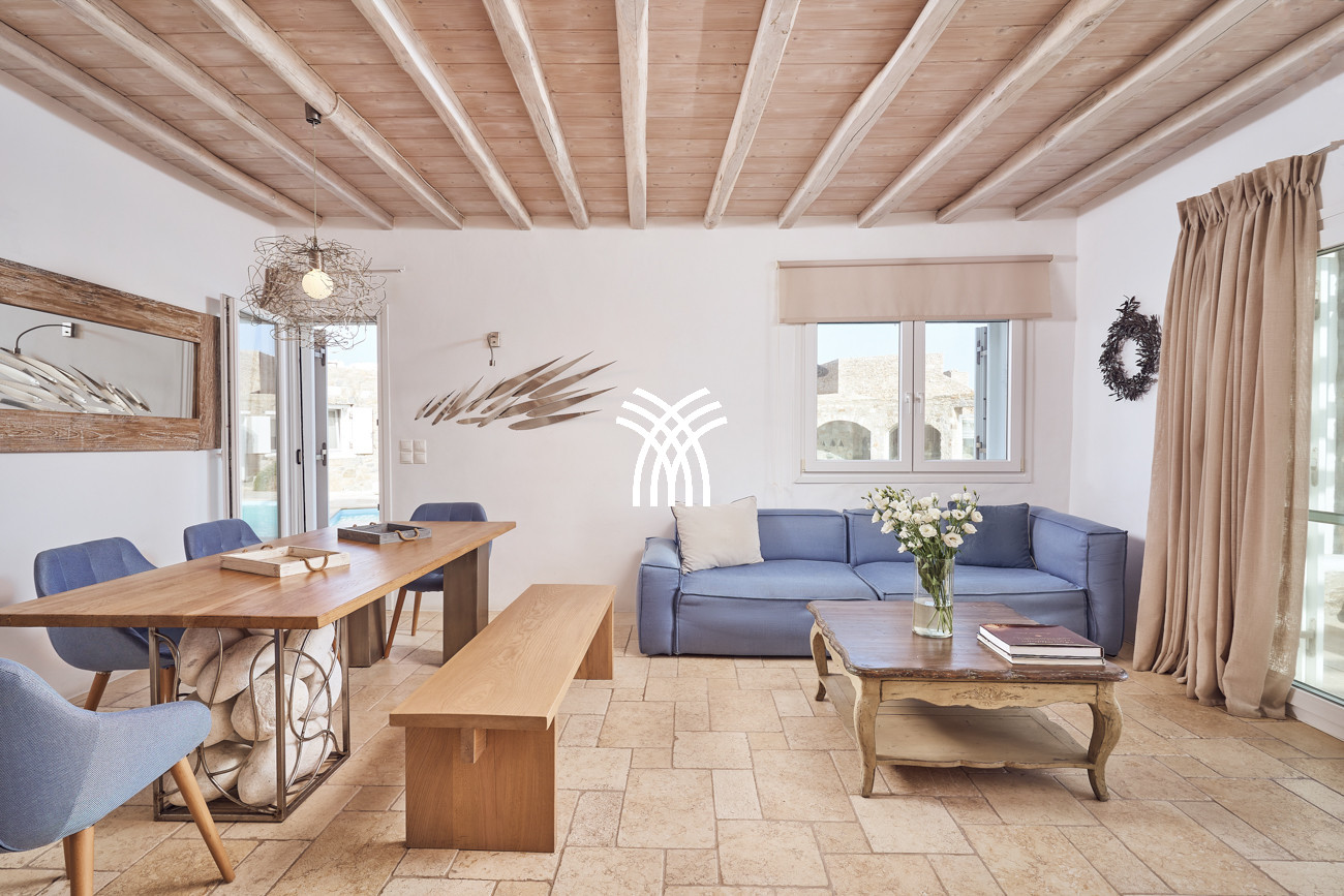 Des espaces extérieurs élégants comprennent un généreux espace salon parfait pour des cocktails au coucher du soleil et une véranda ombragée avec une grande table à manger pour douze personnes, idéale pour des repas en plein air sous les étoiles. À l'intérieur, la villa met en valeur le style iconique de Mykonos avec des plafonds vertigineux, des poutres en bois clair, et des murs blanchis à la chaux rehaussés par des sols en ciment poli et des équipements de luxe contemporains.