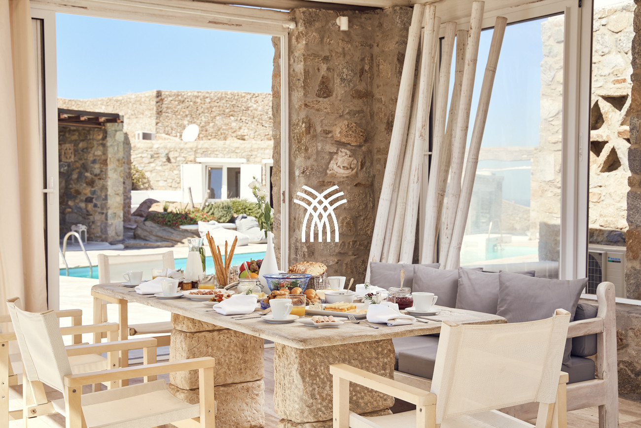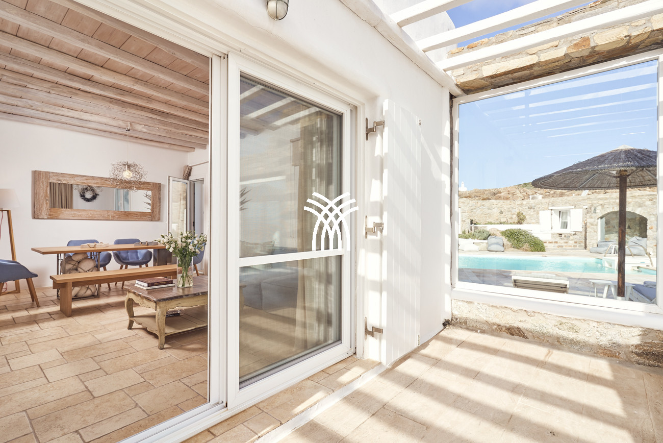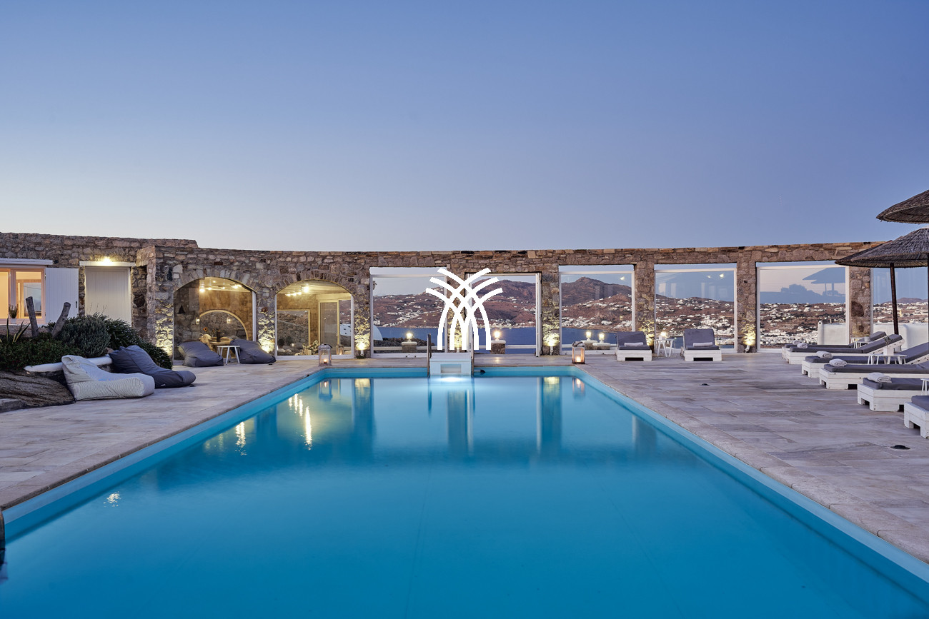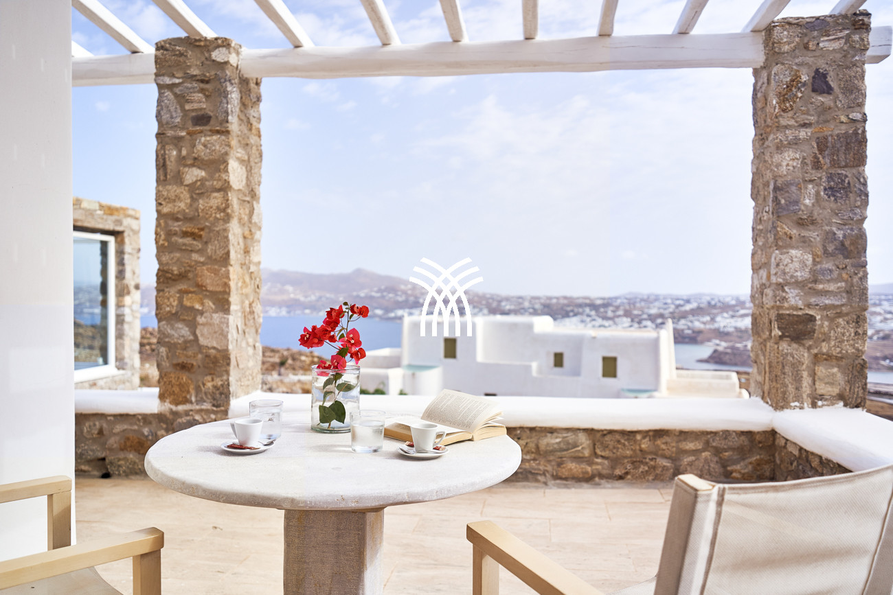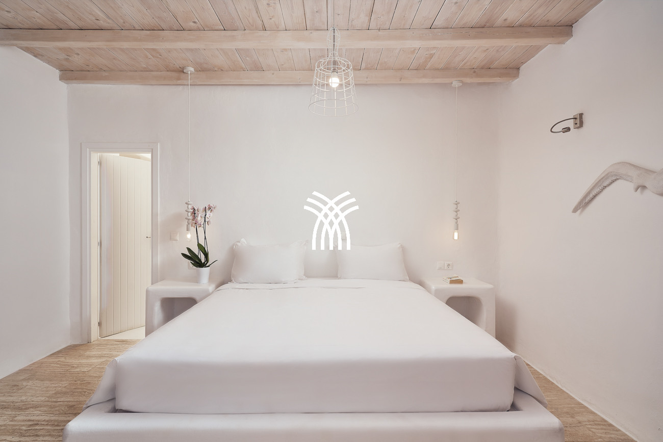 Des espaces extérieurs élégants comprennent un généreux espace salon parfait pour des cocktails au coucher du soleil et une véranda ombragée avec une grande table à manger pour douze personnes, idéale pour des repas en plein air sous les étoiles. À l'intérieur, la villa met en valeur le style iconique de Mykonos avec des plafonds vertigineux, des poutres en bois clair, et des murs blanchis à la chaux rehaussés par des sols en ciment poli et des équipements de luxe contemporains.