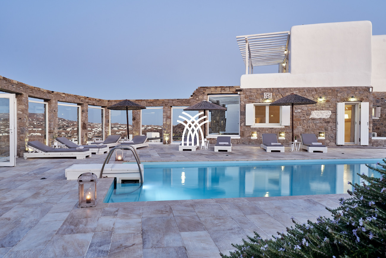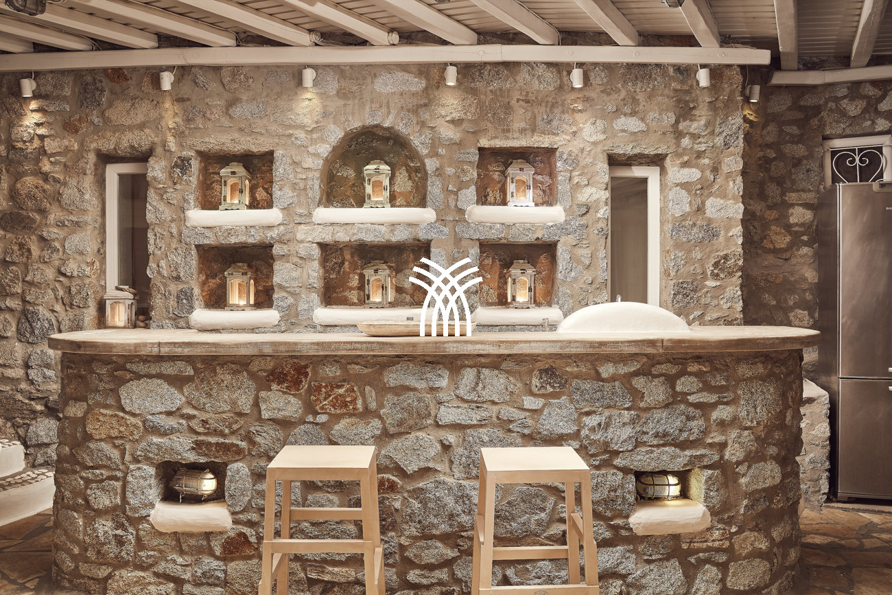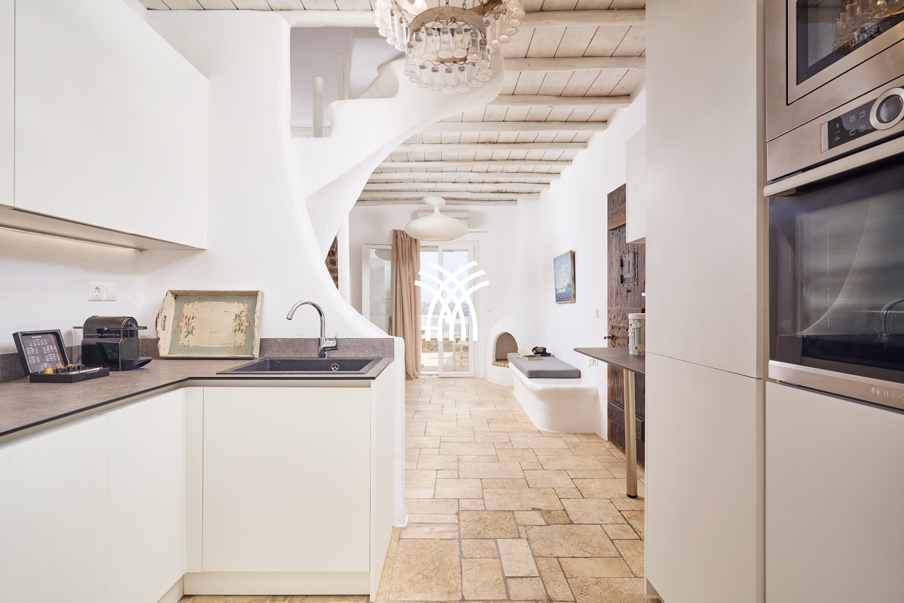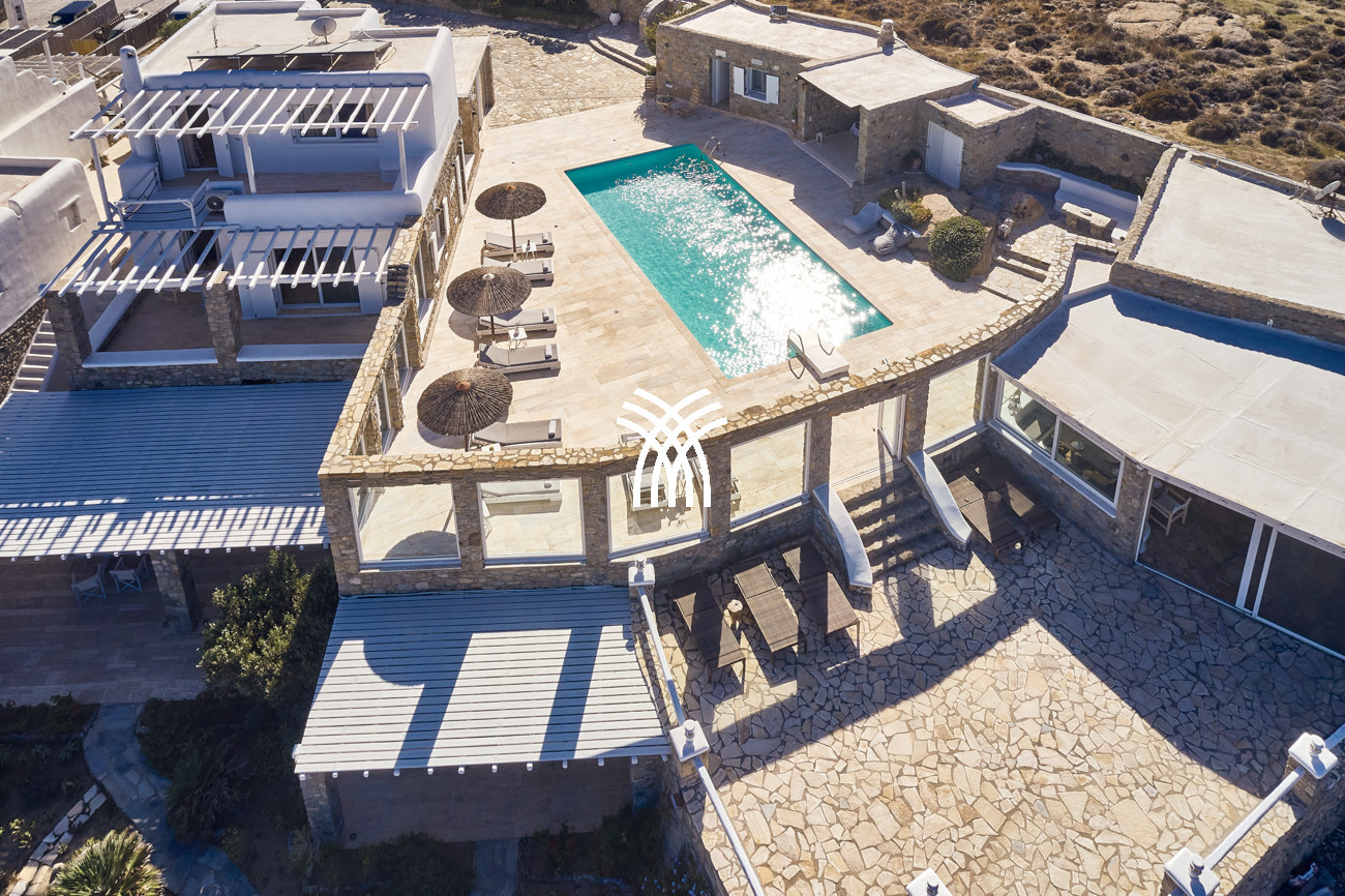 Des espaces extérieurs élégants comprennent un généreux espace salon parfait pour des cocktails au coucher du soleil et une véranda ombragée avec une grande table à manger pour douze personnes, idéale pour des repas en plein air sous les étoiles. À l'intérieur, la villa met en valeur le style iconique de Mykonos avec des plafonds vertigineux, des poutres en bois clair, et des murs blanchis à la chaux rehaussés par des sols en ciment poli et des équipements de luxe contemporains.