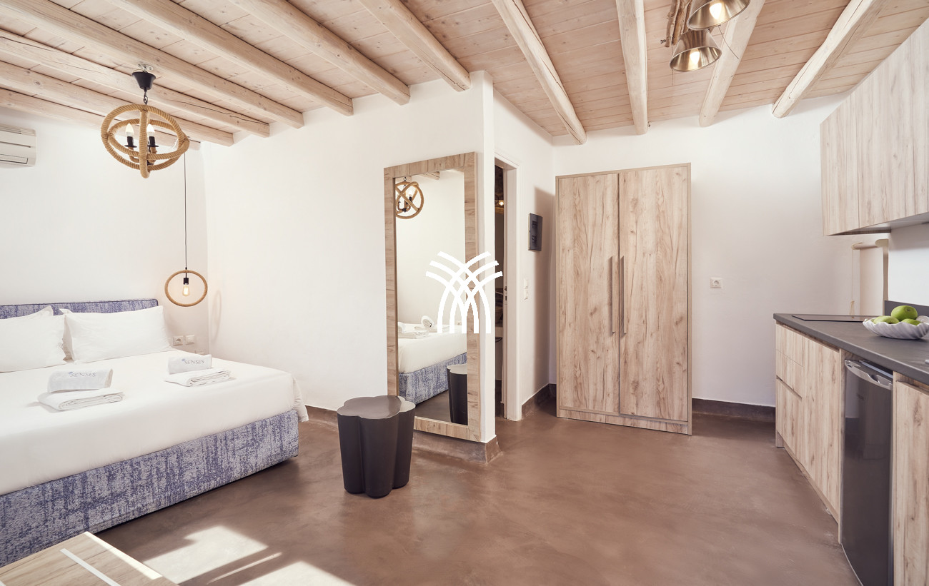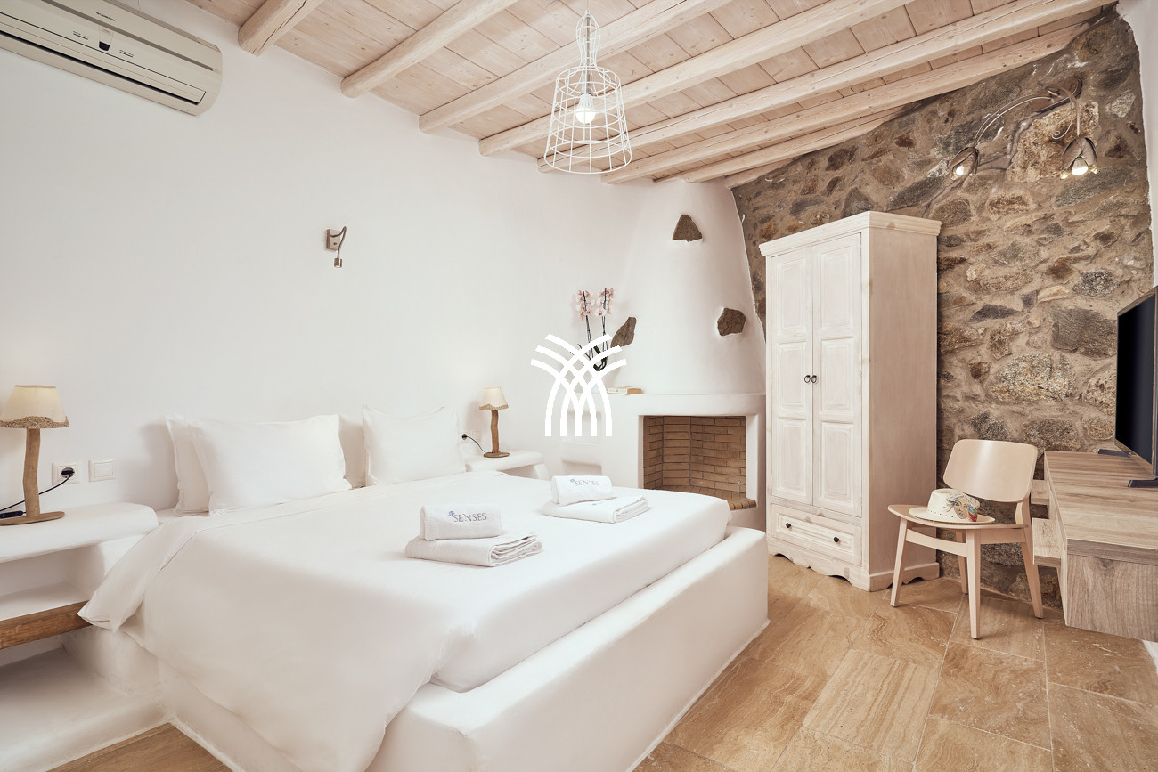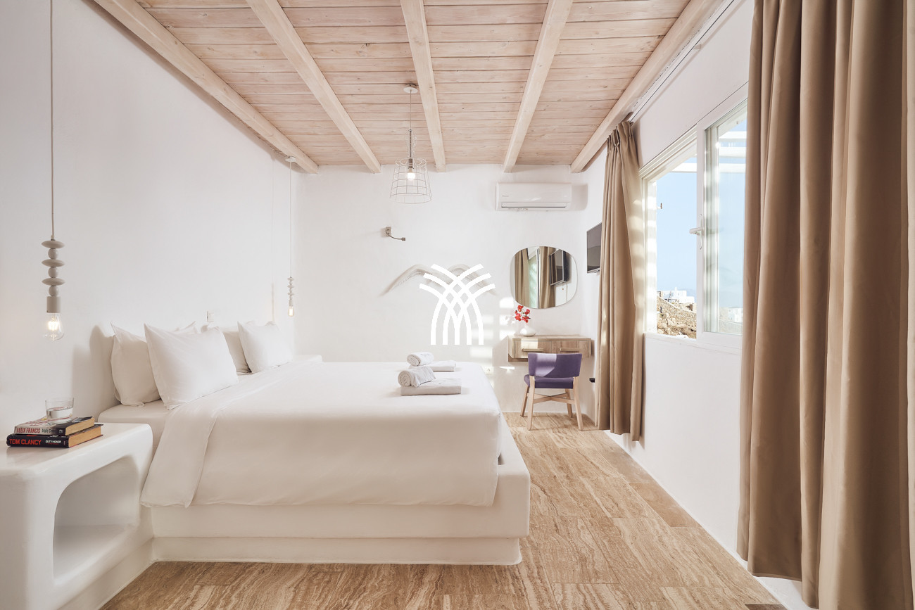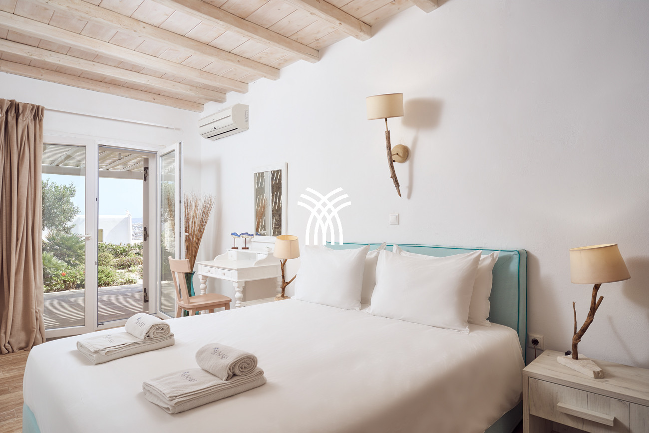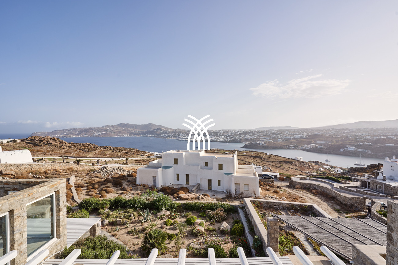 Des espaces extérieurs élégants comprennent un généreux espace salon parfait pour des cocktails au coucher du soleil et une véranda ombragée avec une grande table à manger pour douze personnes, idéale pour des repas en plein air sous les étoiles. À l'intérieur, la villa met en valeur le style iconique de Mykonos avec des plafonds vertigineux, des poutres en bois clair, et des murs blanchis à la chaux rehaussés par des sols en ciment poli et des équipements de luxe contemporains.