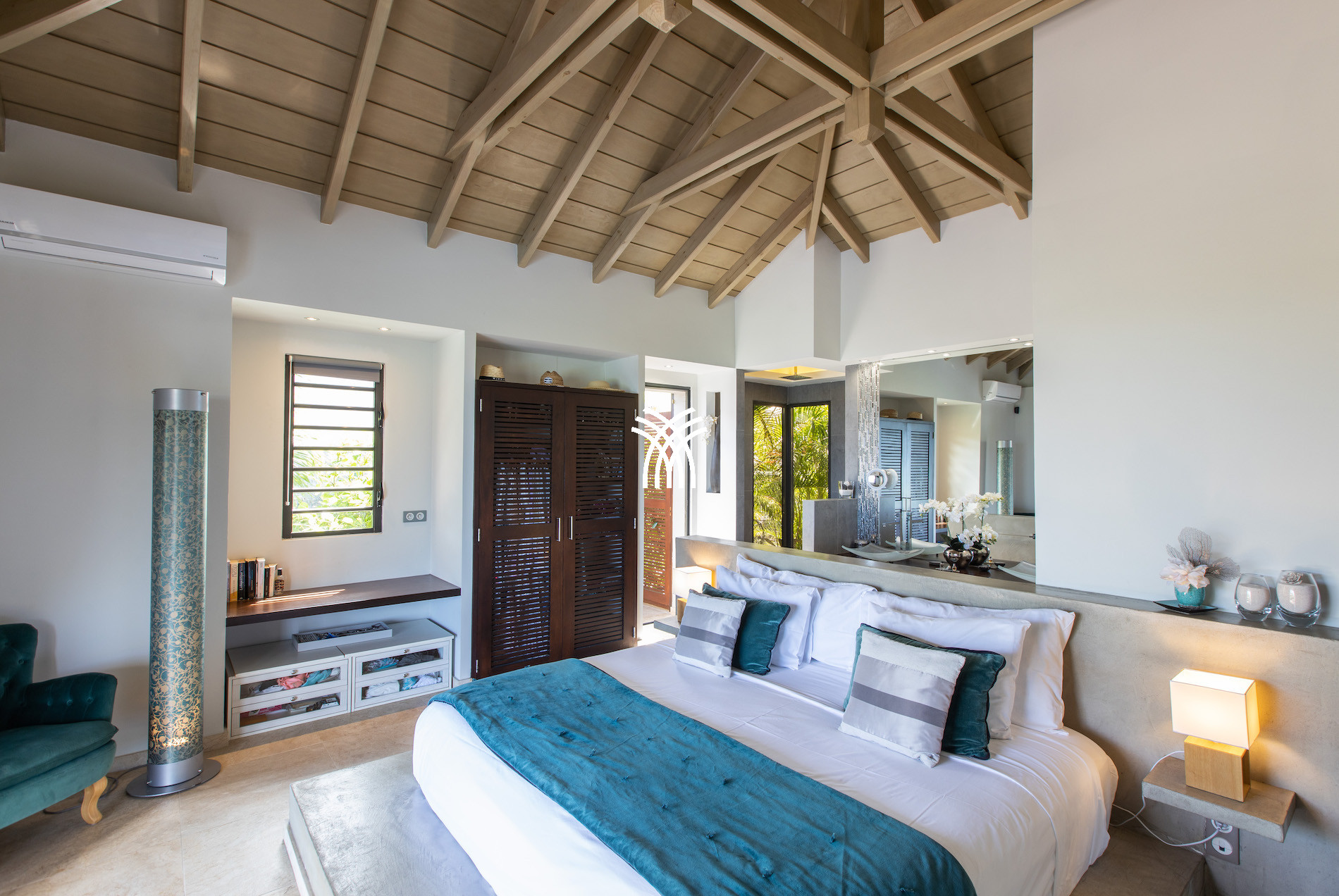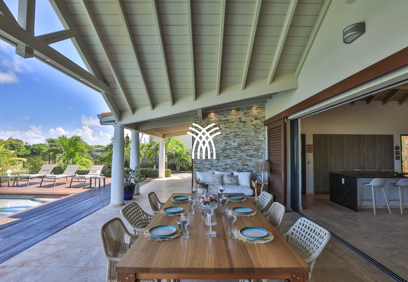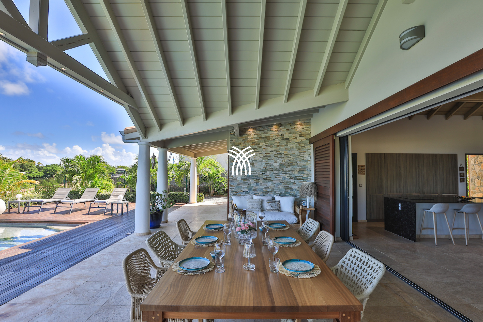 À l'extérieur, la terrasse en bois de la piscine vous invite à vous détendre en toute intimité. Profitez du soleil caribéen ou trouvez de l'ombre sous les parasols tout en admirant la vue imprenable sur les eaux turquoises. La piscine élégante offre le lieu idéal pour se rafraîchir et s'imprégner de l'ambiance tropicale.