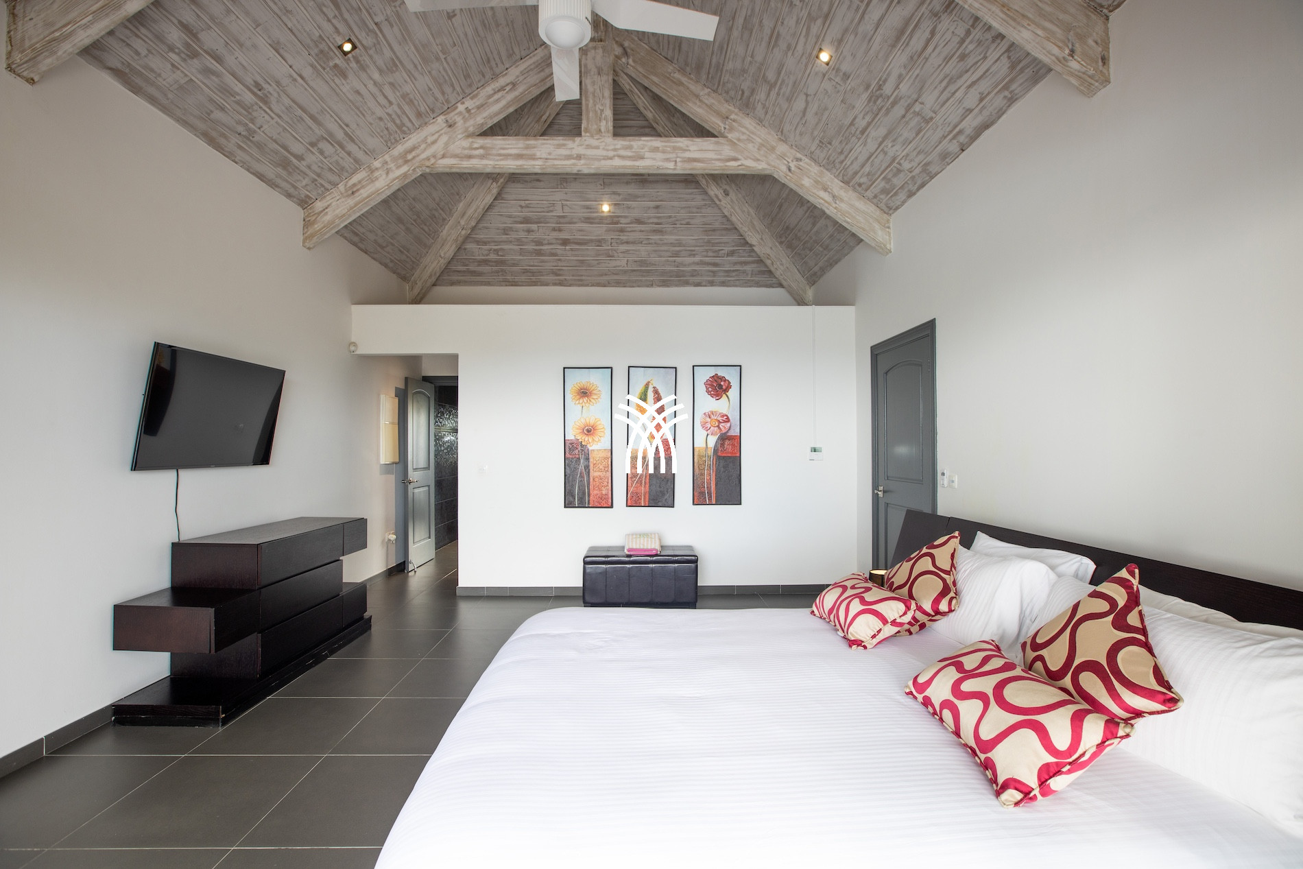 Villa Mango St Martin a 3 chambres principales dans la villa plus une quatrième chambre plus petite accessible depuis l’extérieur.