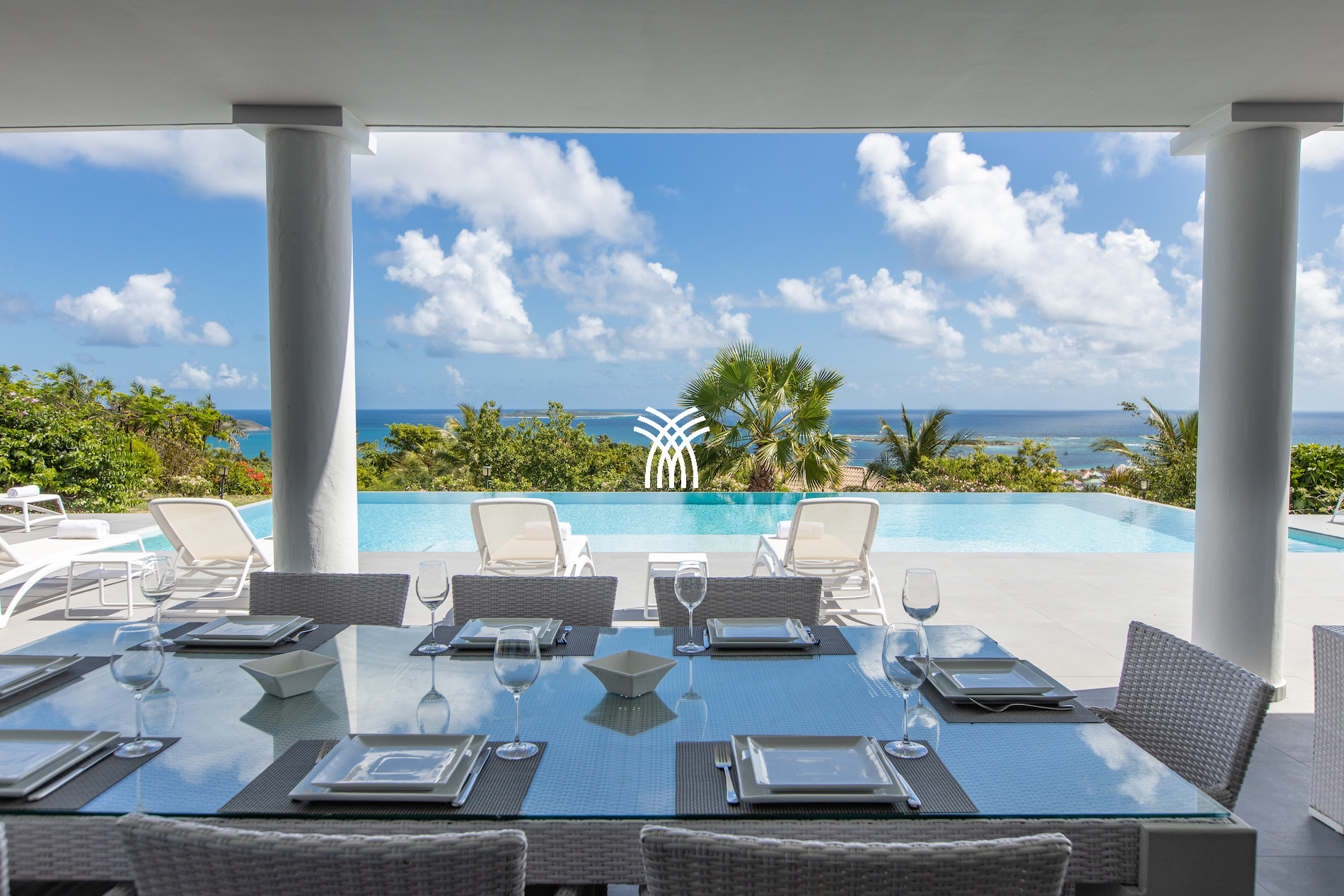 Idéalement situé dans la Baie Orientale, cette location de vacances luxe offre une vue magnifique sur la plage, l'océan, les ilets Pinel & Tintamarre et l'ile de St Barthélémy.