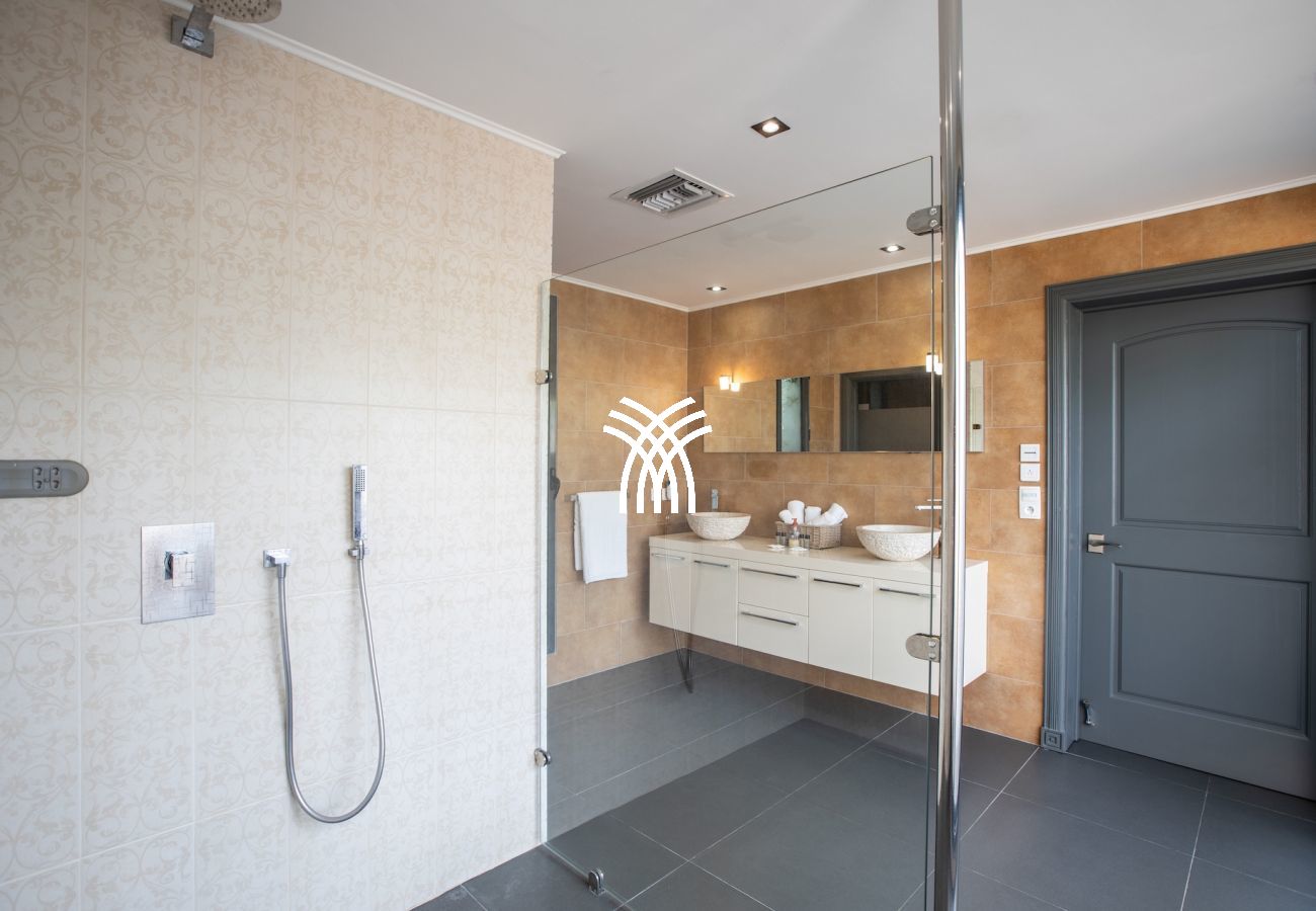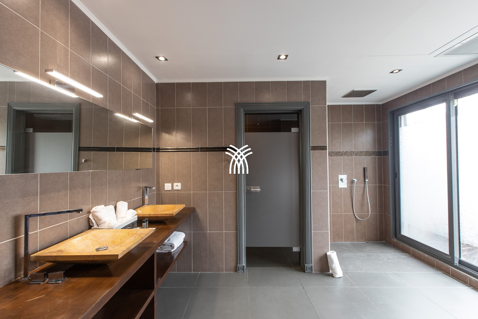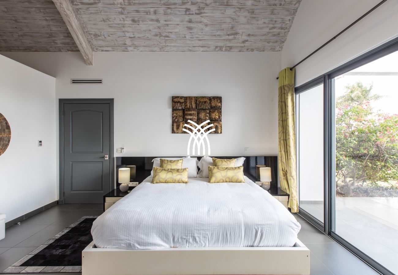 Le vaste salon, baigné de lumière naturelle, s’ouvre sur l’extérieur et la grande terrasse avec sa piscine à débordement. Cet espace de vie est idéal pour admirer les couchers de soleil ou partager un moment convivial en famille ou entre amis.