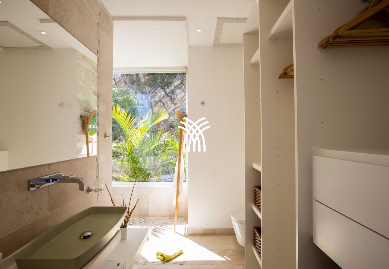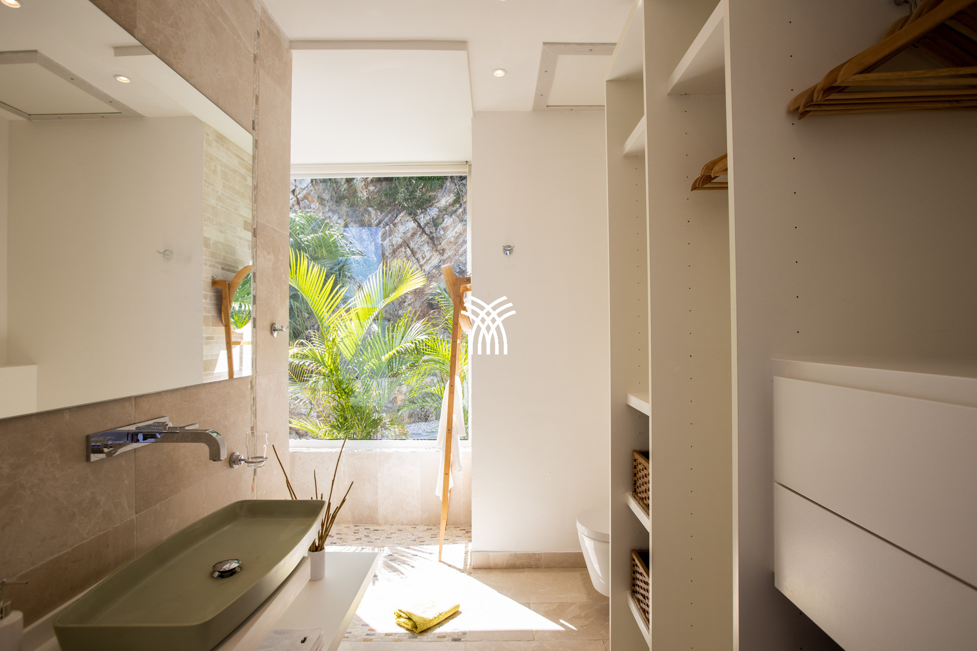 À l'extérieur, la terrasse en bois de la piscine vous invite à vous détendre en toute intimité. Profitez du soleil caribéen ou trouvez de l'ombre sous les parasols tout en admirant la vue imprenable sur les eaux turquoises. La piscine élégante offre le lieu idéal pour se rafraîchir et s'imprégner de l'ambiance tropicale.