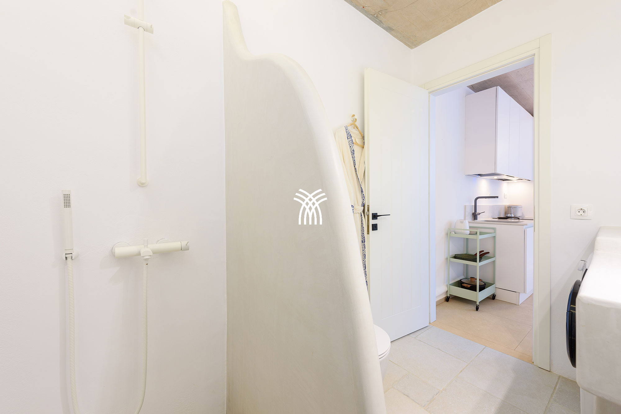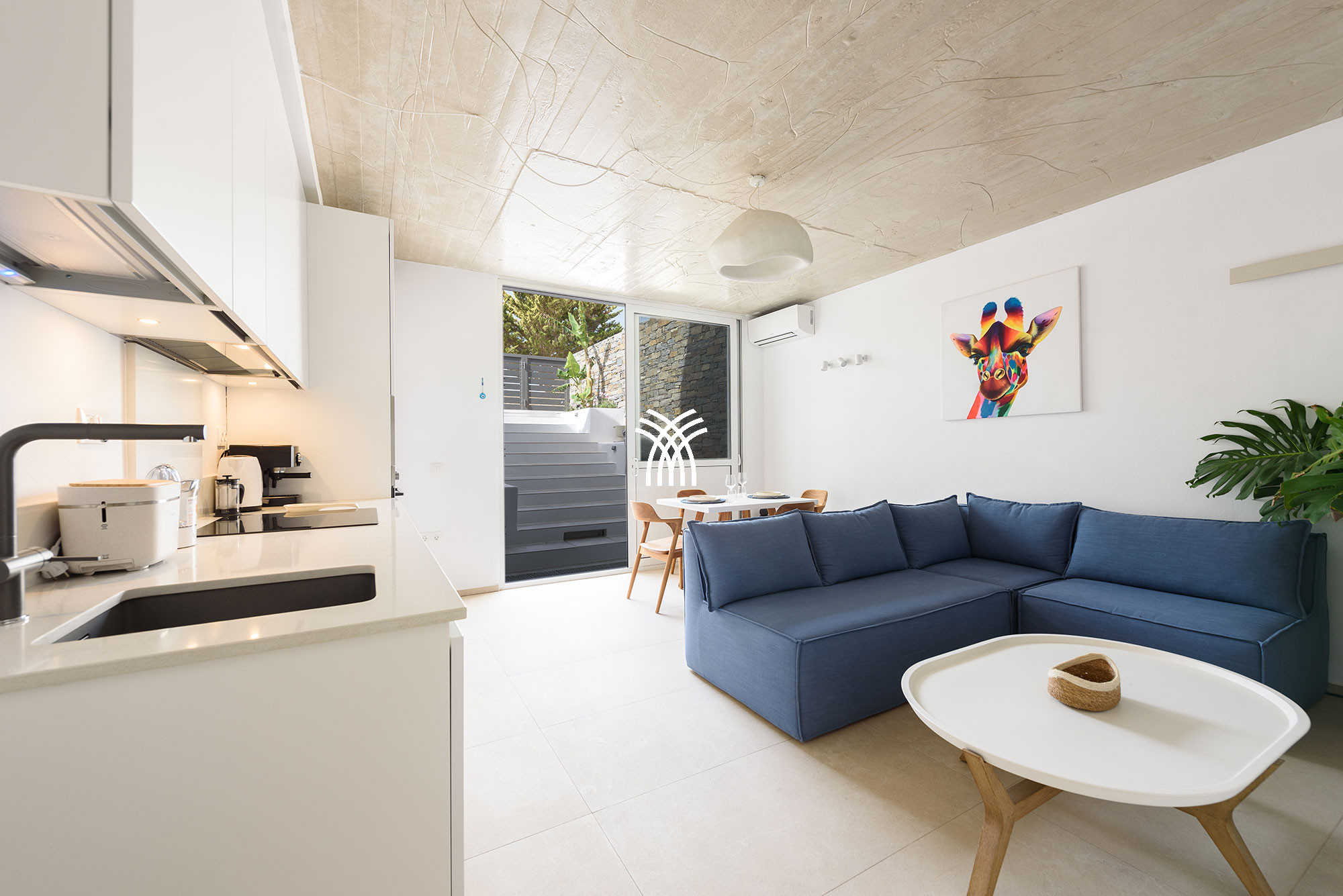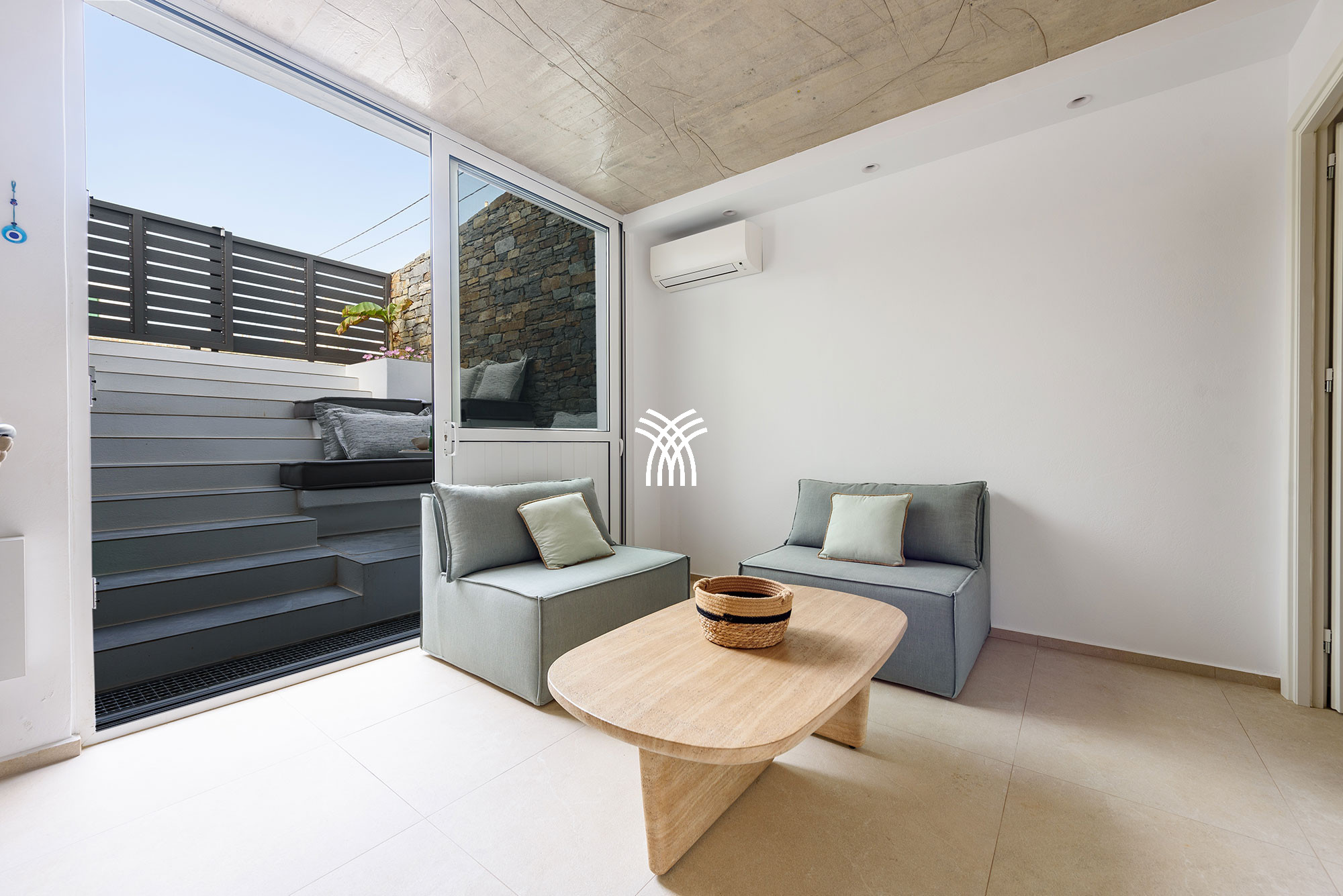 Une unité indépendante supplémentaire, connue sous le nom d'Akoya Pearl 2, est un appartement de 65 m² situé dans le sous-sol de la villa. Il est relié en interne par un escalier avec une double porte et un verrou pour garantir l'intimité et la séparation, et il est également accessible par un portail externe dédié près de l'entrée principale. Cet appartement comprend une cuisine entièrement équipée donnant sur un spacieux séjour et une salle à manger, un couloir menant à une petite réserve idéale pour les articles et accessoires de plage, et une chambre avec deux lits jumeaux qui peuvent être séparés, complétée par un canapé-lit convertible pour un troisième invité et une salle de bain privative.