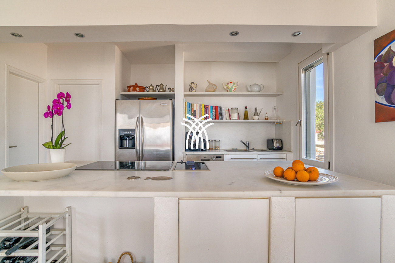 Six salles de bain modernes, certaines équipées de douches à l'italienne et de baignoires, rehaussent le sens de l'indulgence, avec des finitions raffinées et des équipements haut de gamme qui transforment les rituels quotidiens en moments de pur bien-être. À l'intérieur, de vastes espaces de vie ouverts créent un flux harmonieux entre détente et convivialité, où des intérieurs baignés de lumière, des fenêtres du sol au plafond et des ameublements élégants invitent les invités à embrasser le rythme de la vie insulaire. Le salon spacieux s'ouvre sur les jardins, tandis que la cuisine entièrement équipée, dotée d'appareils de première qualité et d'un îlot central, devient un point de rencontre naturel pour des expériences culinaires partagées. Les espaces de restauration intérieurs et extérieurs offrent le cadre parfait pour des repas conviviaux, à déguster soit dans la salle à manger intérieure raffinée, soit sous le ciel ouvert sur la terrasse, accompagnés par les douces brises marines et les nuits étoilées.
