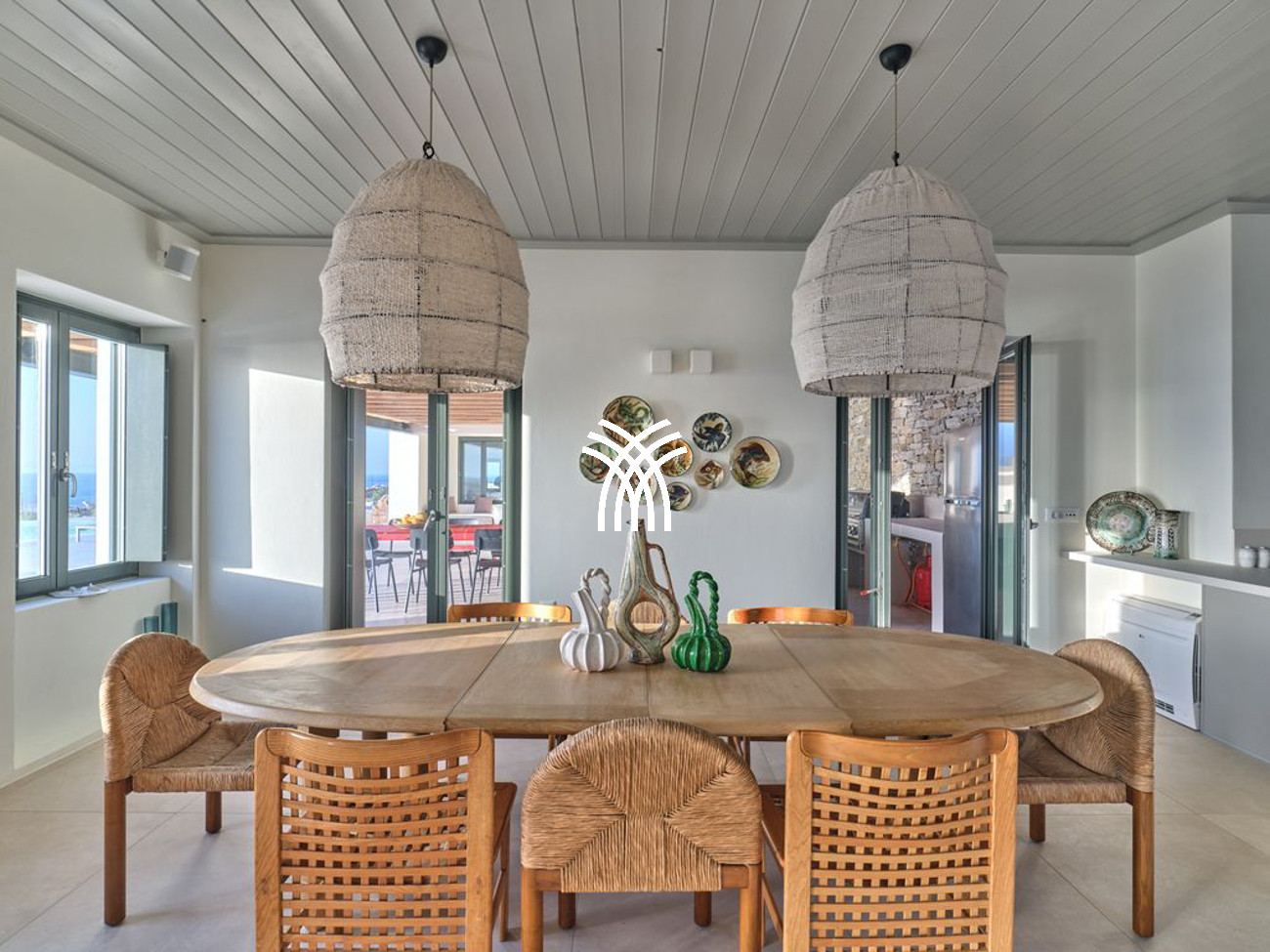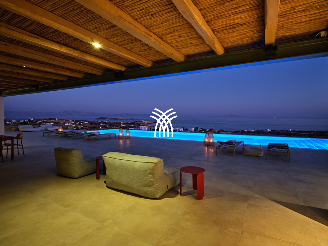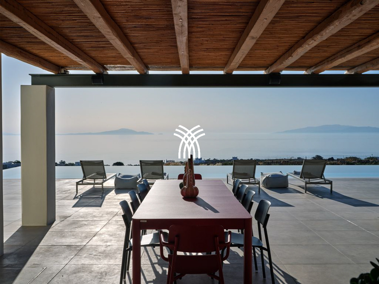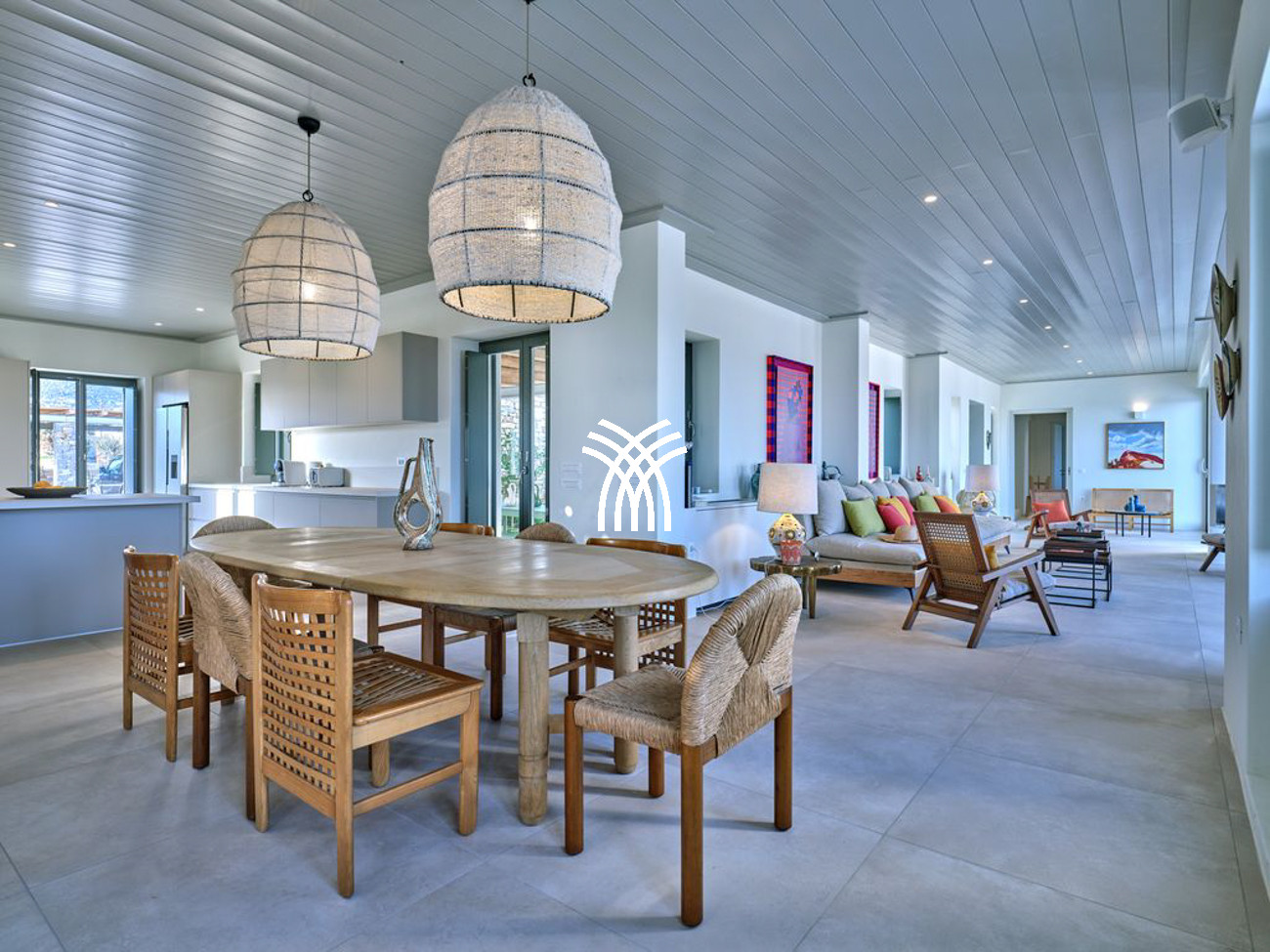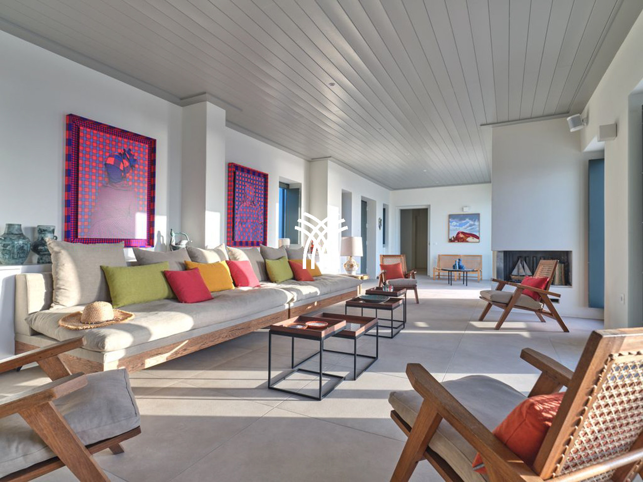 La vie en plein air est au cœur du style de vie de la villa, avec des terrasses expansives encadrant la mer et le côté du lever du soleil de l'île. Douze transats avec parasols invitent à de longues journées de détente, tandis qu'un bar équipé crée l'ambiance pour des cocktails raffinés et des apéritifs inoubliables. La piscine à débordement de 15 x 4 mètres semble se fondre avec l'horizon, offrant une connexion visuelle extraordinaire au paysage et un spectacle quotidien de lumière et de couleur. Des commodités pratiques telles qu'une buanderie avec machine à laver et sèche-linge, ainsi que des installations de repassage, assurent un confort absolu tout au long de votre séjour, tandis que l'accès complet à l'ensemble de la propriété garantit une intimité totale.