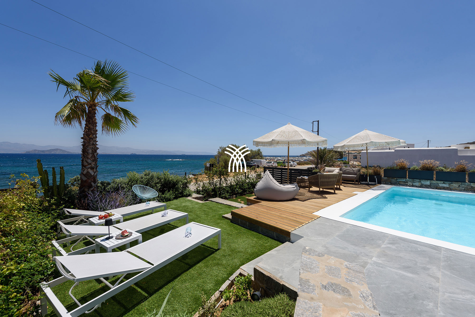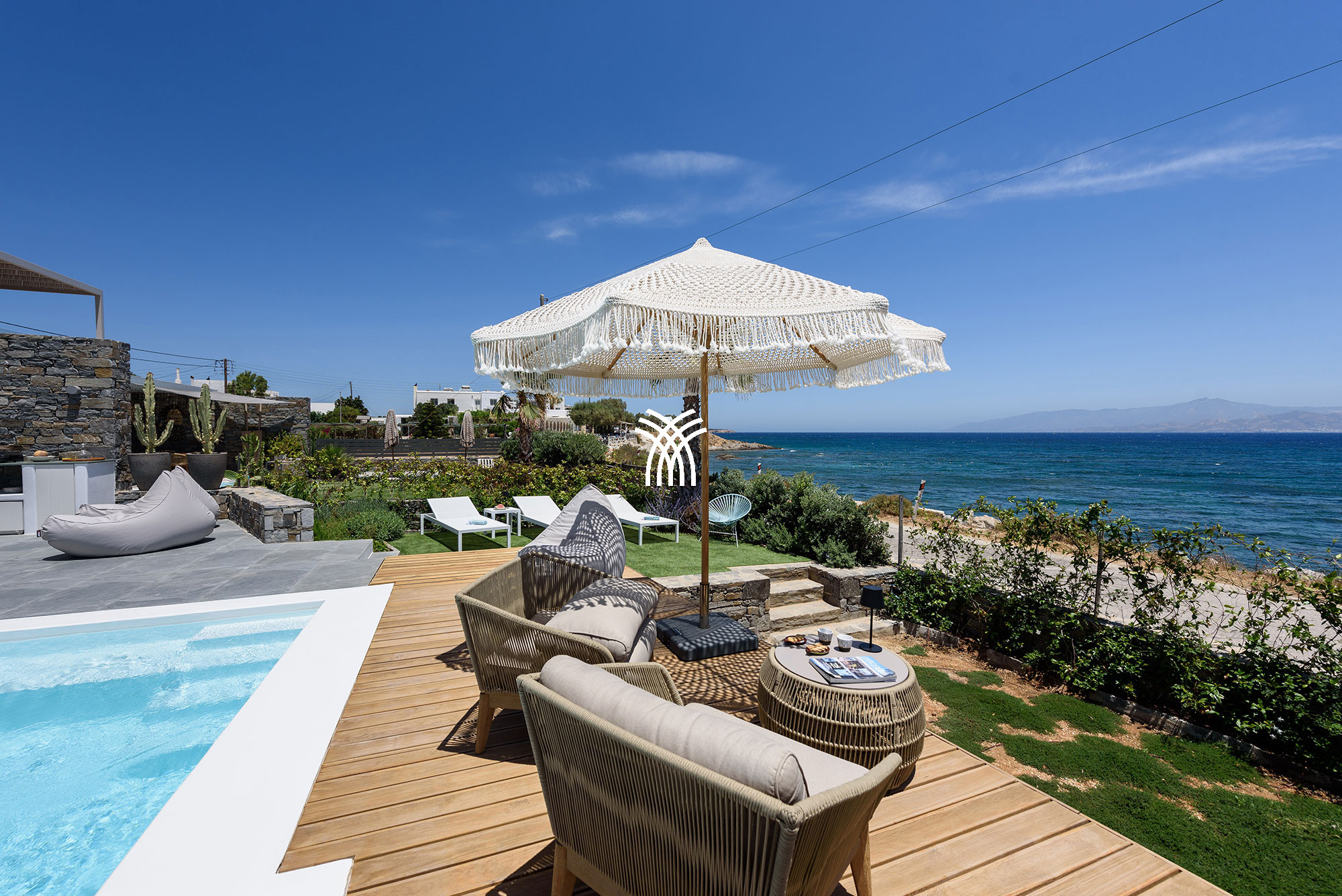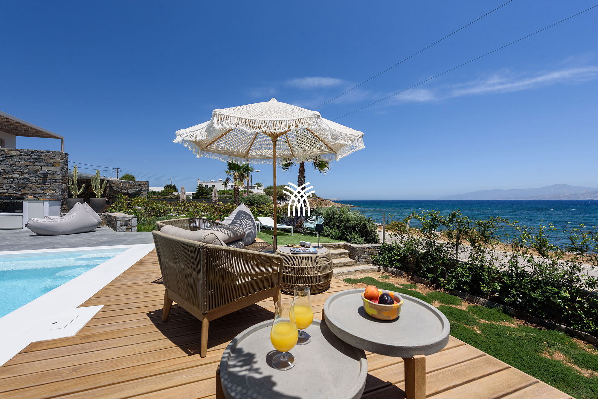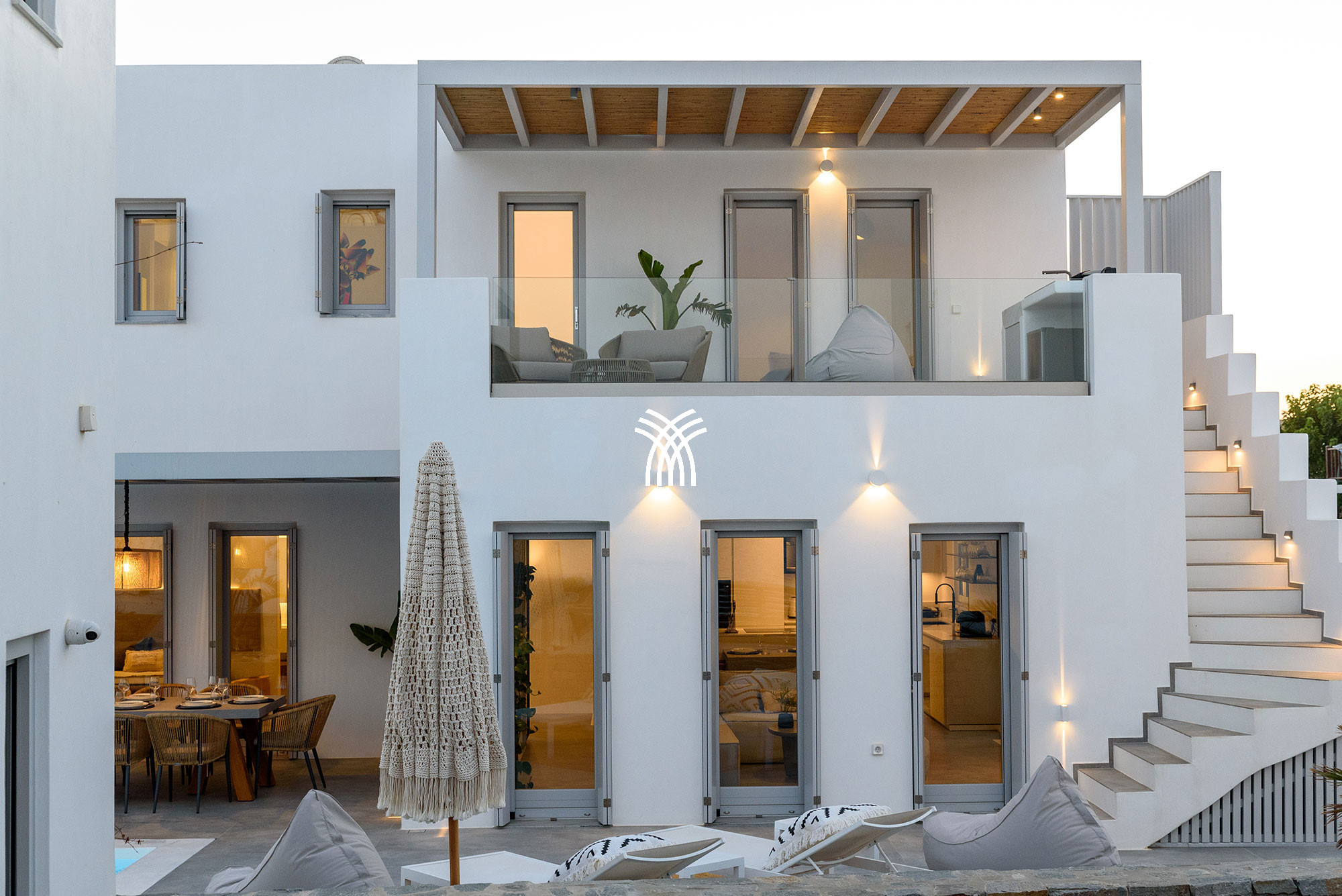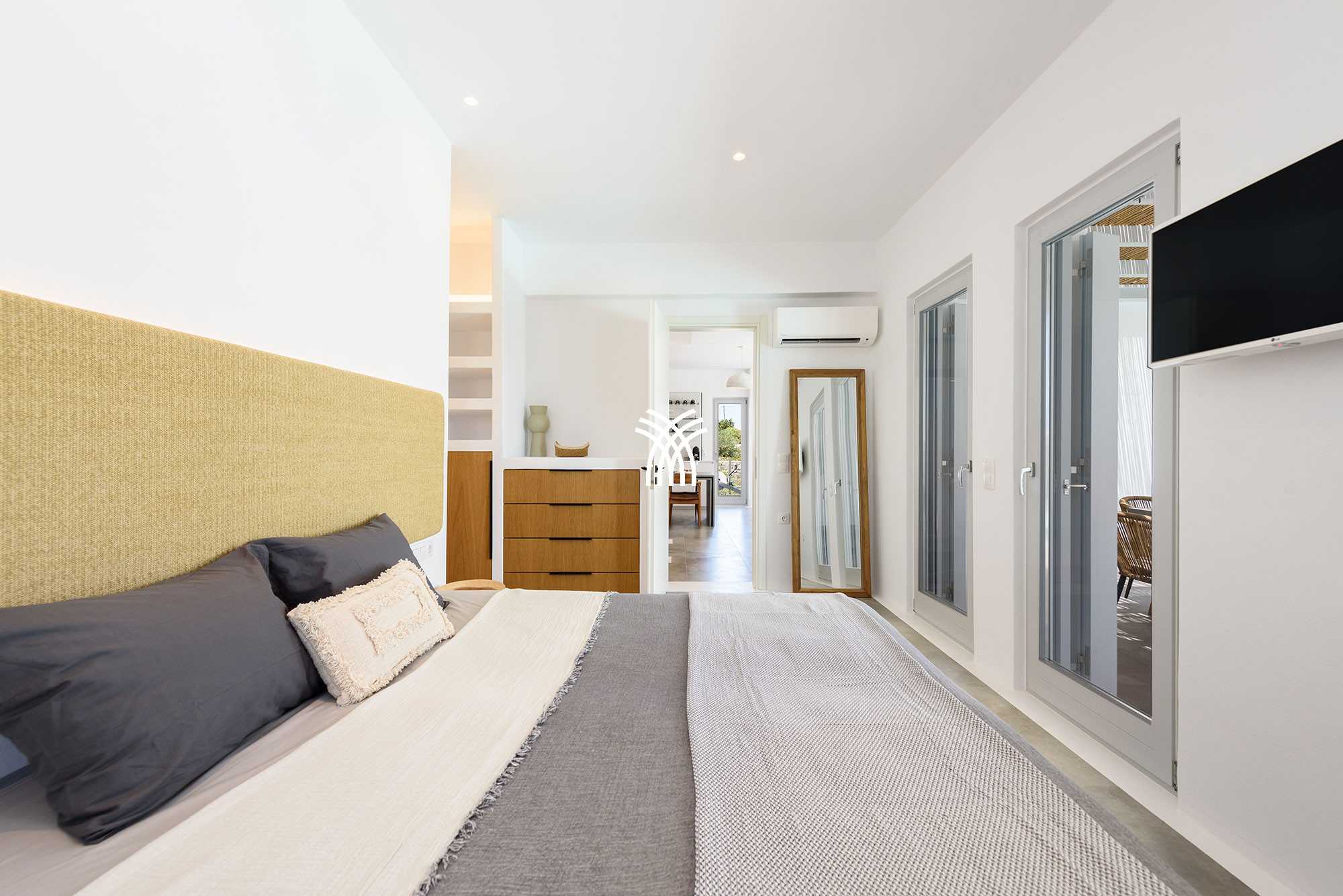 À l'intérieur, la villa mêle le charme traditionnel cycladique à un design contemporain, où une architecture lumineuse, des textures subtiles et des finitions modernes créent une ambiance chaleureuse et élégante qui se veut à la fois authentique et sophistiquée. Chaque espace est conçu pour favoriser la détente et le bien-être, invitant les invités à ralentir et à embrasser le rythme de la vie insulaire dans un environnement où chaque détail reflète un luxe discret.