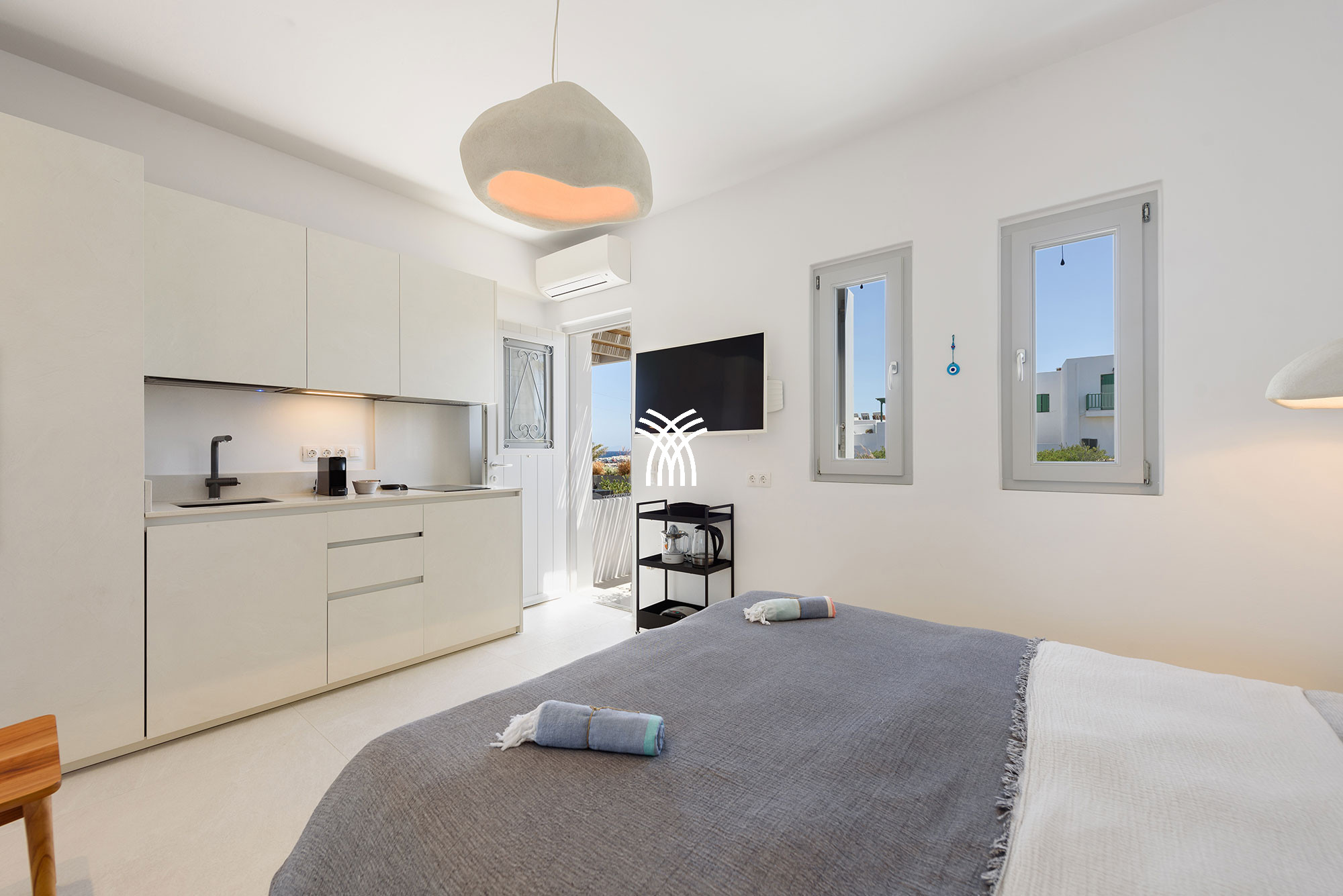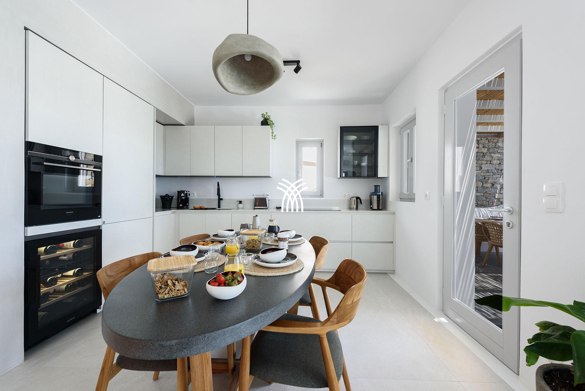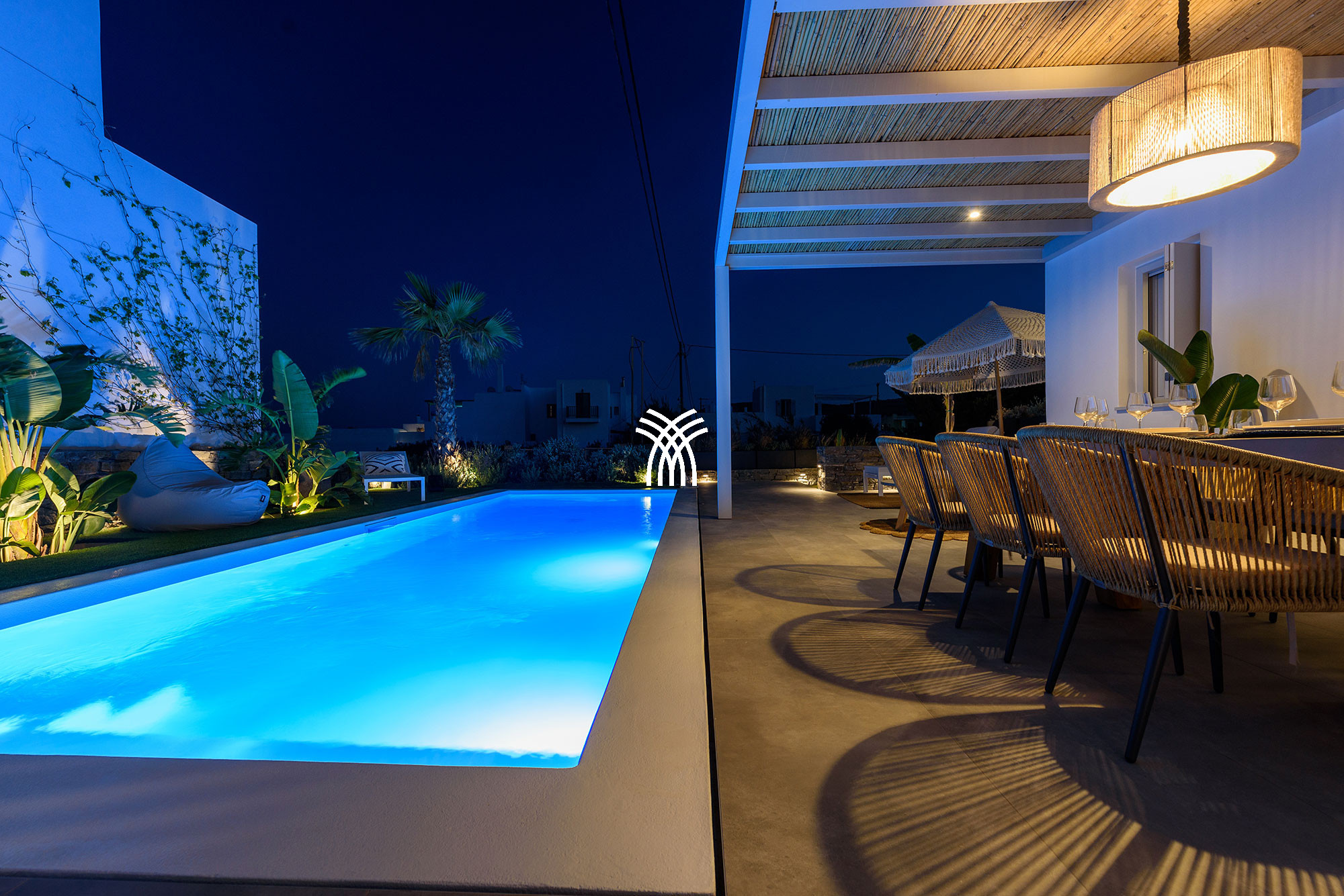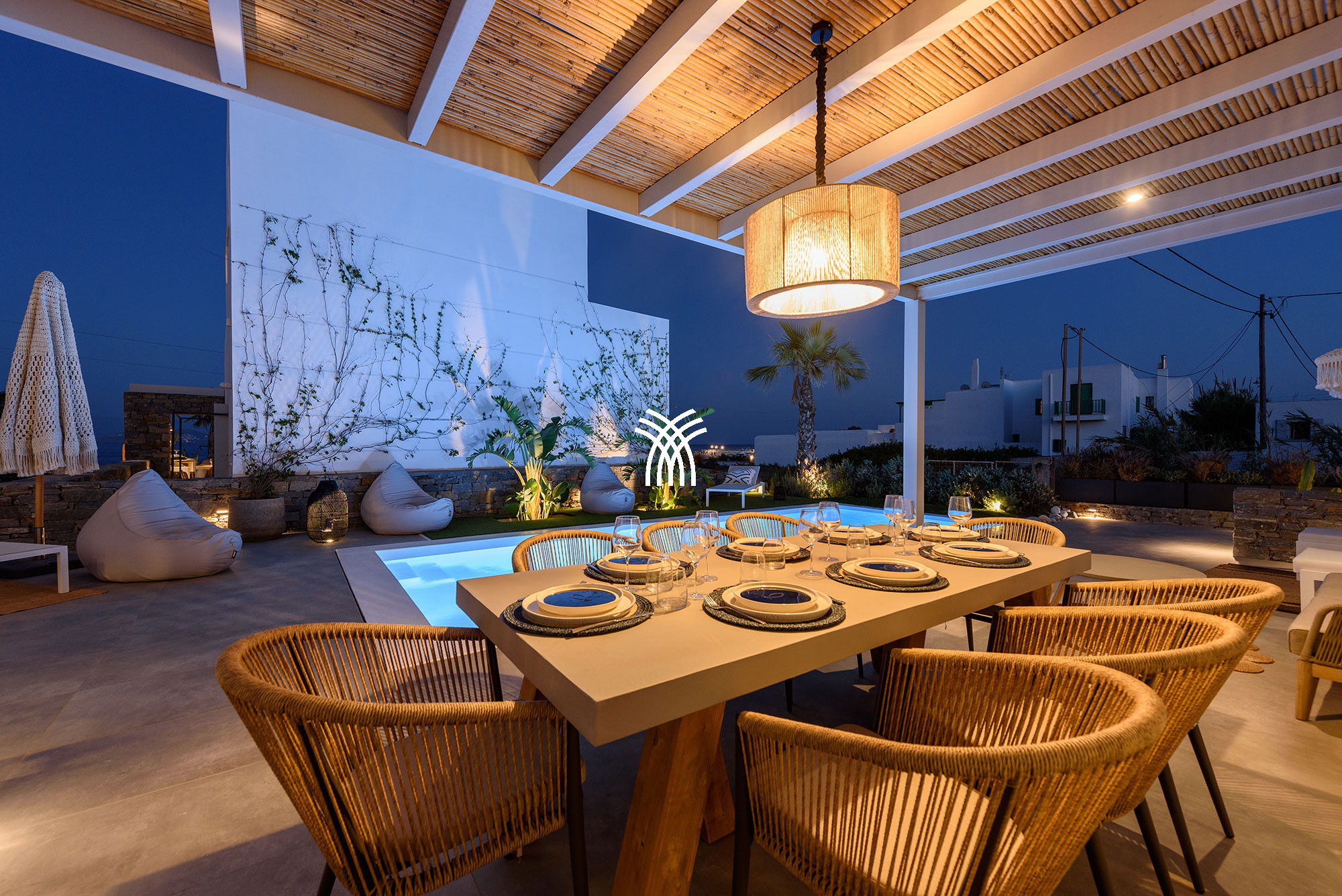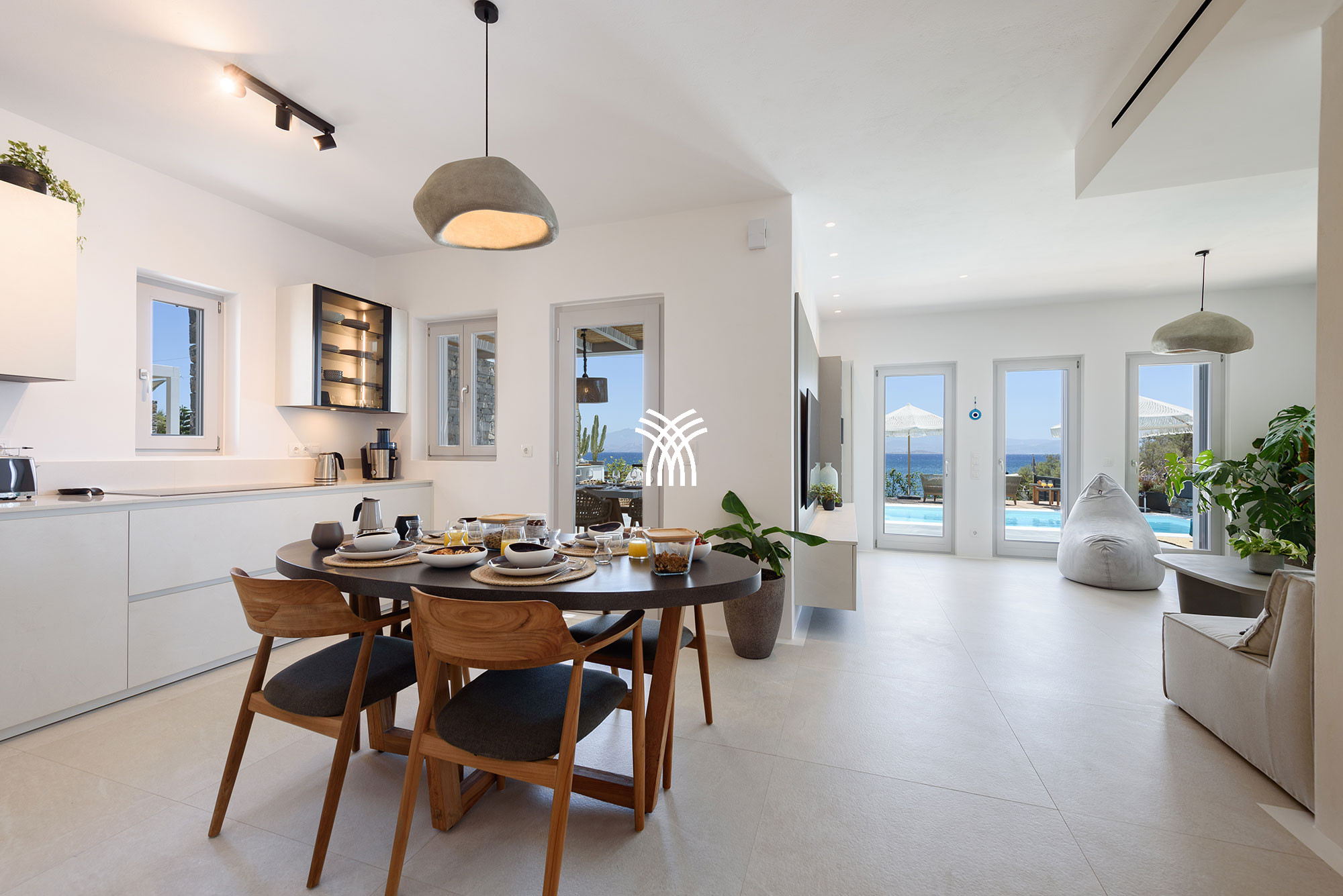 À l'intérieur, la villa mêle le charme traditionnel cycladique à un design contemporain, où une architecture lumineuse, des textures subtiles et des finitions modernes créent une ambiance chaleureuse et élégante qui se veut à la fois authentique et sophistiquée. Chaque espace est conçu pour favoriser la détente et le bien-être, invitant les invités à ralentir et à embrasser le rythme de la vie insulaire dans un environnement où chaque détail reflète un luxe discret.