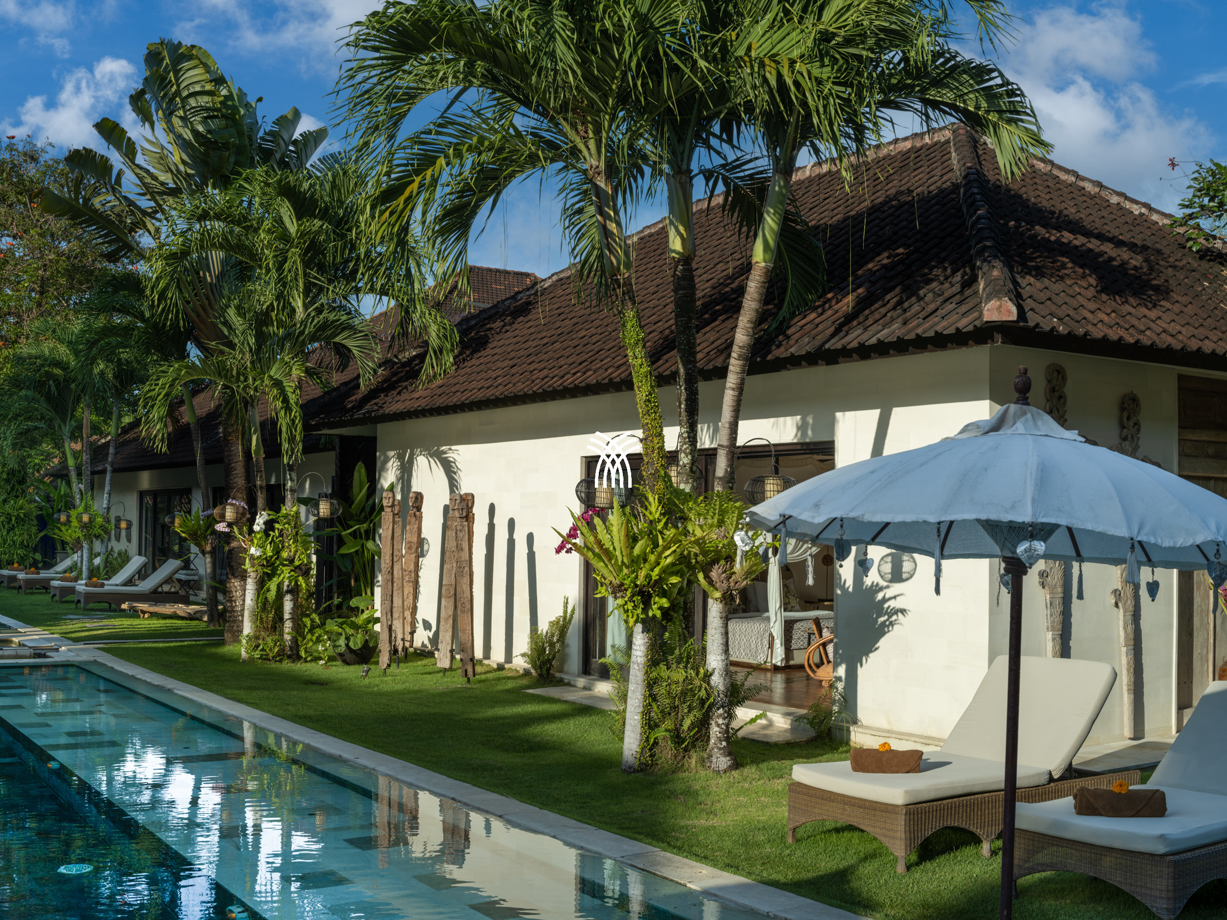 La propriété révèle un paysage aquatique extraordinaire, comprenant pas moins de quatre piscines immaculées d'une longueur de 13 à 18 mètres. Sur une remarquable étendue de 65 mètres d'eau, chaque piscine invite à l'indulgence avec de généreuses zones peu profondes conçues pour bronzer dans l'eau, tandis que des parasols balinais traditionnels 'Payung' créent des sanctuaires ombragés directement dans les piscines. L'eau maintient une température parfaitement équilibrée même après le coucher du soleil, renforçant le sentiment de confort et de raffinement, ce qui en fait un cadre idyllique tant pour les familles que pour les voyageurs les plus exigeants.