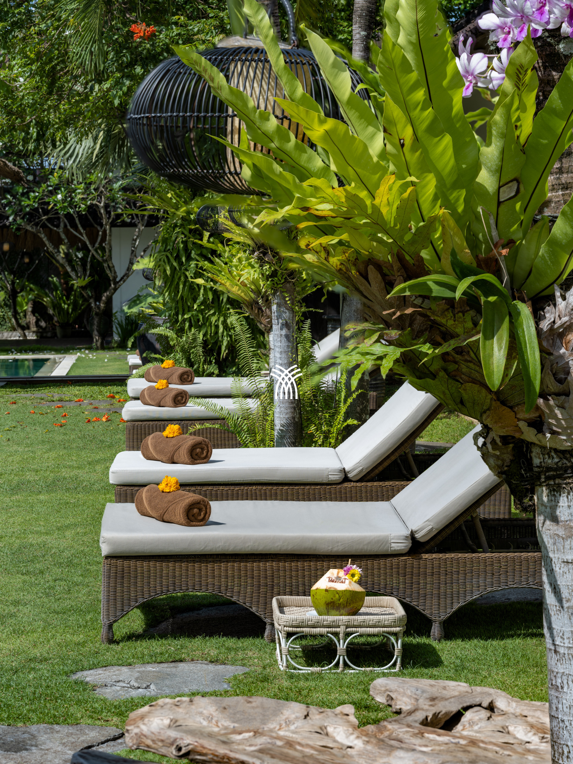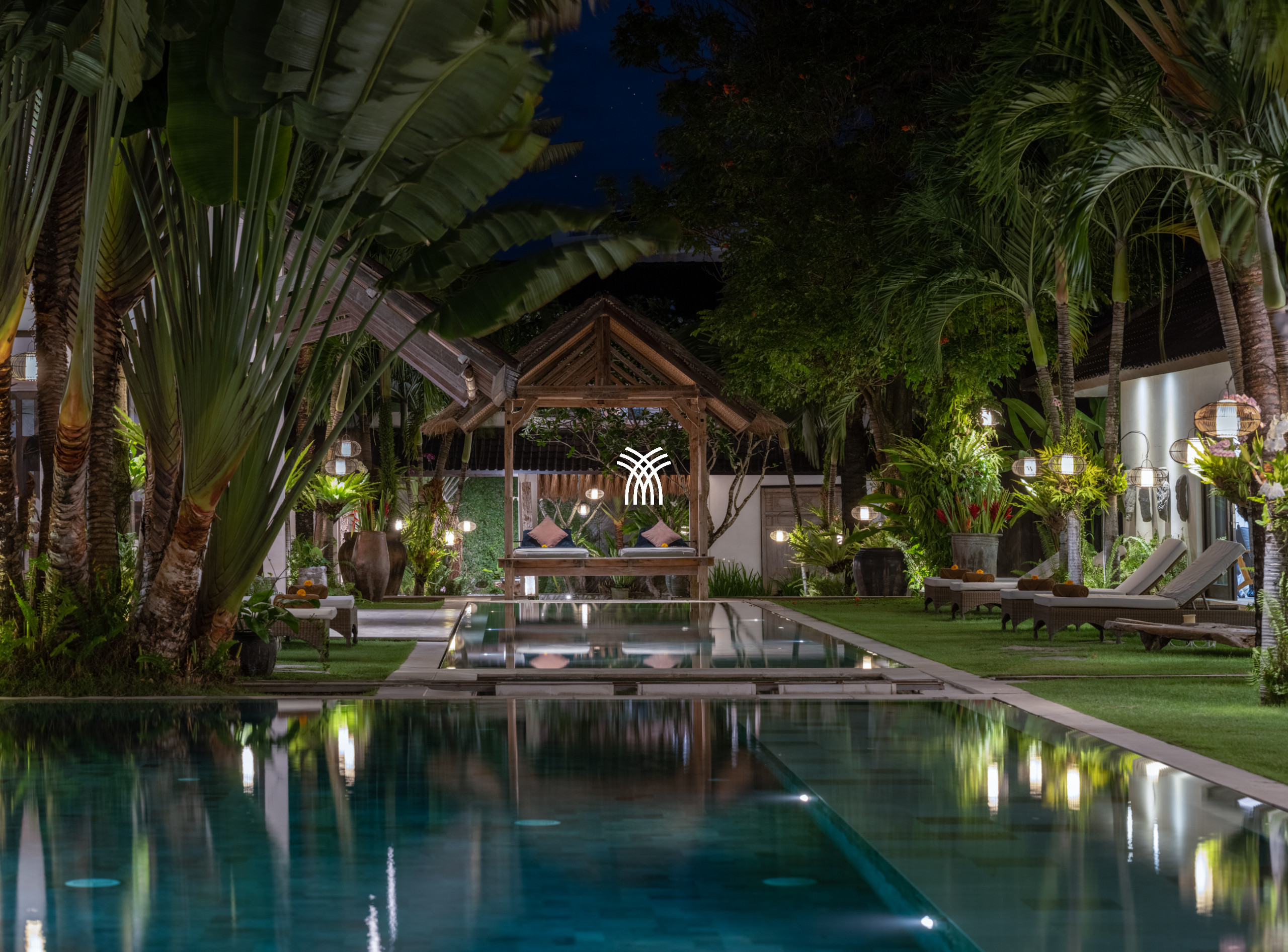 En extérieur, un jardin tropical luxuriant se déploie autour d'une piscine à débordement spectaculaire de 12 mètres, véritable point focal de la Villa Amantara. Ce cadre serein invite à des baignades paisibles, des après-midis ensoleillés ou des moments de tranquillité avec un livre, le tout encadré par la beauté naturelle de Bali.