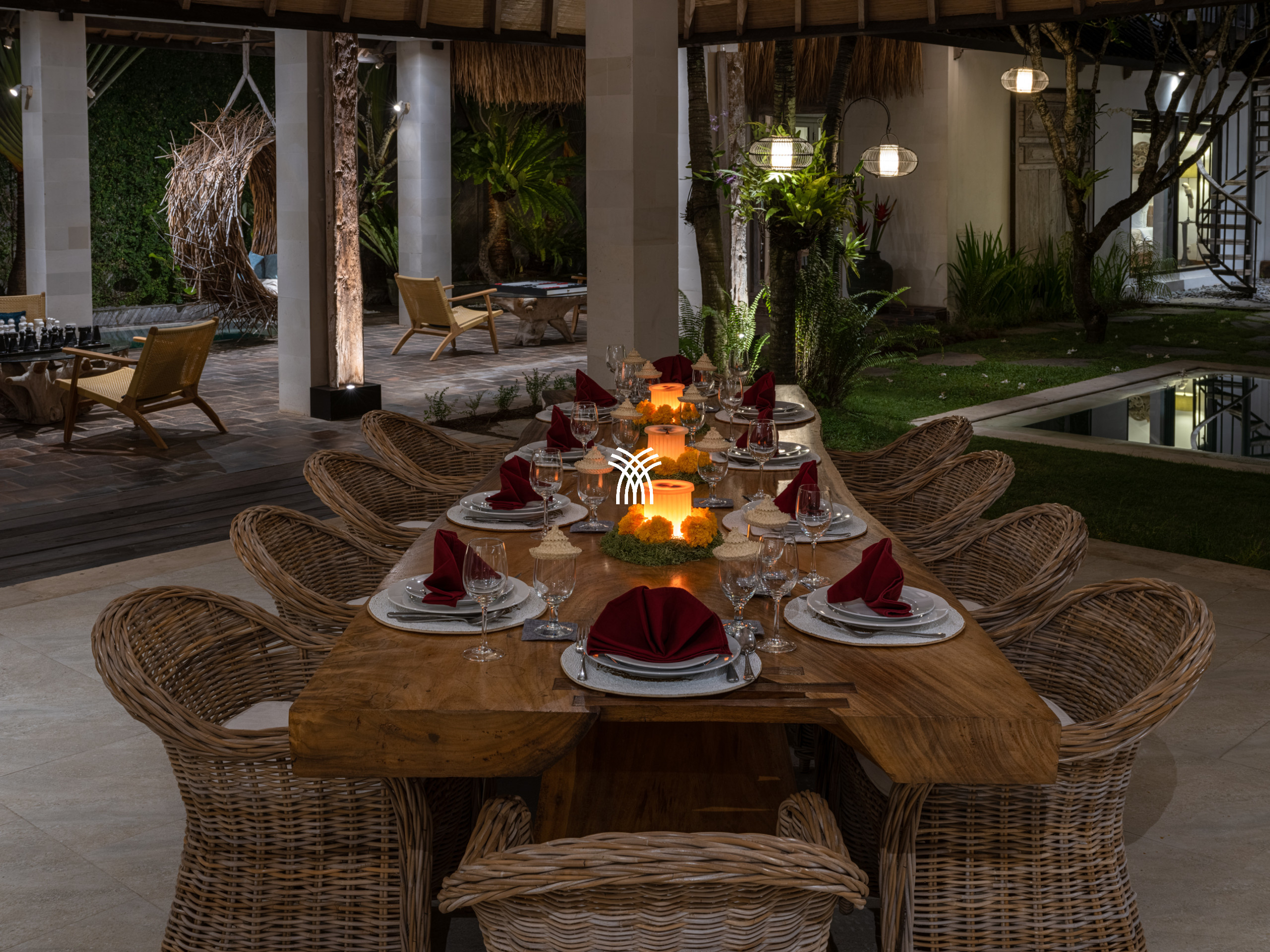 Pour ceux qui préfèrent se délecter sans effort, un chef à domicile est disponible pour créer des expériences culinaires exceptionnelles, allant de la cuisine traditionnelle balinaise aux déjeuners barbecue décontractés, savourés dans le confort de la villa. Un espace privé dédié aux événements ou au yoga ajoute une dimension supplémentaire de polyvalence, faisant de la villa un lieu idéal pour des rassemblements intimes, des retraites de bien-être ou des célébrations significatives.