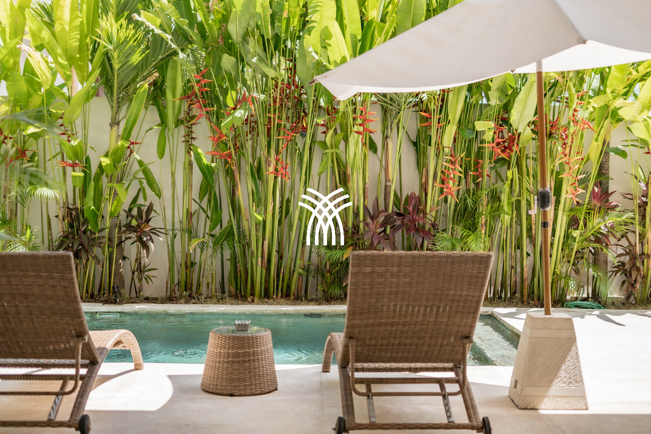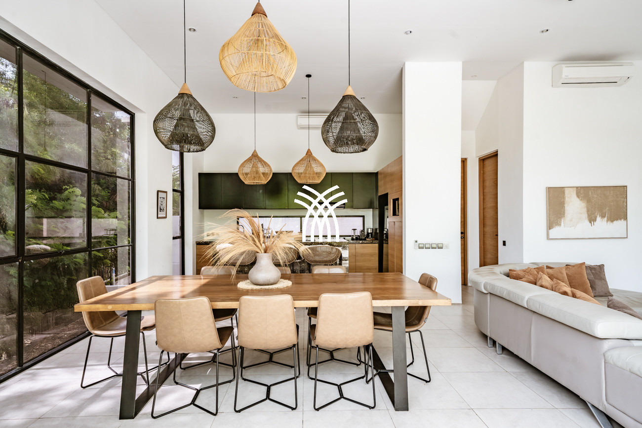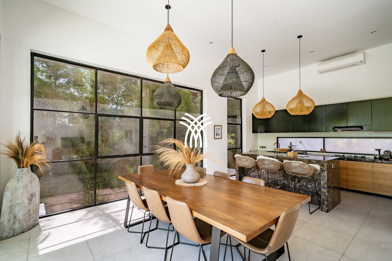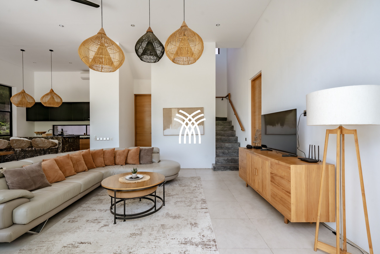 L'espace de vie ouvert se fond harmonieusement dans un jardin tropical luxuriant, où une piscine privée devient le point focal d'un cadre extérieur tranquille. Cette conception intérieure-extérieure harmonieuse invite à des matinées détendues, des après-midis ensoleillés et des soirées paisibles dans une atmosphère à la fois raffinée et accueillante.
