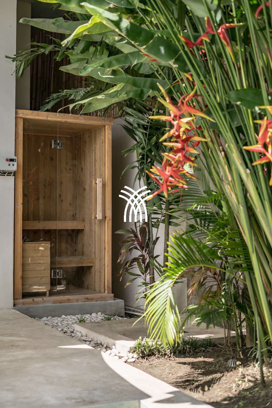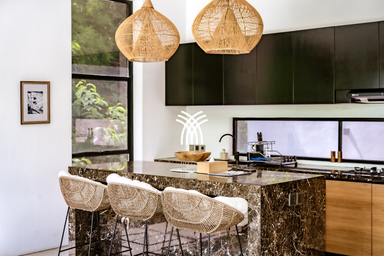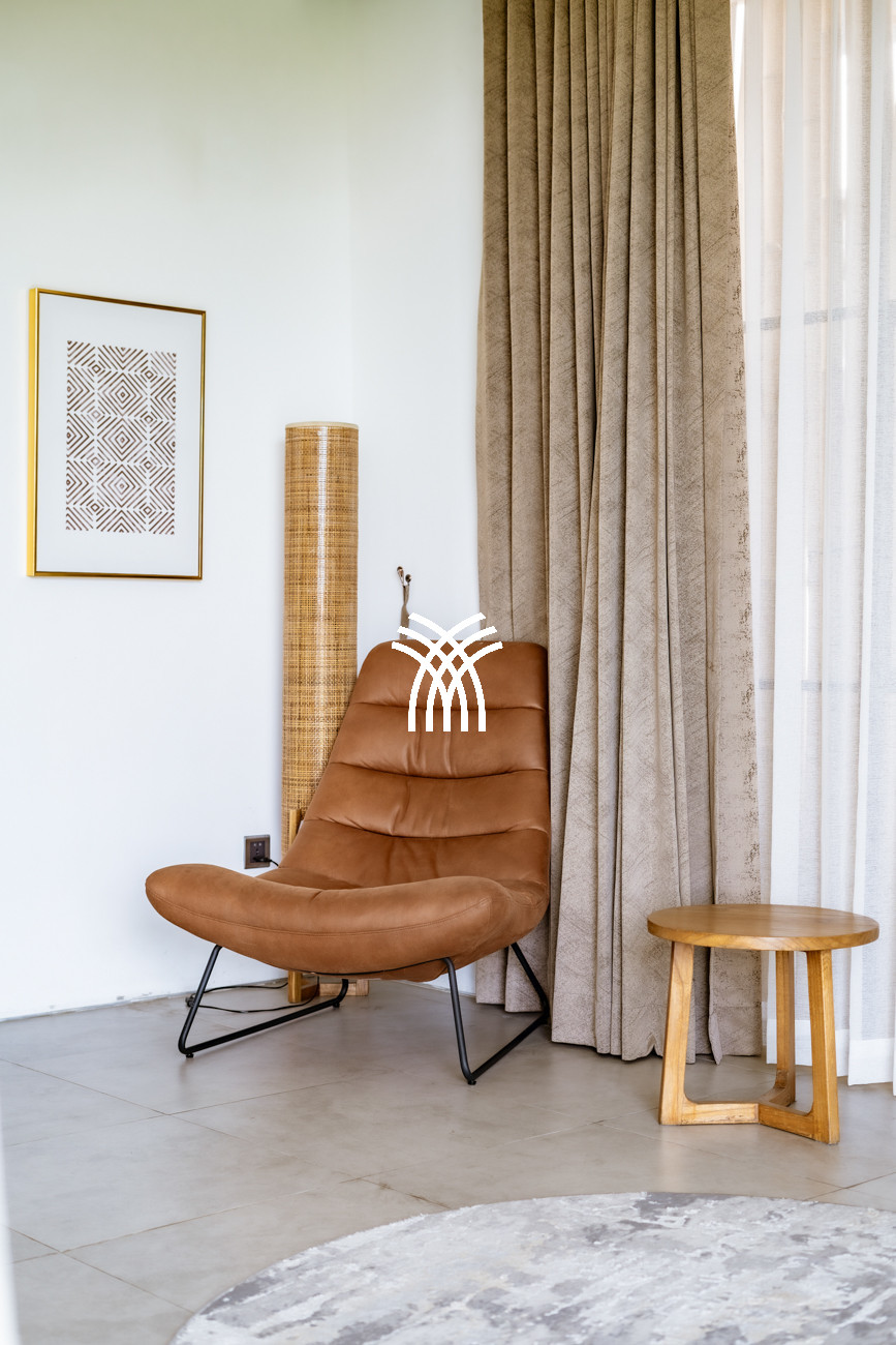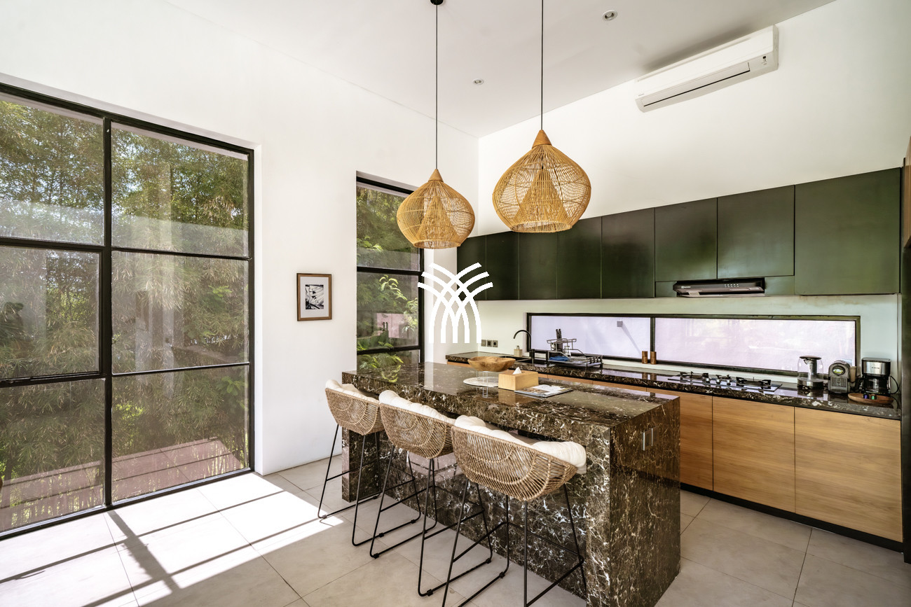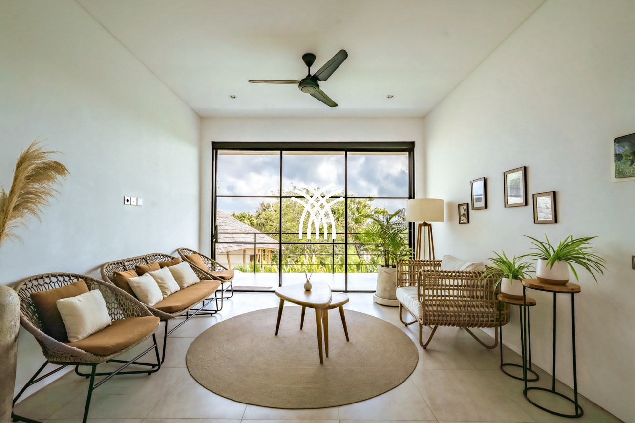 L'espace de vie ouvert se fond harmonieusement dans un jardin tropical luxuriant, où une piscine privée devient le point focal d'un cadre extérieur tranquille. Cette conception intérieure-extérieure harmonieuse invite à des matinées détendues, des après-midis ensoleillés et des soirées paisibles dans une atmosphère à la fois raffinée et accueillante.