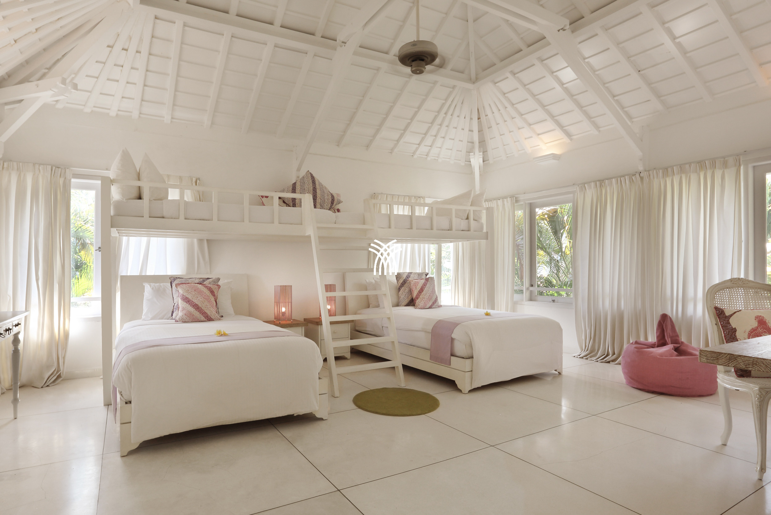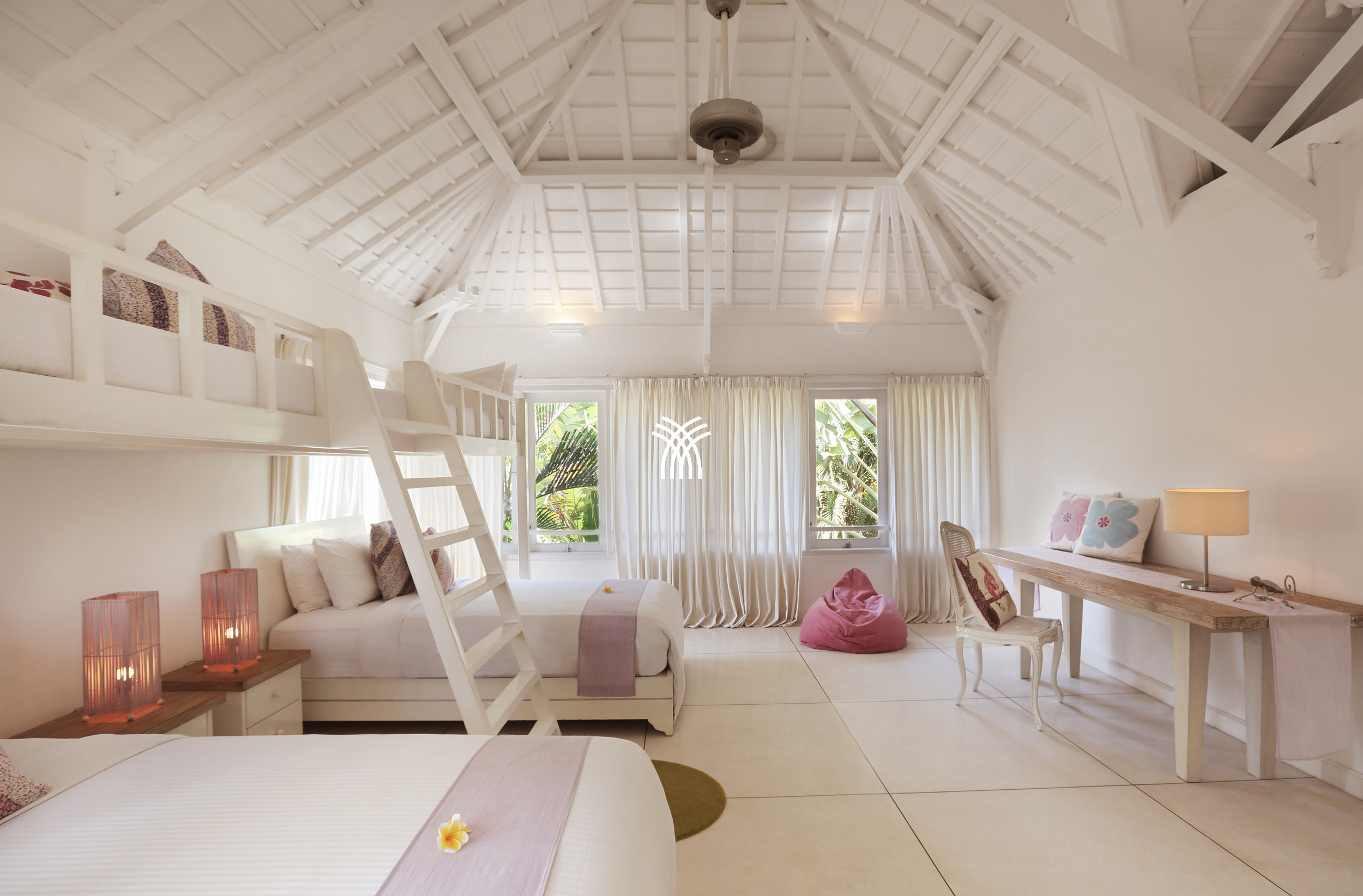 La villa dispose de quatre chambres spacieuses ainsi qu'une chambre de style dortoir dédiée aux enfants, créant un environnement adapté aux familles sans compromettre le style ou le confort. Chaque chambre est équipée de la climatisation et d'une salle de bain privative, garantissant un sentiment de confidentialité et de bien-être pour chaque invité. L'espace de vie ouvert se fond harmonieusement dans le jardin, inondant l'espace de lumière naturelle et créant un cadre accueillant pour la détente et les moments partagés.