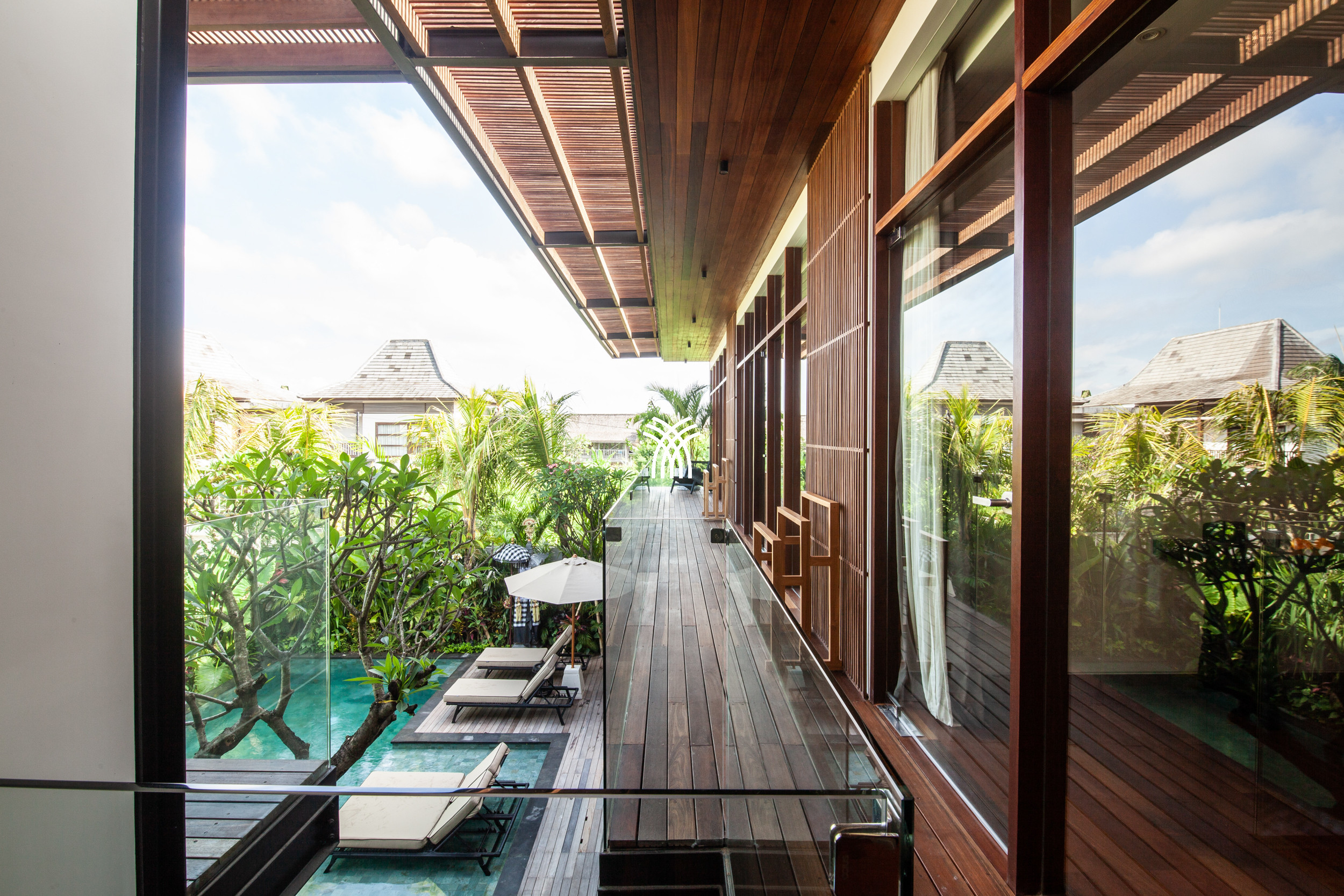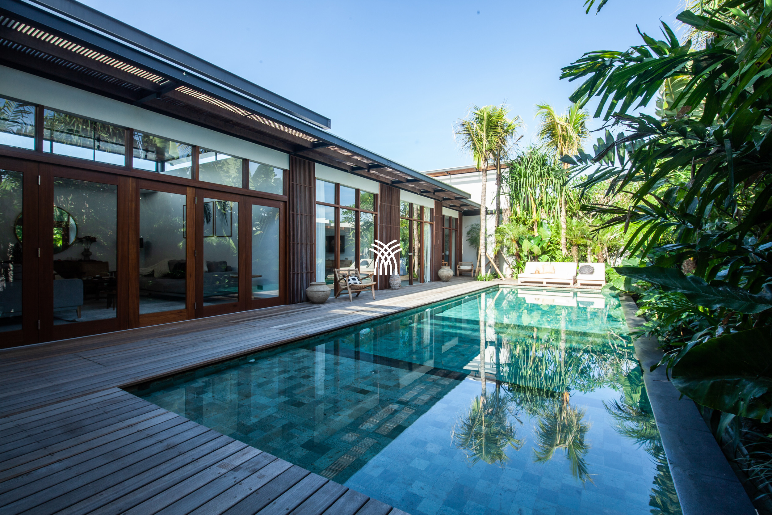 Au centre de la propriété, une longue piscine privée s'étend à travers l'espace extérieur, accompagnée d'une zone de restauration barbecue dédiée et de sièges de type pouf qui invitent à des après-midis de détente et des soirées intimes sous le ciel de Bali. Un pont Art déco signature mène avec élégance à la chambre principale, ajoutant une touche architecturale unique qui rehausse le caractère et le charme de la villa.