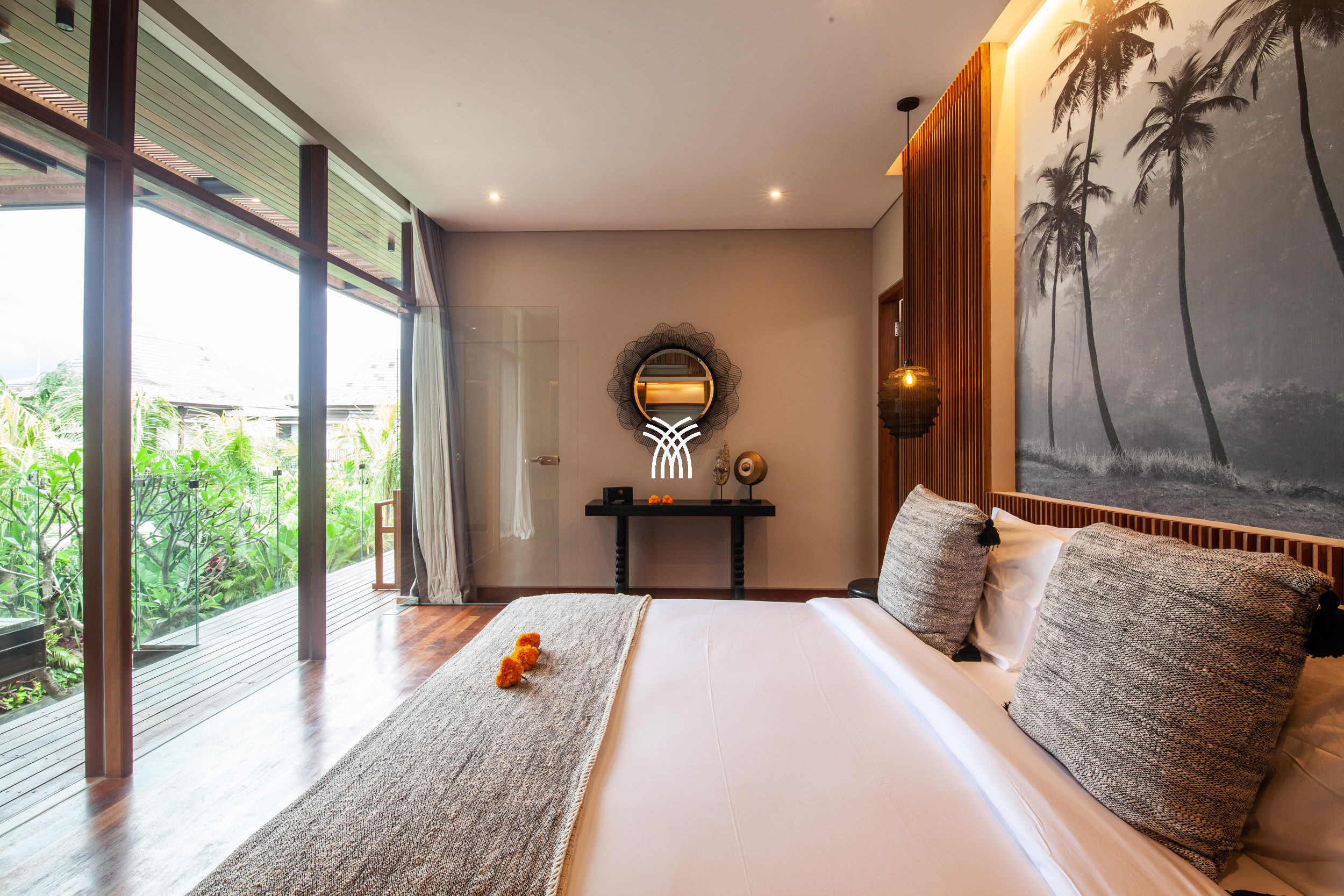 Chacune des six chambres est soigneusement aménagée avec la climatisation et une salle de bain attenante, garantissant l'intimité et le confort de chaque invité. Les suites principales s'ouvrent directement sur la piscine et le jardin, renforçant la connexion avec l'environnement luxuriant de la villa, tandis que les autres chambres offrent une ambiance chaleureuse et contemporaine conçue pour des séjours reposants.