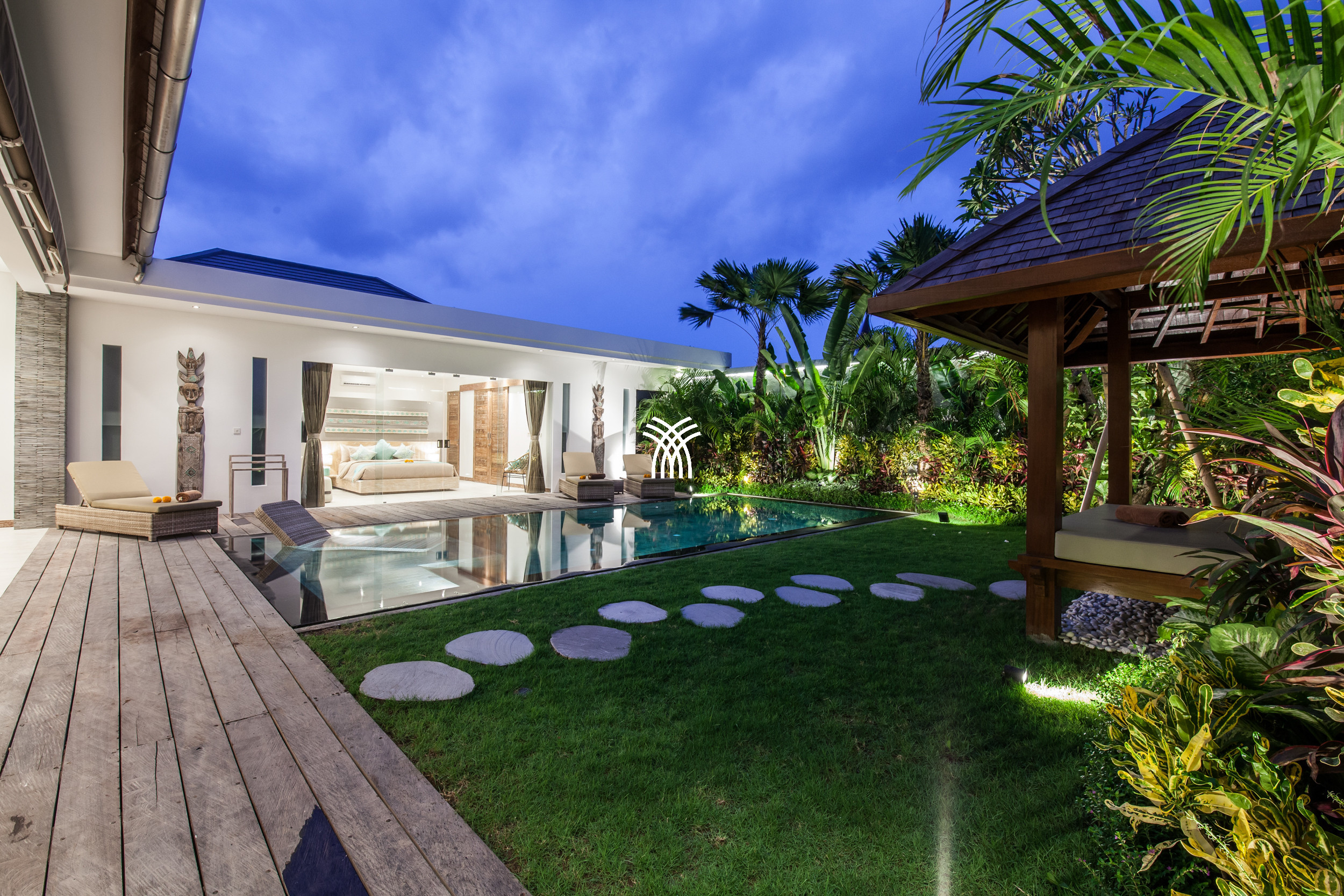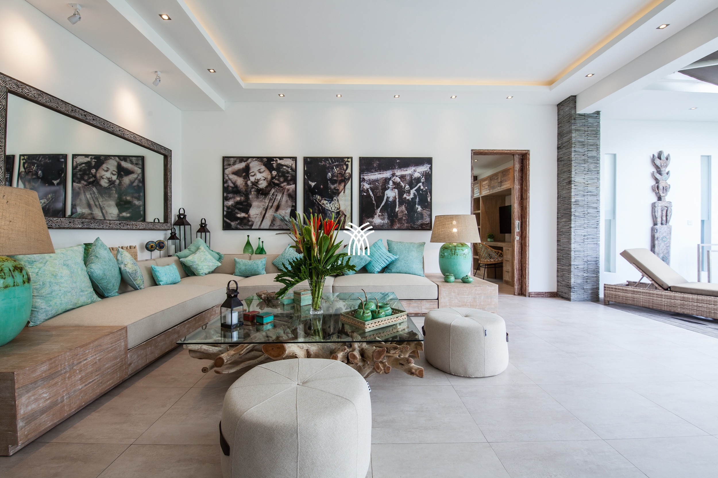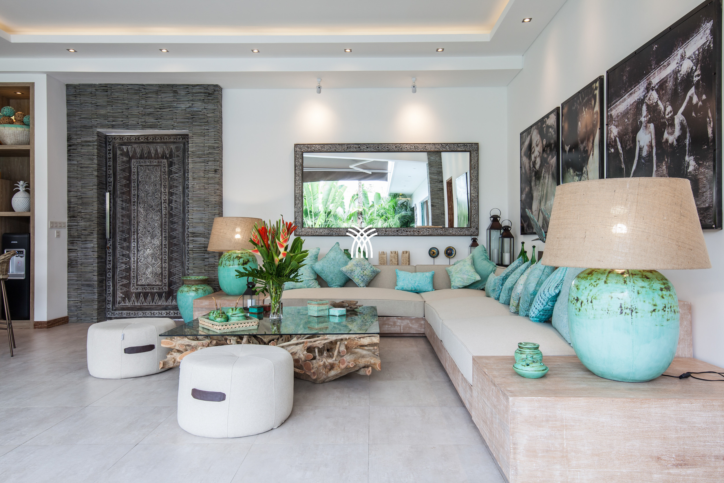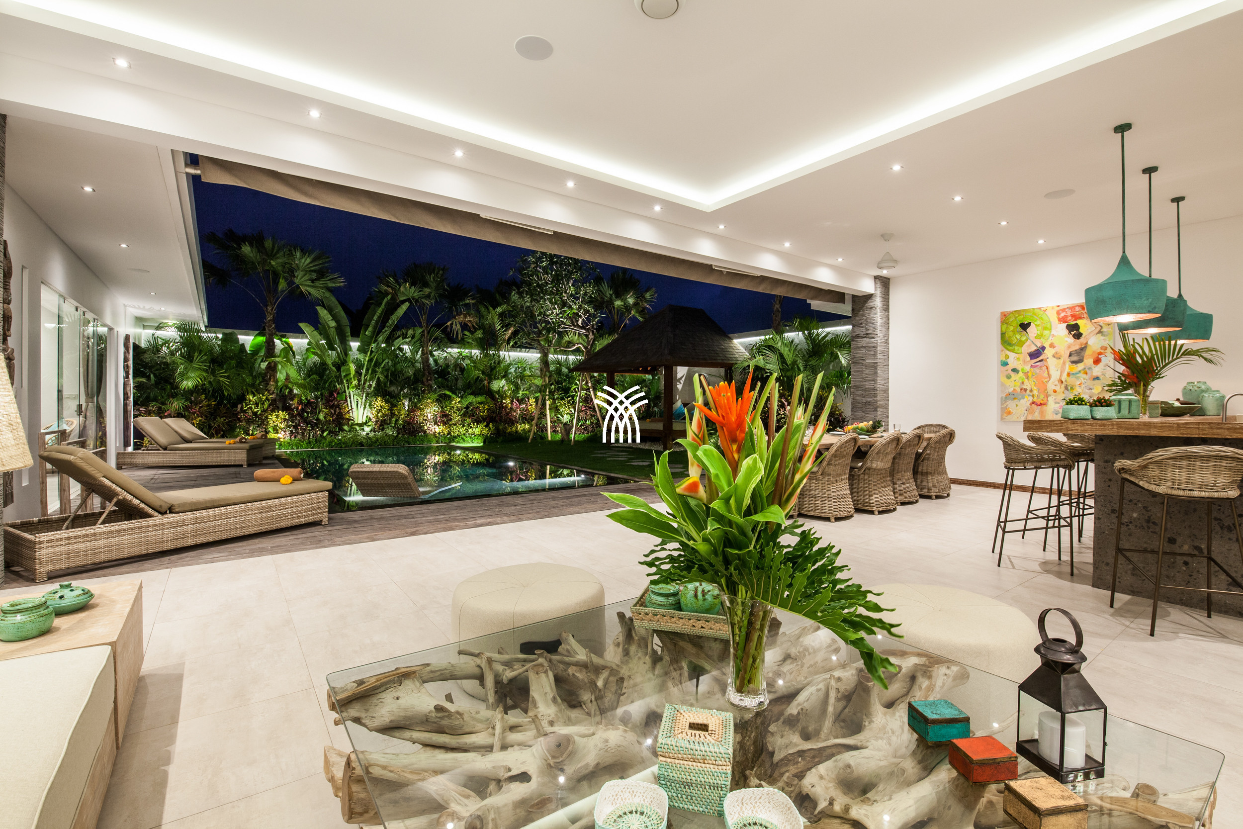 L'espace de vie ouvert se fond harmonieusement dans un jardin tropical luxuriant, où une piscine privée devient le point focal d'un cadre extérieur tranquille. Cette conception intérieure-extérieure harmonieuse invite à des matinées détendues, des après-midis ensoleillés et des soirées paisibles dans une atmosphère à la fois raffinée et accueillante.