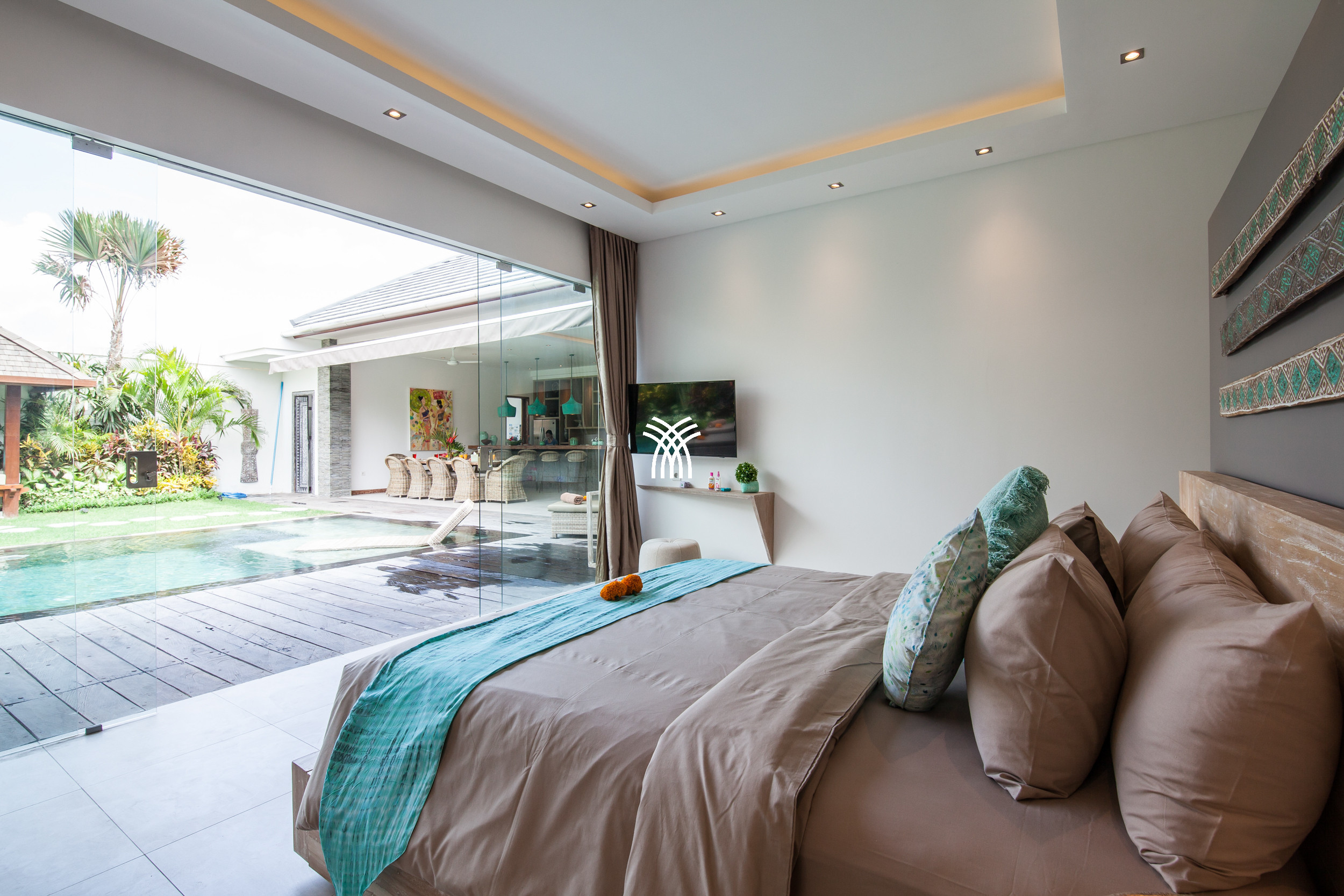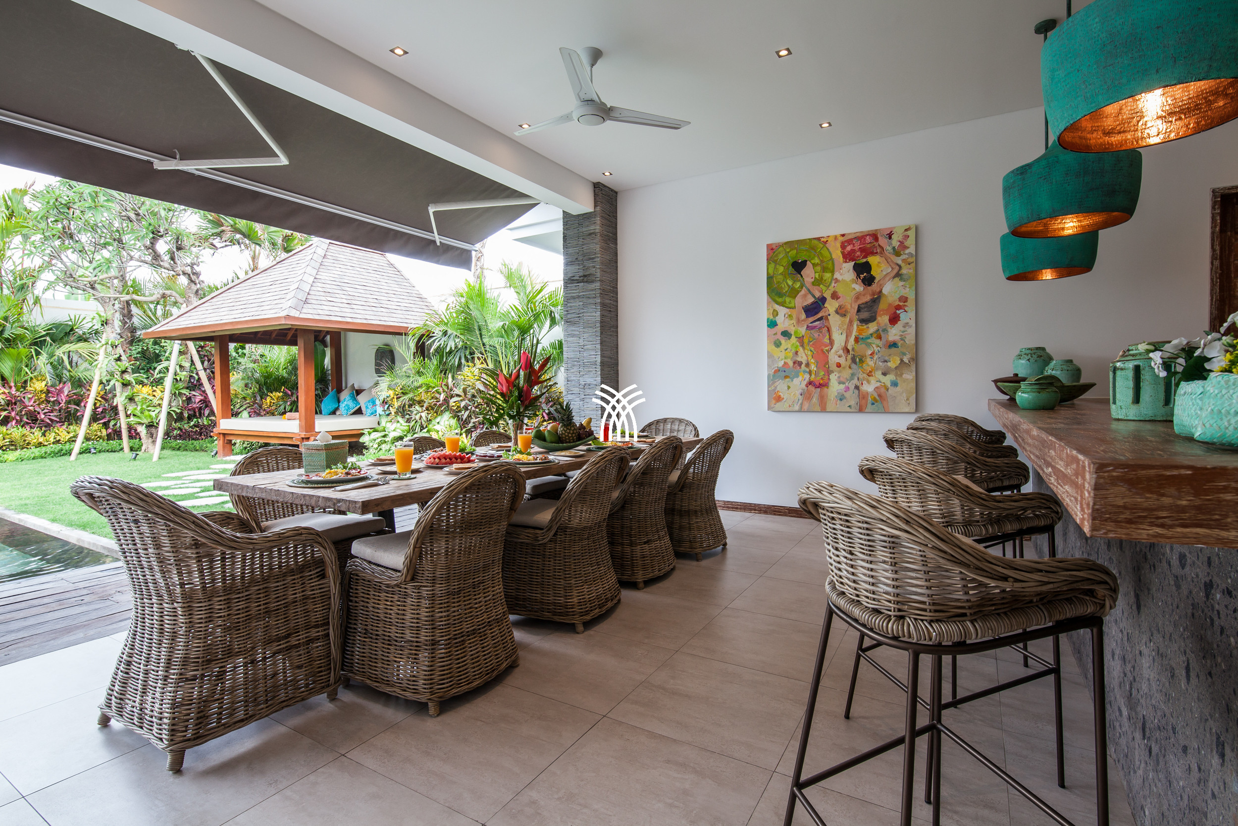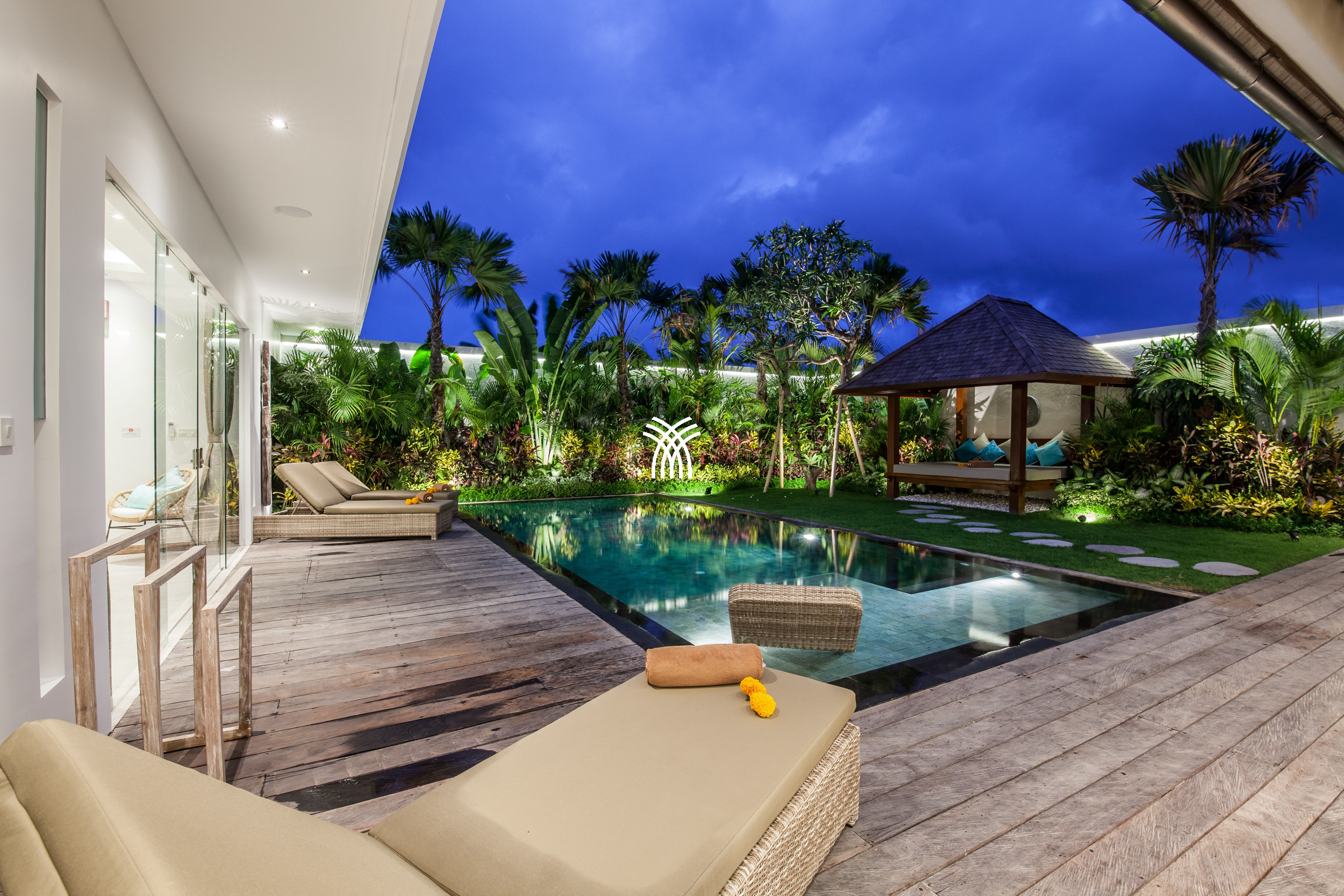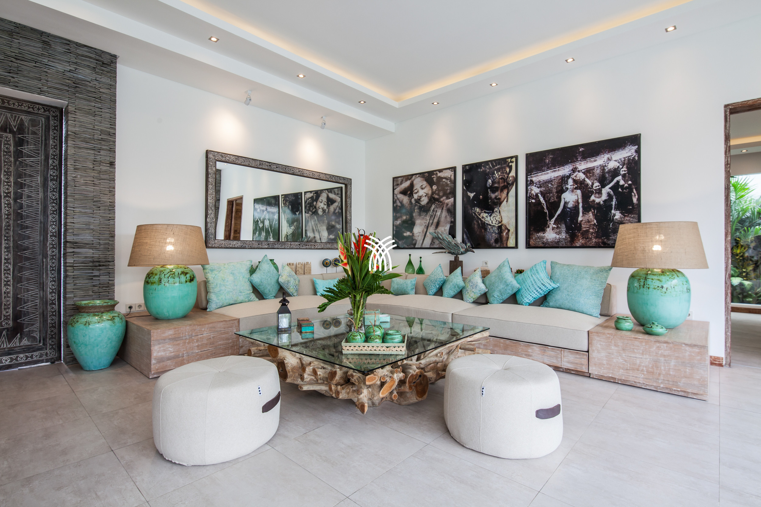 L'espace de vie ouvert se fond harmonieusement dans un jardin tropical luxuriant, où une piscine privée devient le point focal d'un cadre extérieur tranquille. Cette conception intérieure-extérieure harmonieuse invite à des matinées détendues, des après-midis ensoleillés et des soirées paisibles dans une atmosphère à la fois raffinée et accueillante.