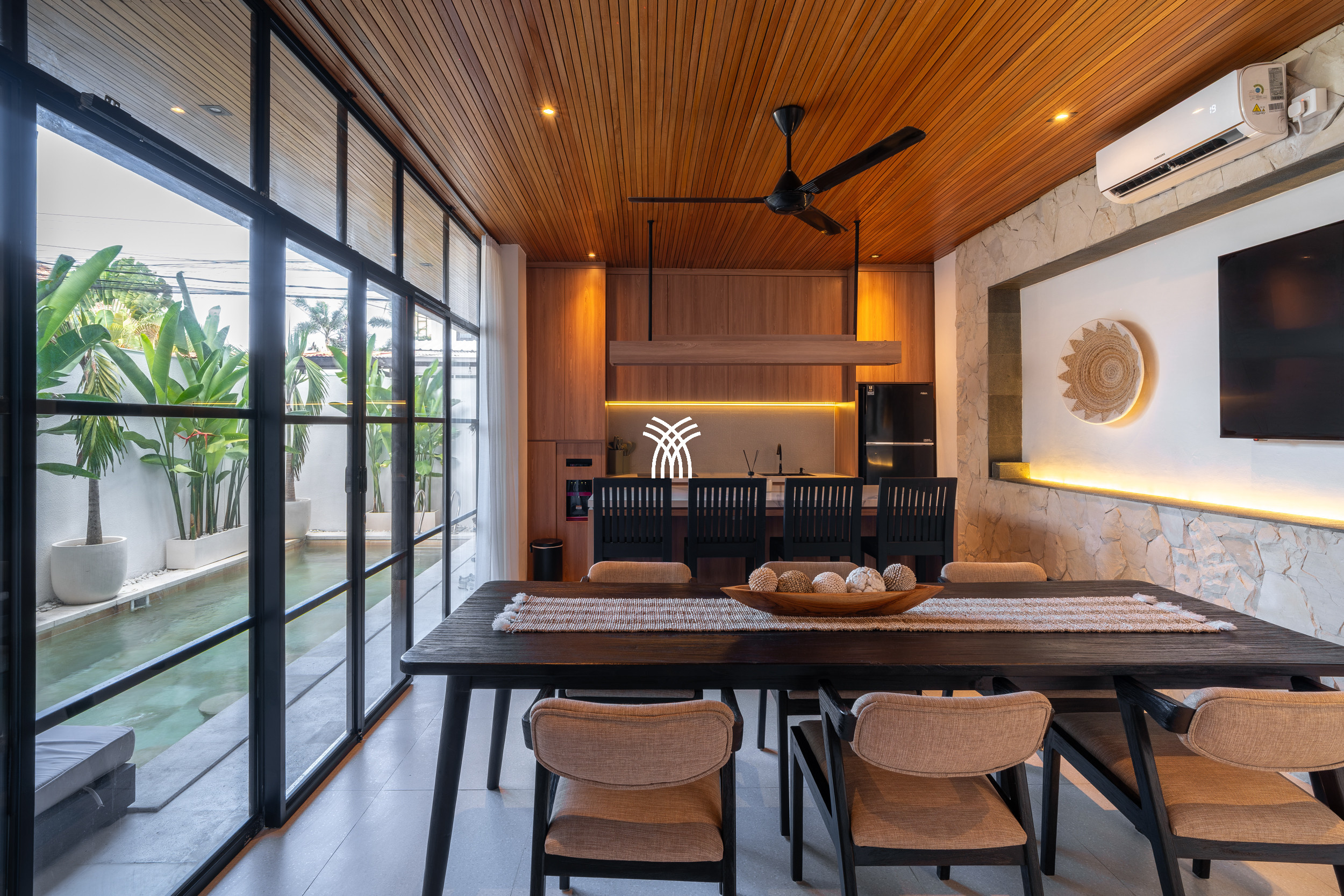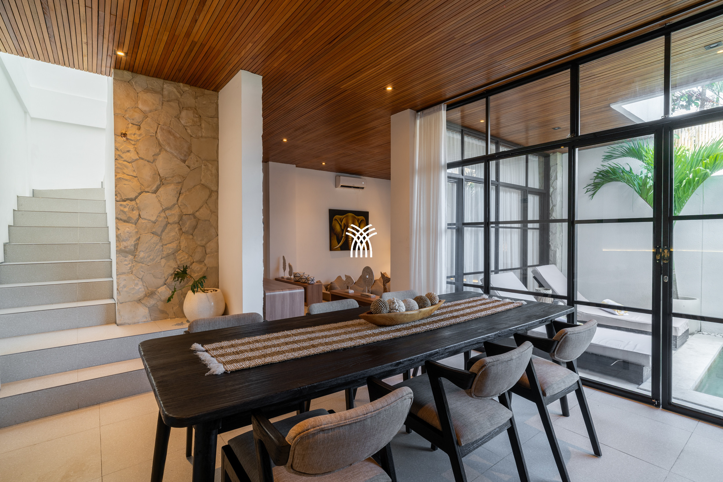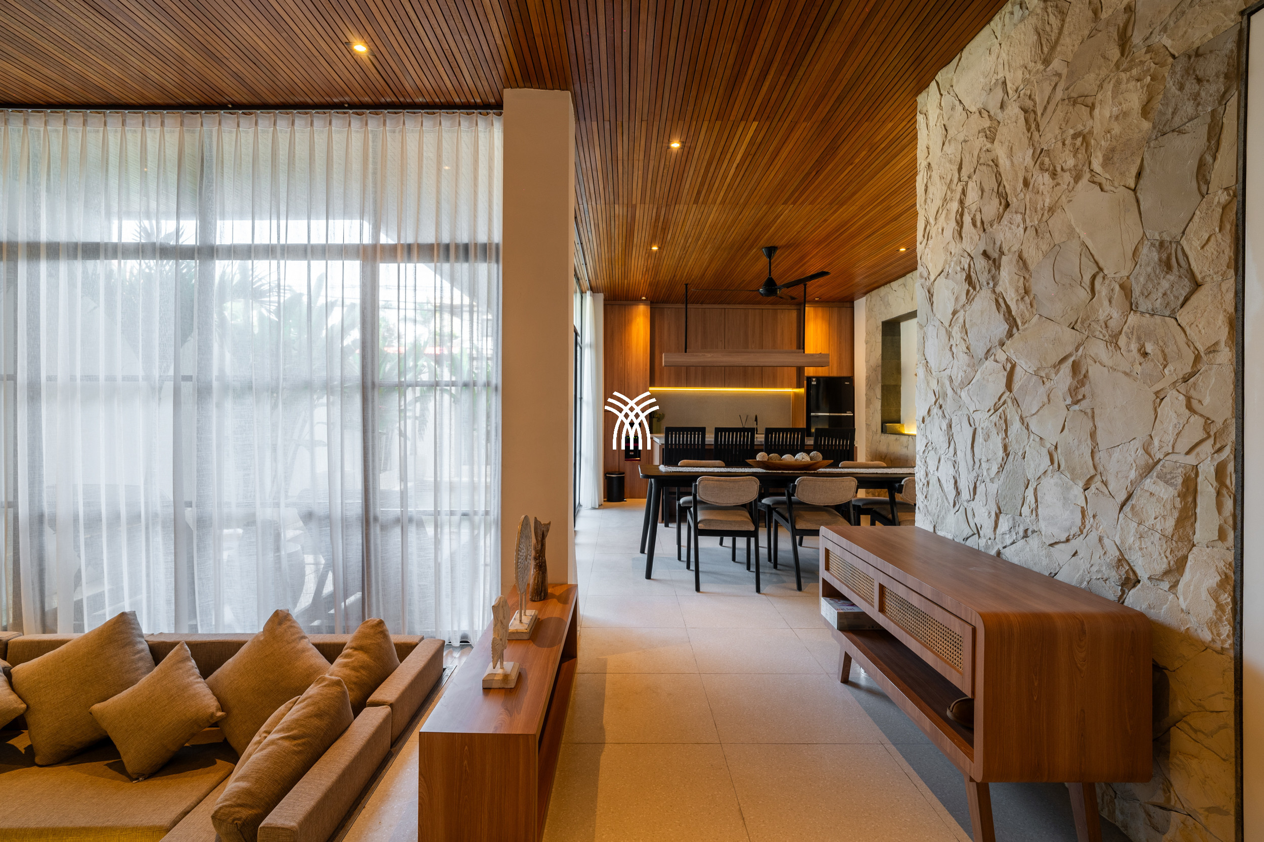 À l'entrée, la villa révèle un intérieur soigneusement conçu où l'esthétique moderne rencontre des éléments naturels chaleureux. Un décor tendance, des finitions en pierre naturelle et des tons minéraux riches sont complétés par un plafond distinctif en bois, créant une ambiance sophistiquée qui se veut à la fois actuelle et accueillante. Le salon en contrebas fermé, entièrement climatisé, sert de havre douillet pour la détente, avec un grand téléviseur qui invite à des soirées paisibles ou des moments de tranquillité après une journée d'exploration.