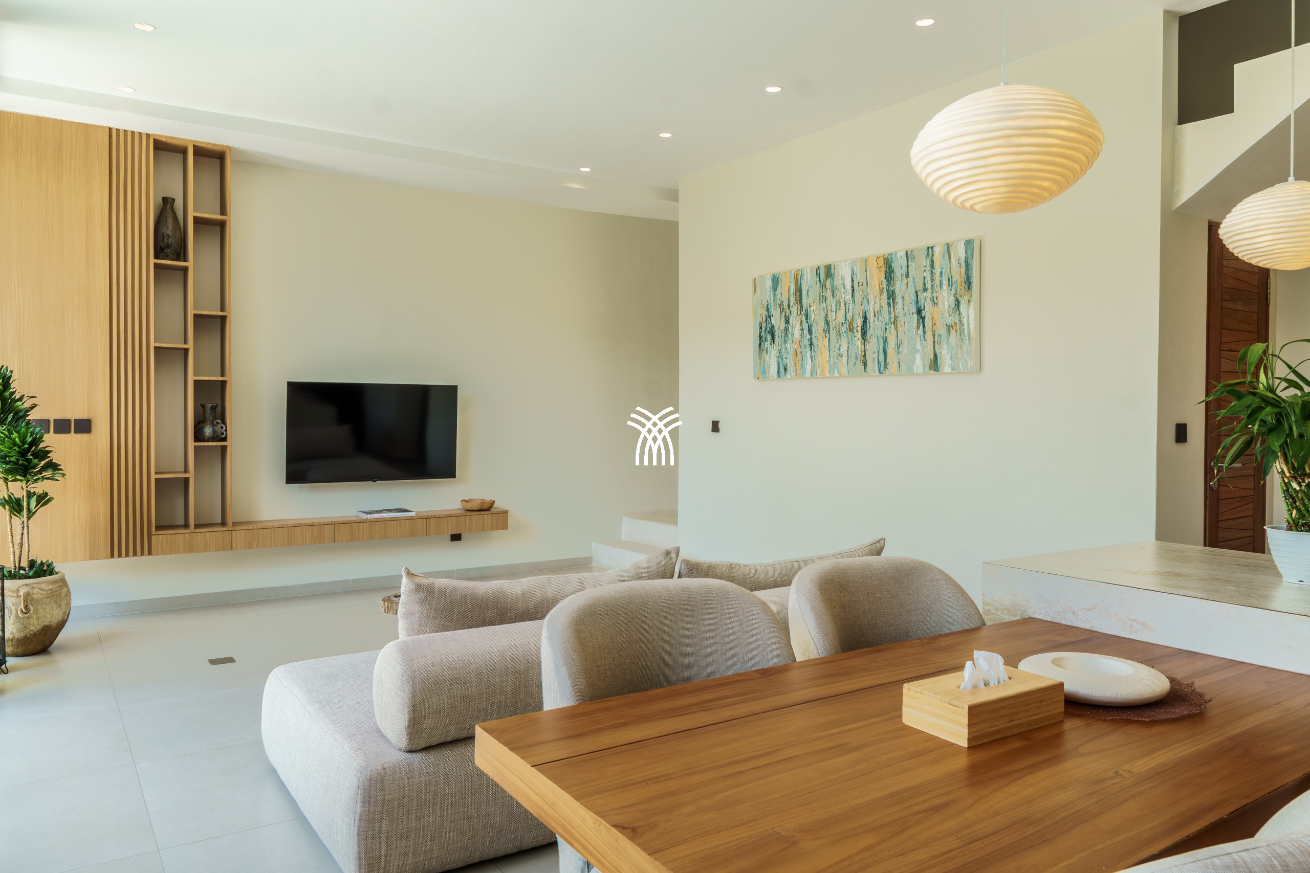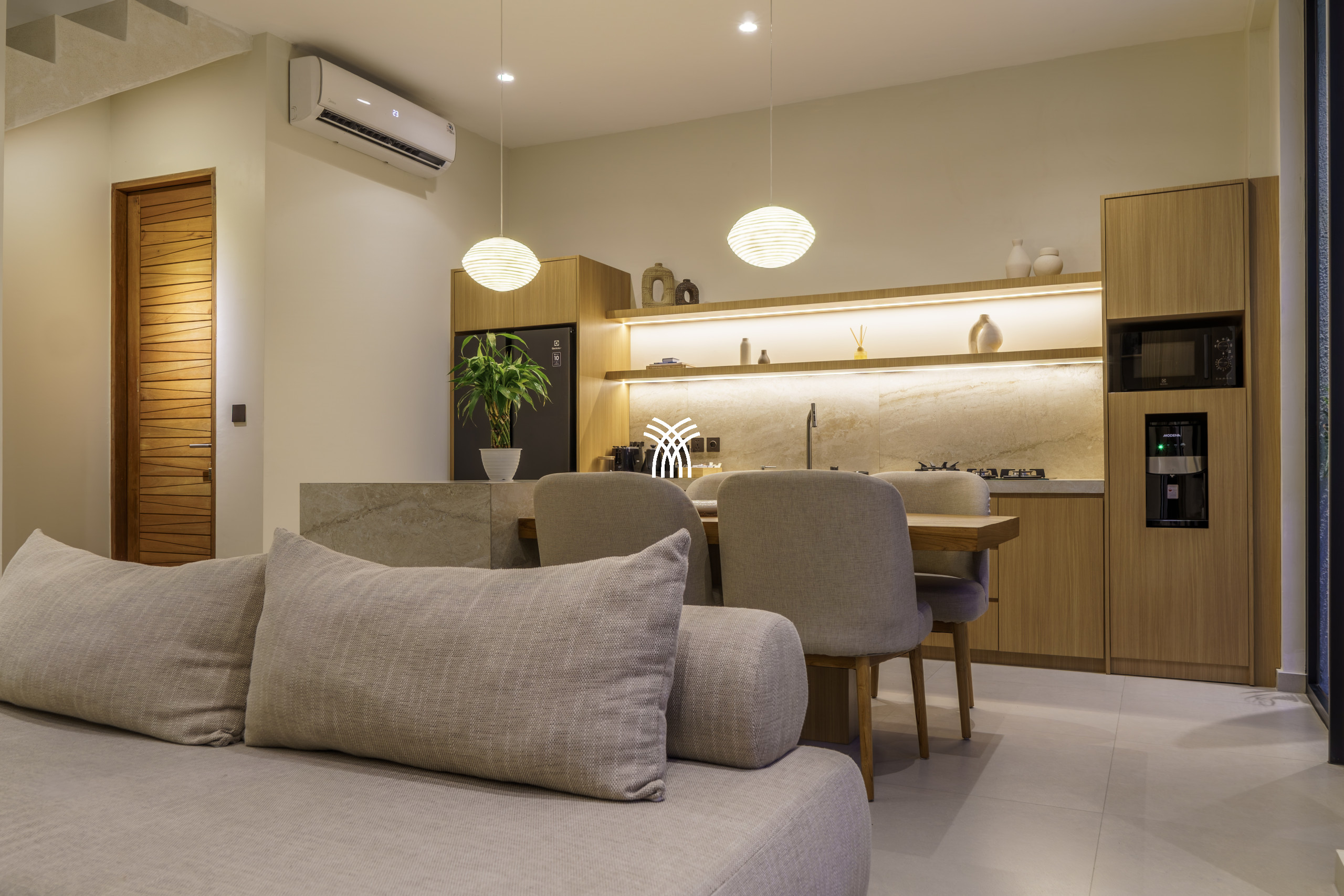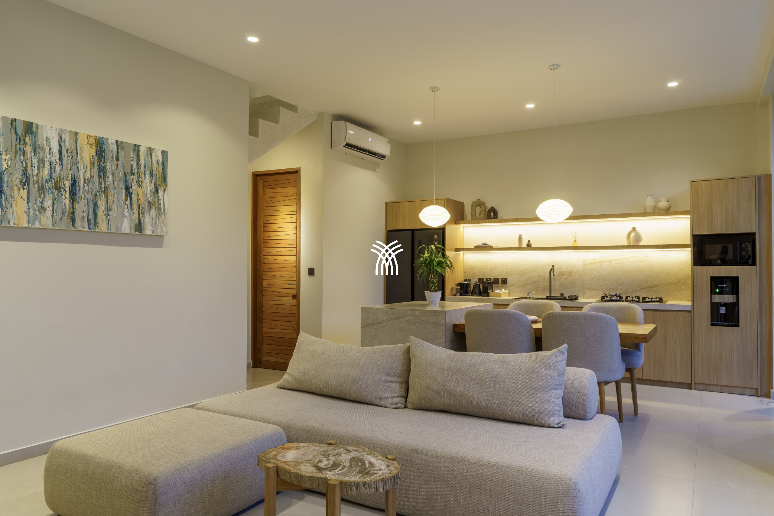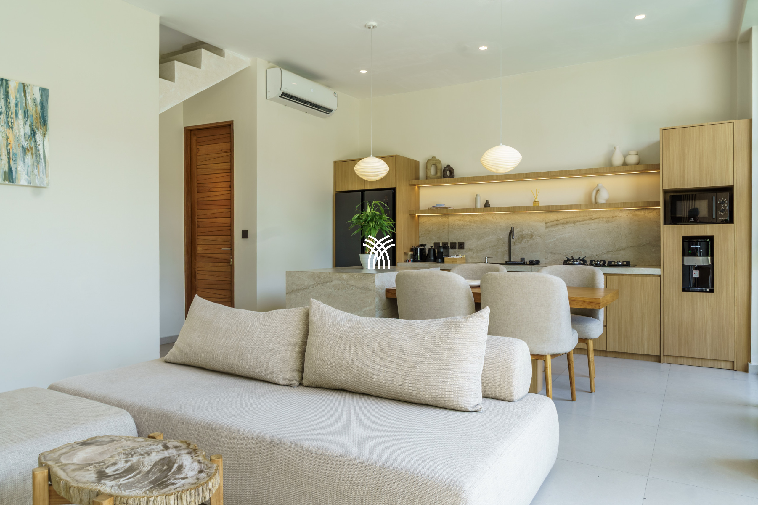 Conçue comme une échappatoire sereine et contemporaine, la villa présente des intérieurs aux tons doux enrichis de textures naturelles, d'éléments en bois chaleureux et d'une palette neutre apaisante qui renforce le sens de l'espace et de la lumière. L'espace de vie fermé, couronné par un plafond haut, est à la fois lumineux et accueillant, entièrement climatisé et complété par une télévision, créant un cadre confortable pour se détendre à tout moment de la journée. Une cuisine ouverte, entièrement équipée et centrée autour d'un îlot élégant, s'intègre harmonieusement à l'espace de vie, offrant à la fois fonctionnalité et style discret.