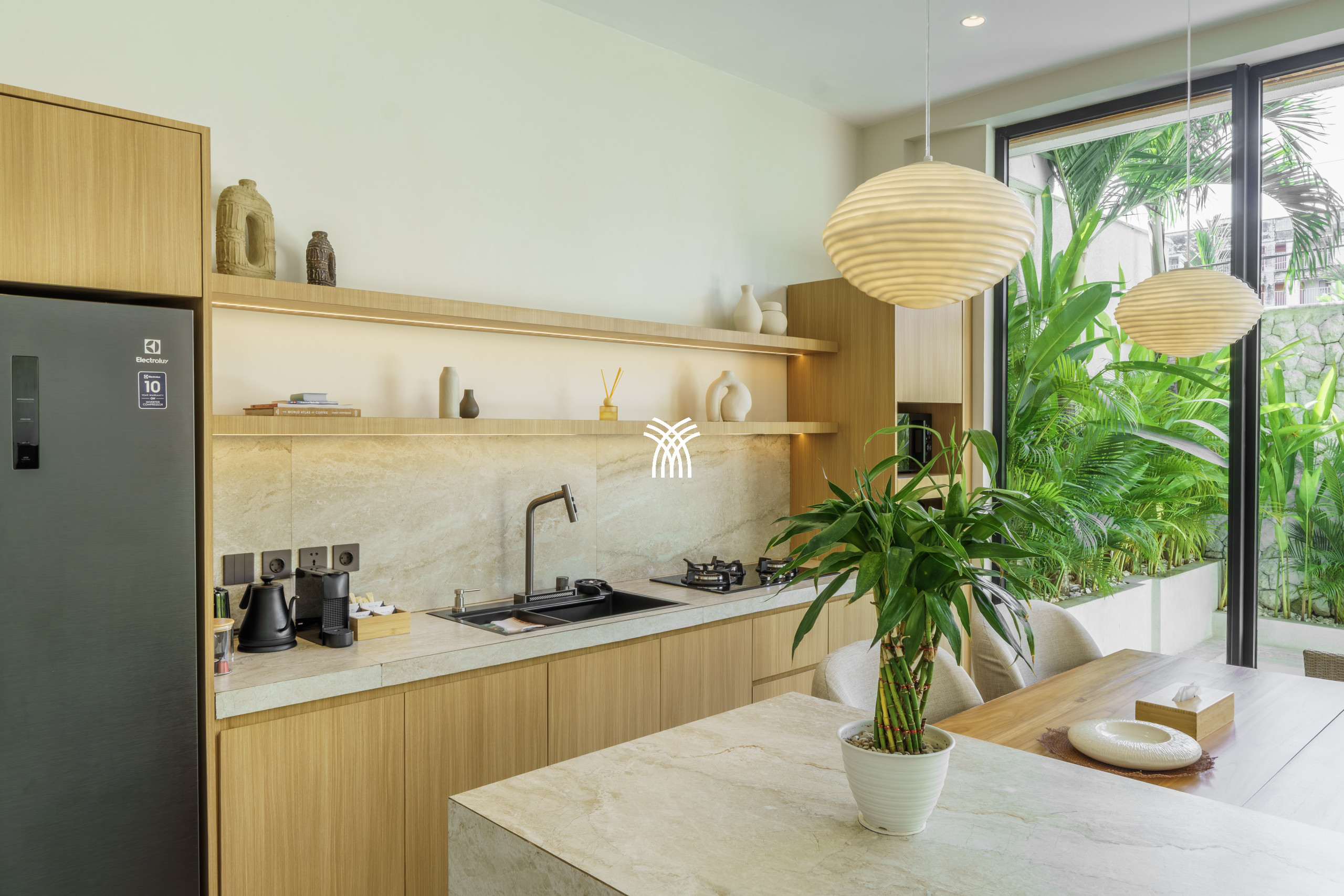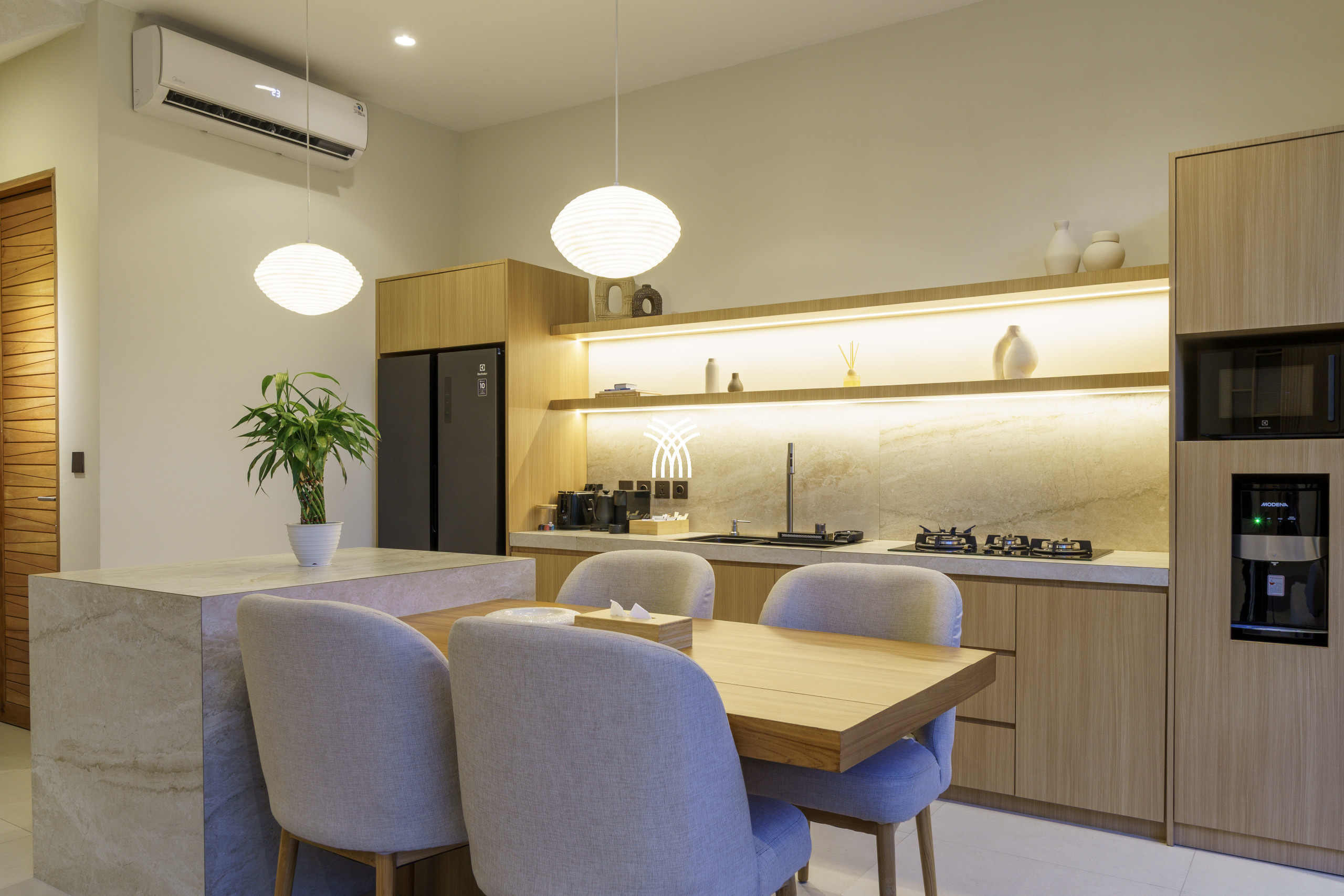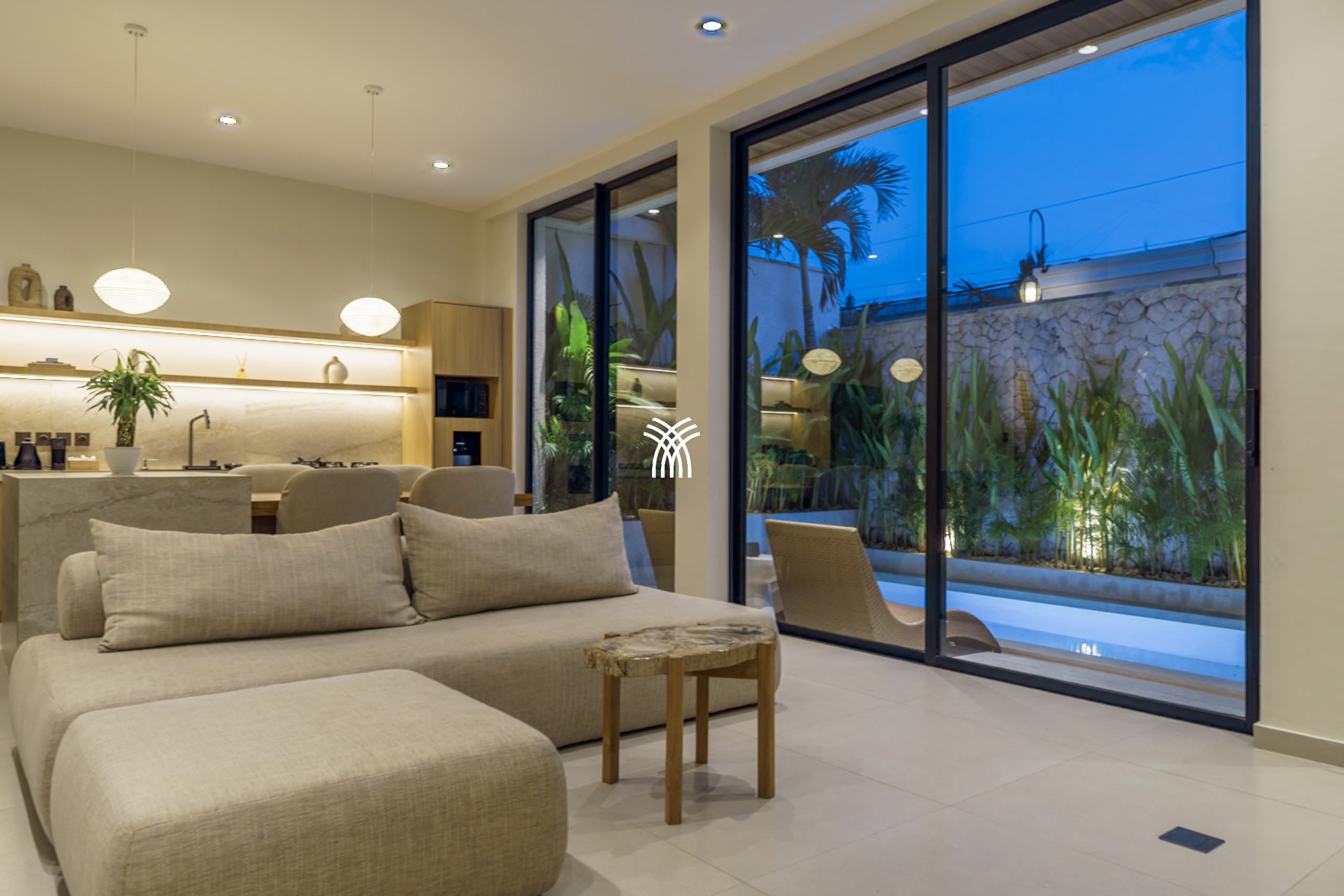 Conçue comme une échappatoire sereine et contemporaine, la villa présente des intérieurs aux tons doux enrichis de textures naturelles, d'éléments en bois chaleureux et d'une palette neutre apaisante qui renforce le sens de l'espace et de la lumière. L'espace de vie fermé, couronné par un plafond haut, est à la fois lumineux et accueillant, entièrement climatisé et complété par une télévision, créant un cadre confortable pour se détendre à tout moment de la journée. Une cuisine ouverte, entièrement équipée et centrée autour d'un îlot élégant, s'intègre harmonieusement à l'espace de vie, offrant à la fois fonctionnalité et style discret.
