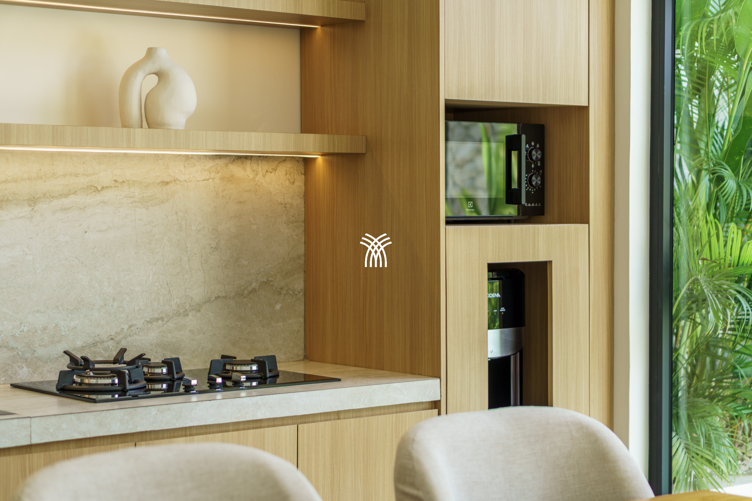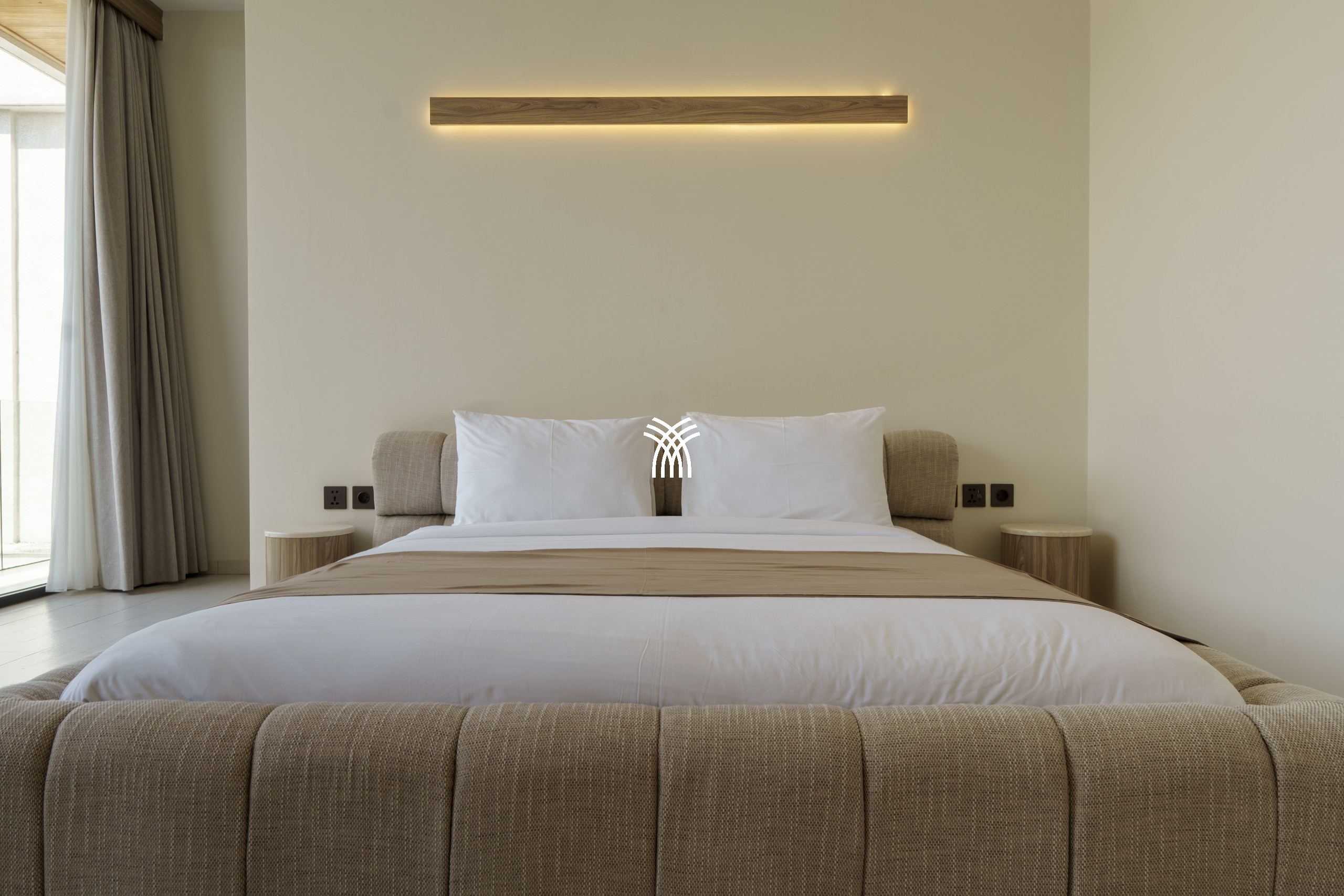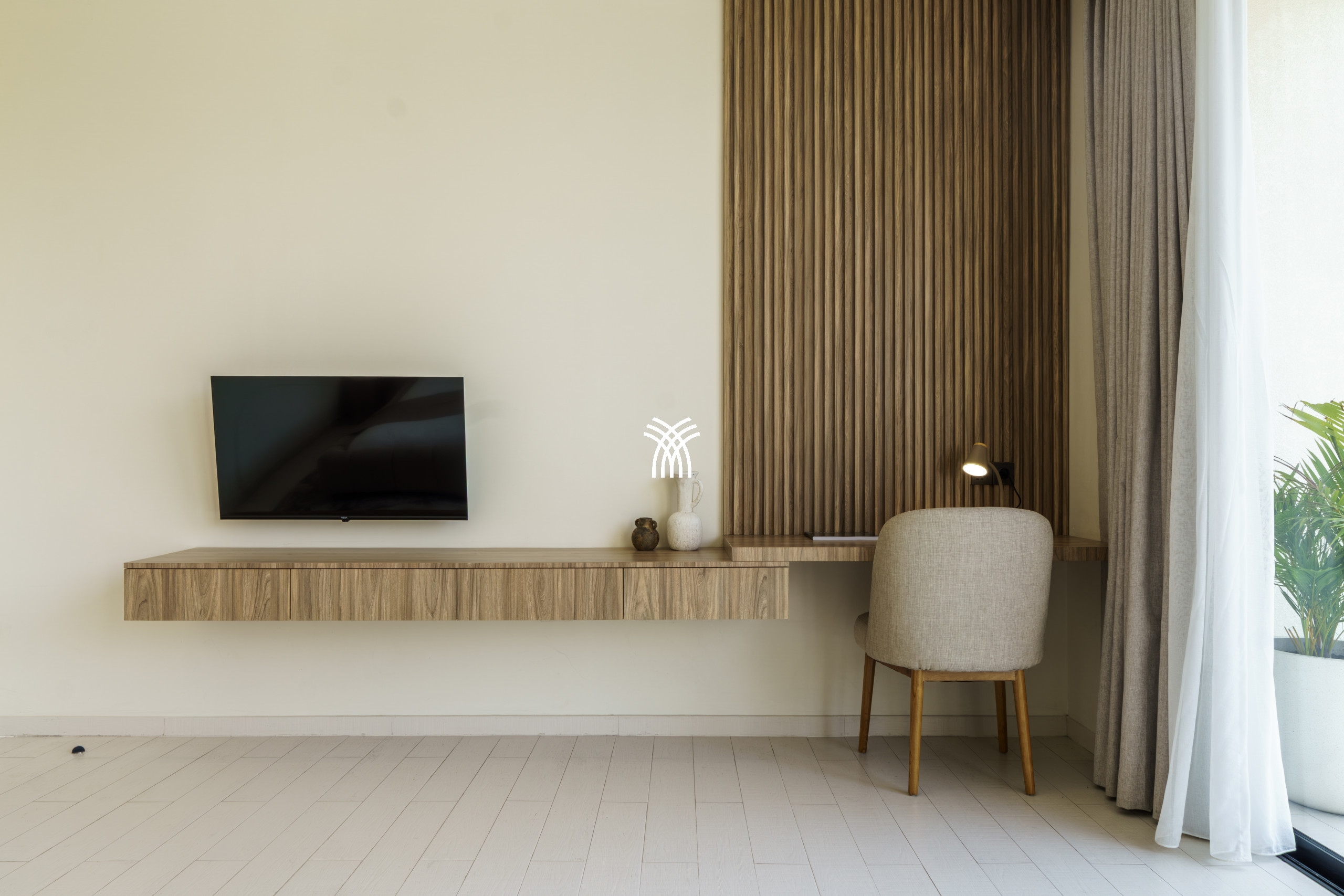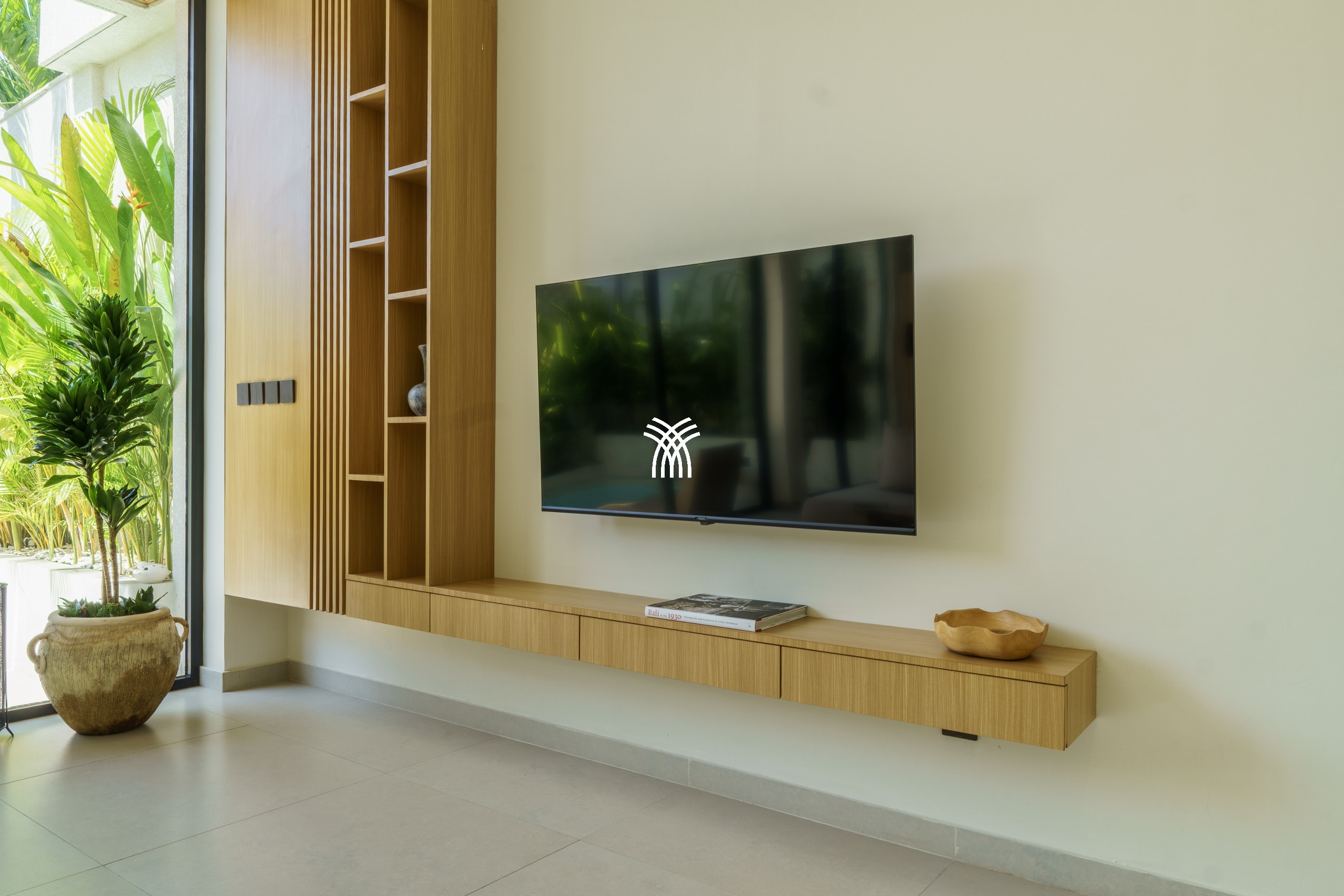 Conçue comme une échappatoire sereine et contemporaine, la villa présente des intérieurs aux tons doux enrichis de textures naturelles, d'éléments en bois chaleureux et d'une palette neutre apaisante qui renforce le sens de l'espace et de la lumière. L'espace de vie fermé, couronné par un plafond haut, est à la fois lumineux et accueillant, entièrement climatisé et complété par une télévision, créant un cadre confortable pour se détendre à tout moment de la journée. Une cuisine ouverte, entièrement équipée et centrée autour d'un îlot élégant, s'intègre harmonieusement à l'espace de vie, offrant à la fois fonctionnalité et style discret.
