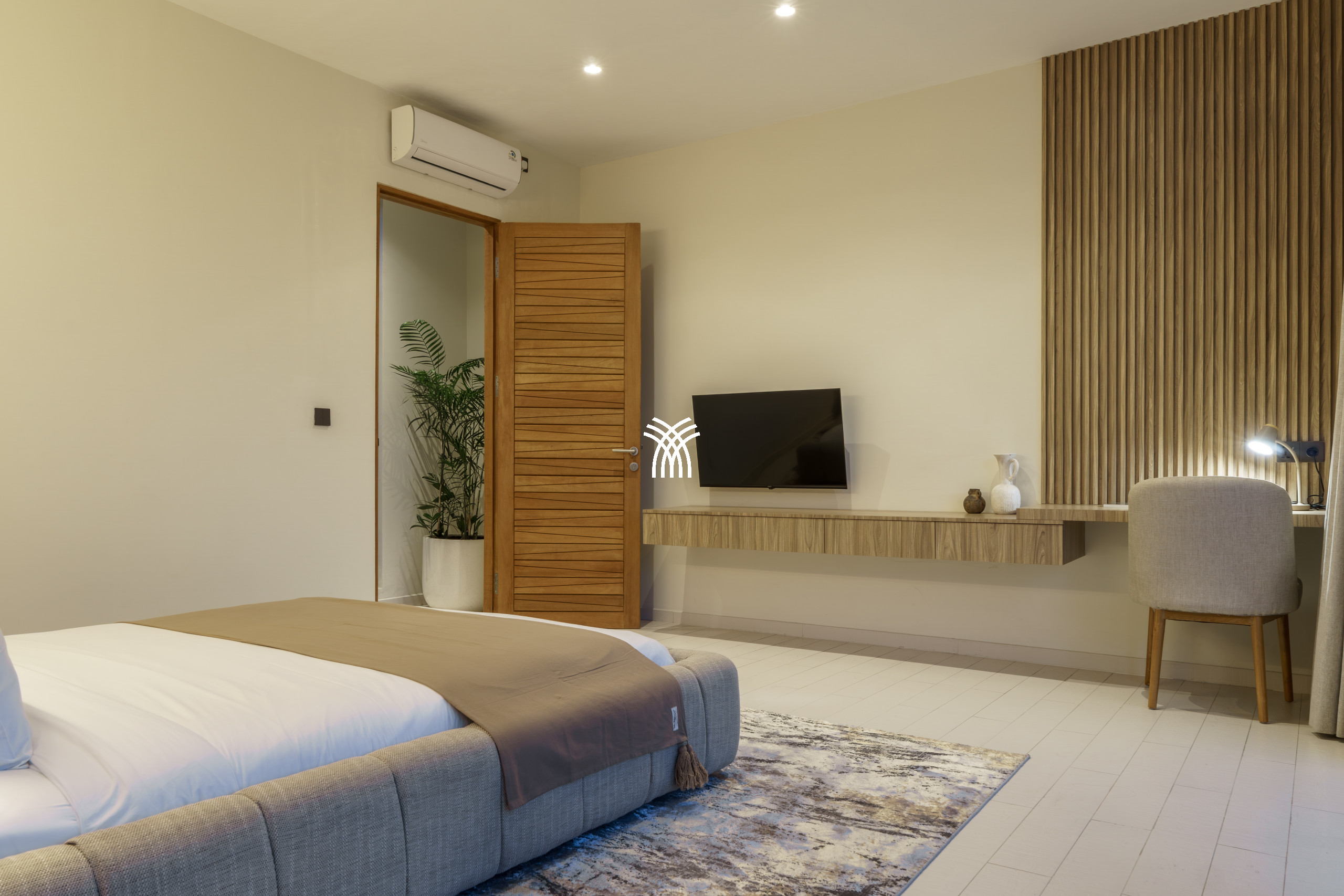 À l'étage, la suite principale se déploie comme un havre de tranquillité aux proportions généreuses, avec un grand lit confortable, une télévision, un espace de travail dédié et un balcon privé. La salle de bain attenante est tout aussi spacieuse, comprenant un dressing, une grande douche et des équipements haut de gamme conçus pour transformer le rituel quotidien en une expérience raffinée.