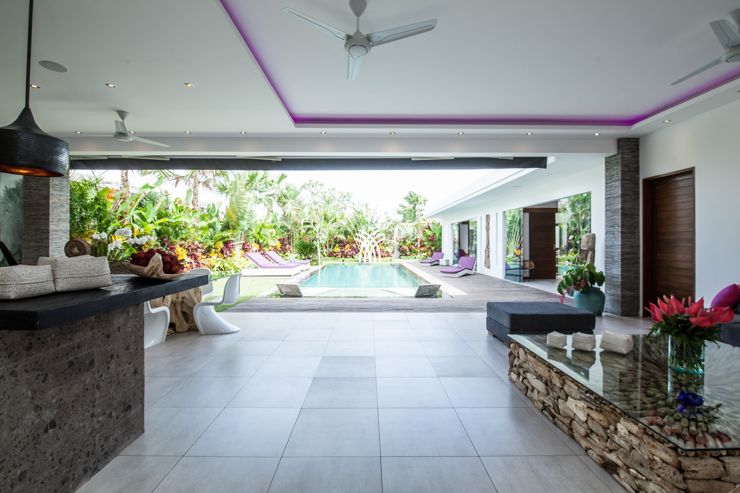 À l'arrivée, un jardin tropical luxuriant se déploie jusqu'à une superbe piscine à débordement privée, où des sièges intégrés et une table créent un cadre unique pour déguster des boissons tout en étant immergé dans l'eau. À proximité, un kiosque ombragé invite à des moments de détente tranquille, que ce soit pour lire, se relaxer ou partager des conversations dans un environnement extérieur paisible.