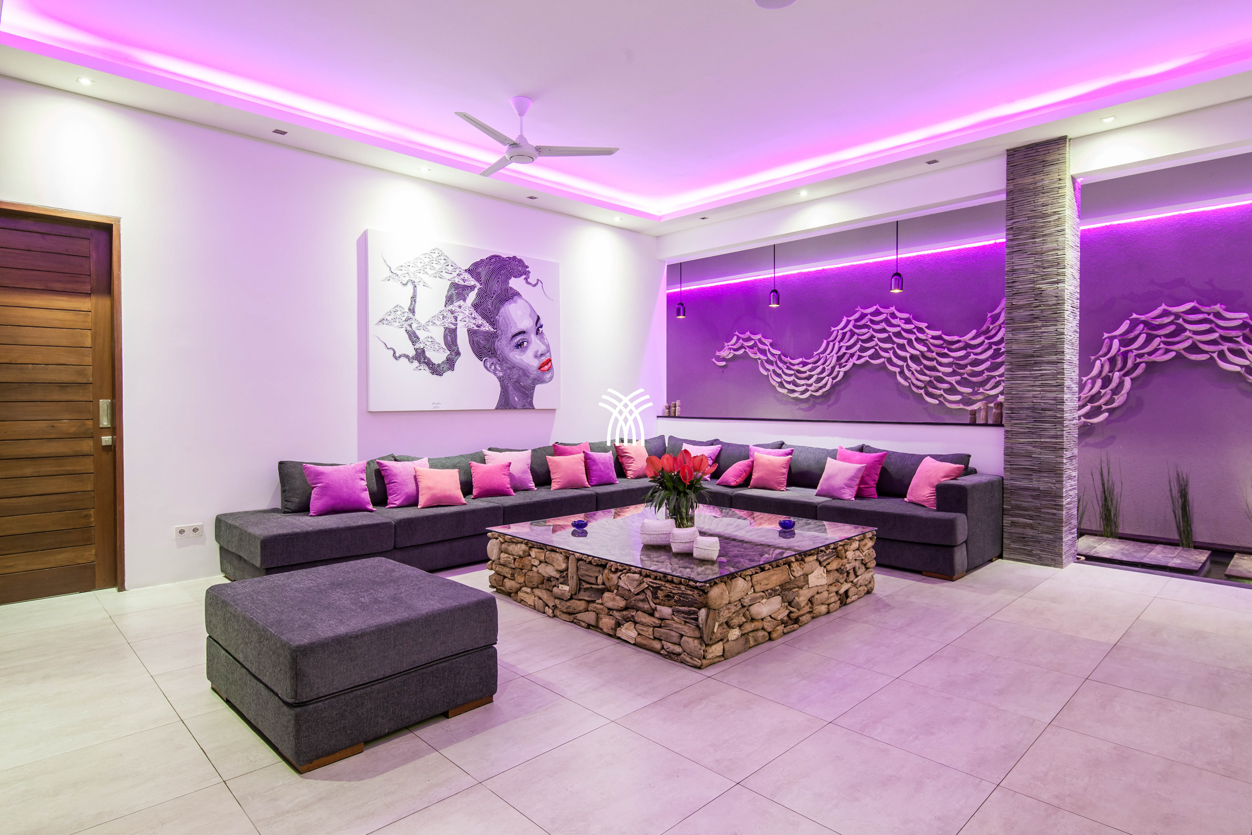 À l'intérieur, la villa révèle des espaces de vie spacieux et une cuisine entièrement équipée conçue à la fois pour la commodité et les expériences partagées. Les meubles en velours et un jardin intérieur serein introduisent chaleur et texture, créant un équilibre harmonieux entre élégance et confort qui définit cette location de villa de luxe exceptionnelle à Bali.