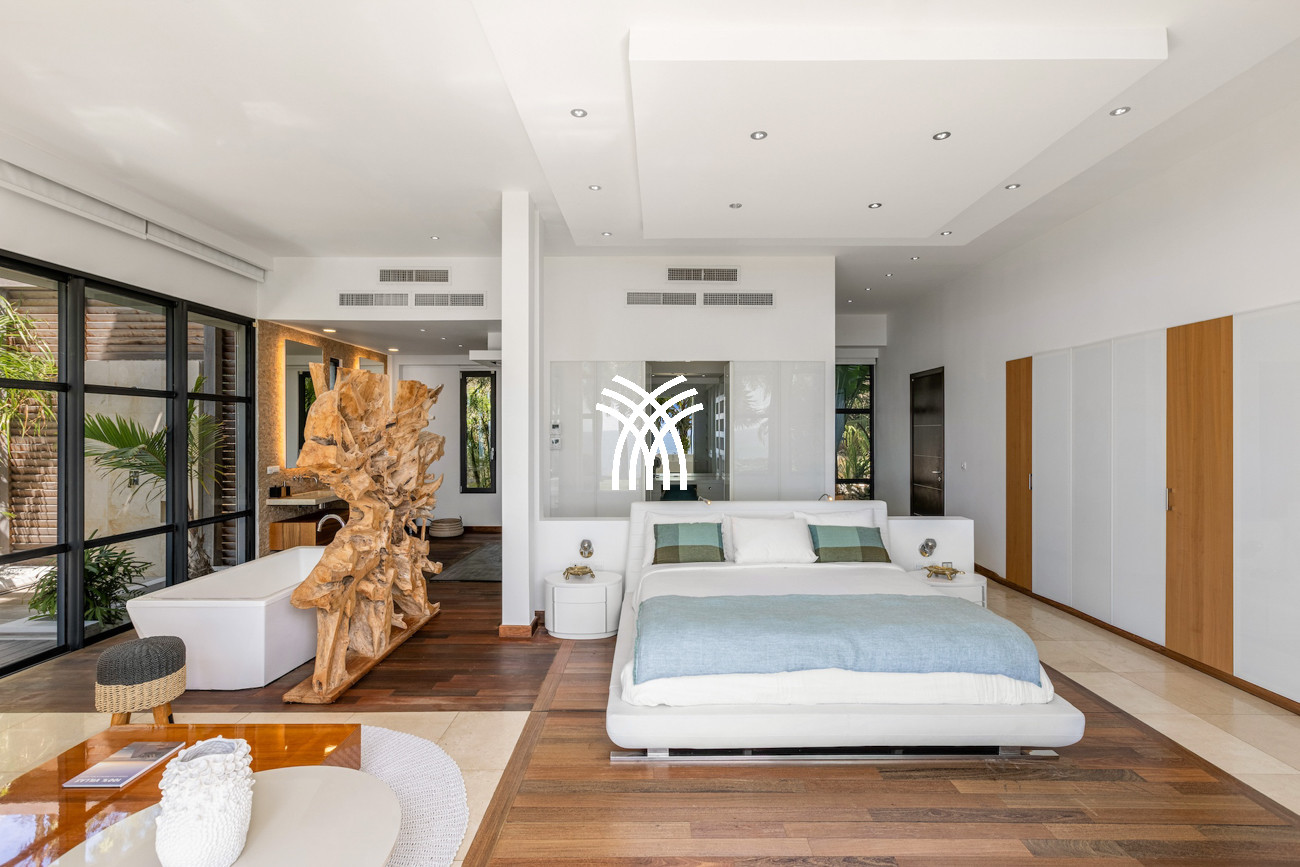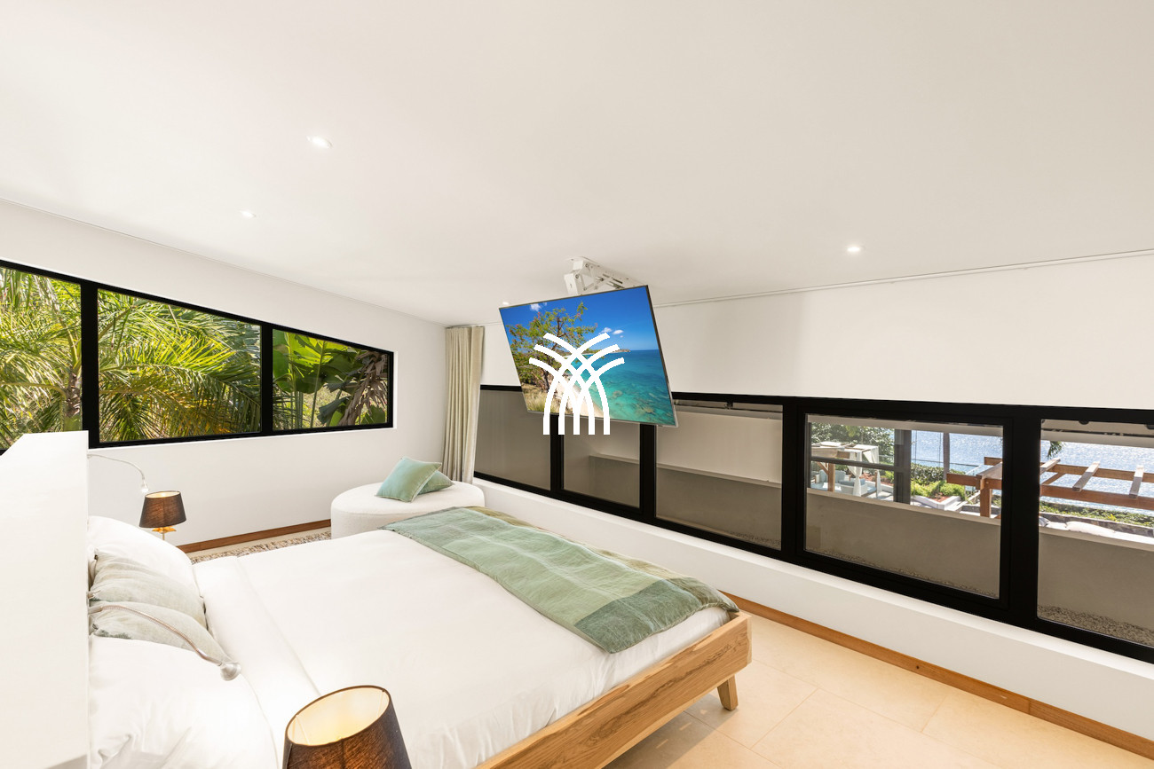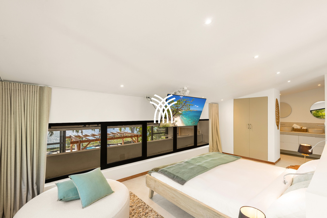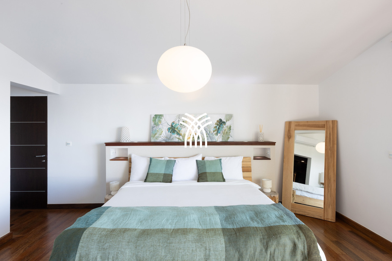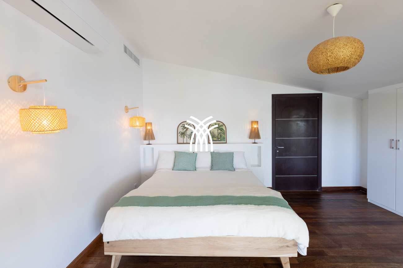 Le niveau principal abrite deux chambres pratiquement connectées, dont une suite principale qui s'ouvre directement sur le jardin tropical pour des matins paisibles au lever du soleil, aux côtés d'une chambre d'enfants confortable avec des lits superposés spacieux idéaux pour les séjours en famille. À l'étage, deux chambres magnifiquement aménagées disposent chacune de salles de bains privatives, dont l'une offre sa propre terrasse et son jacuzzi où les invités peuvent se détendre en toute intimité tout en profitant de la douce brise de l'île. Une cinquième chambre positionnée près de l'entrée offre un accès extérieur indépendant, ce qui la rend idéale pour les invités recherchant discrétion et calme supplémentaires.