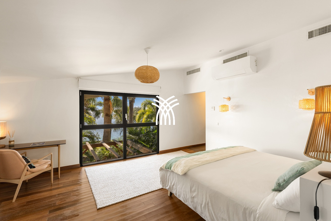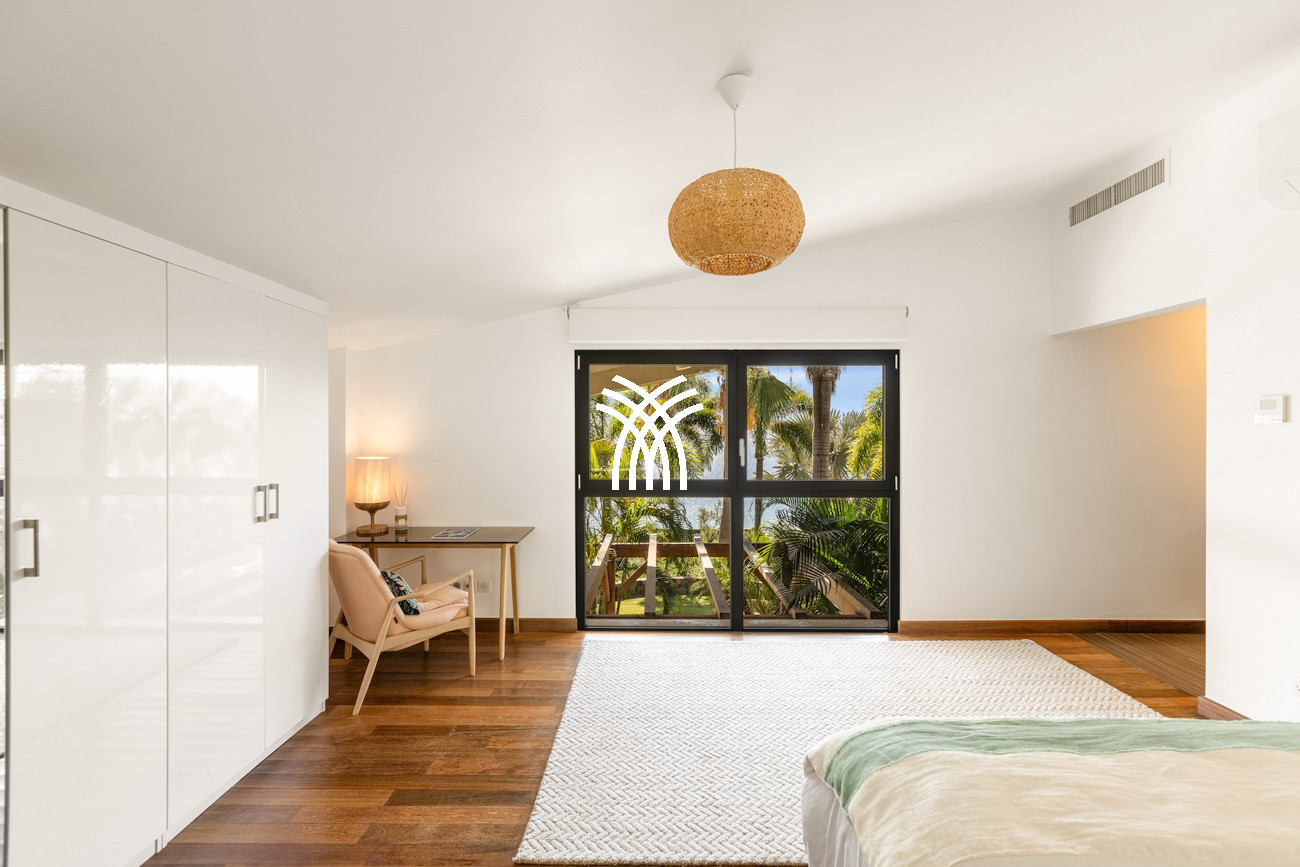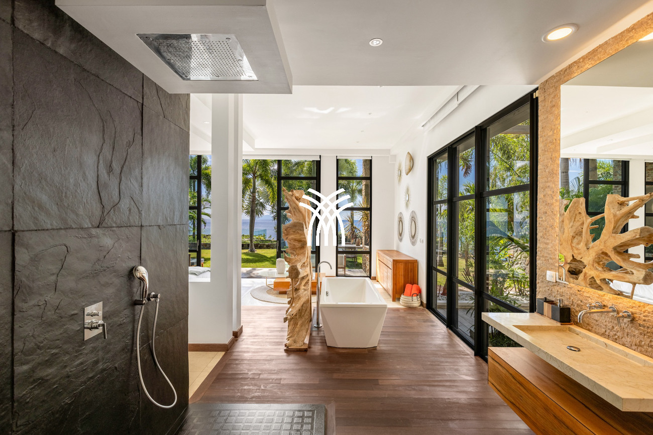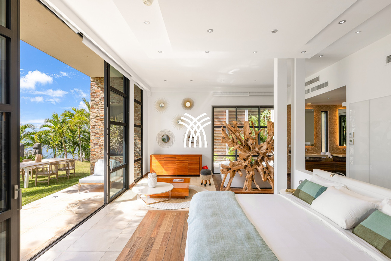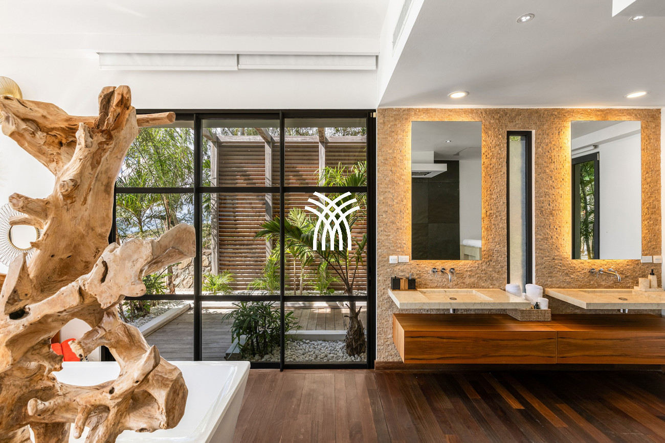 Le niveau principal abrite deux chambres pratiquement connectées, dont une suite principale qui s'ouvre directement sur le jardin tropical pour des matins paisibles au lever du soleil, aux côtés d'une chambre d'enfants confortable avec des lits superposés spacieux idéaux pour les séjours en famille. À l'étage, deux chambres magnifiquement aménagées disposent chacune de salles de bains privatives, dont l'une offre sa propre terrasse et son jacuzzi où les invités peuvent se détendre en toute intimité tout en profitant de la douce brise de l'île. Une cinquième chambre positionnée près de l'entrée offre un accès extérieur indépendant, ce qui la rend idéale pour les invités recherchant discrétion et calme supplémentaires.