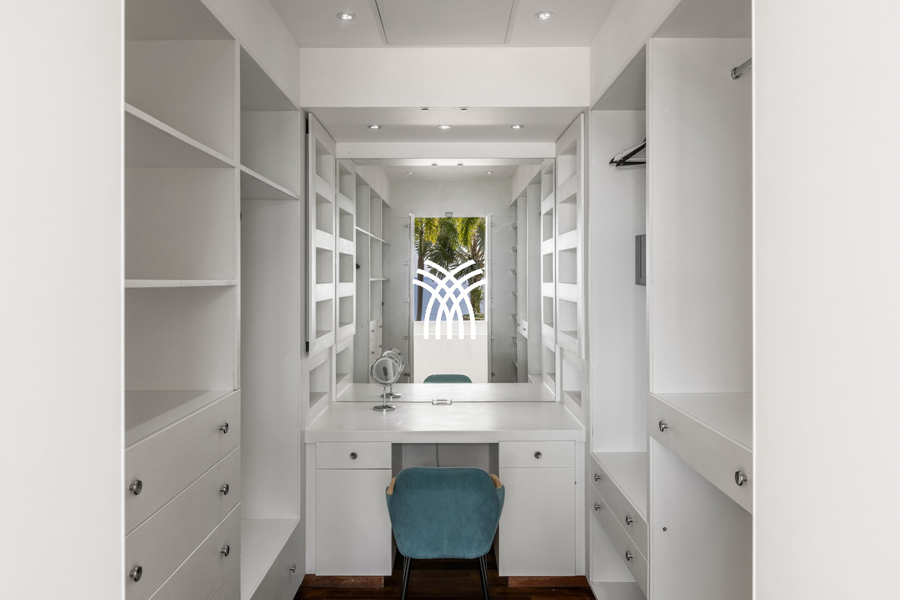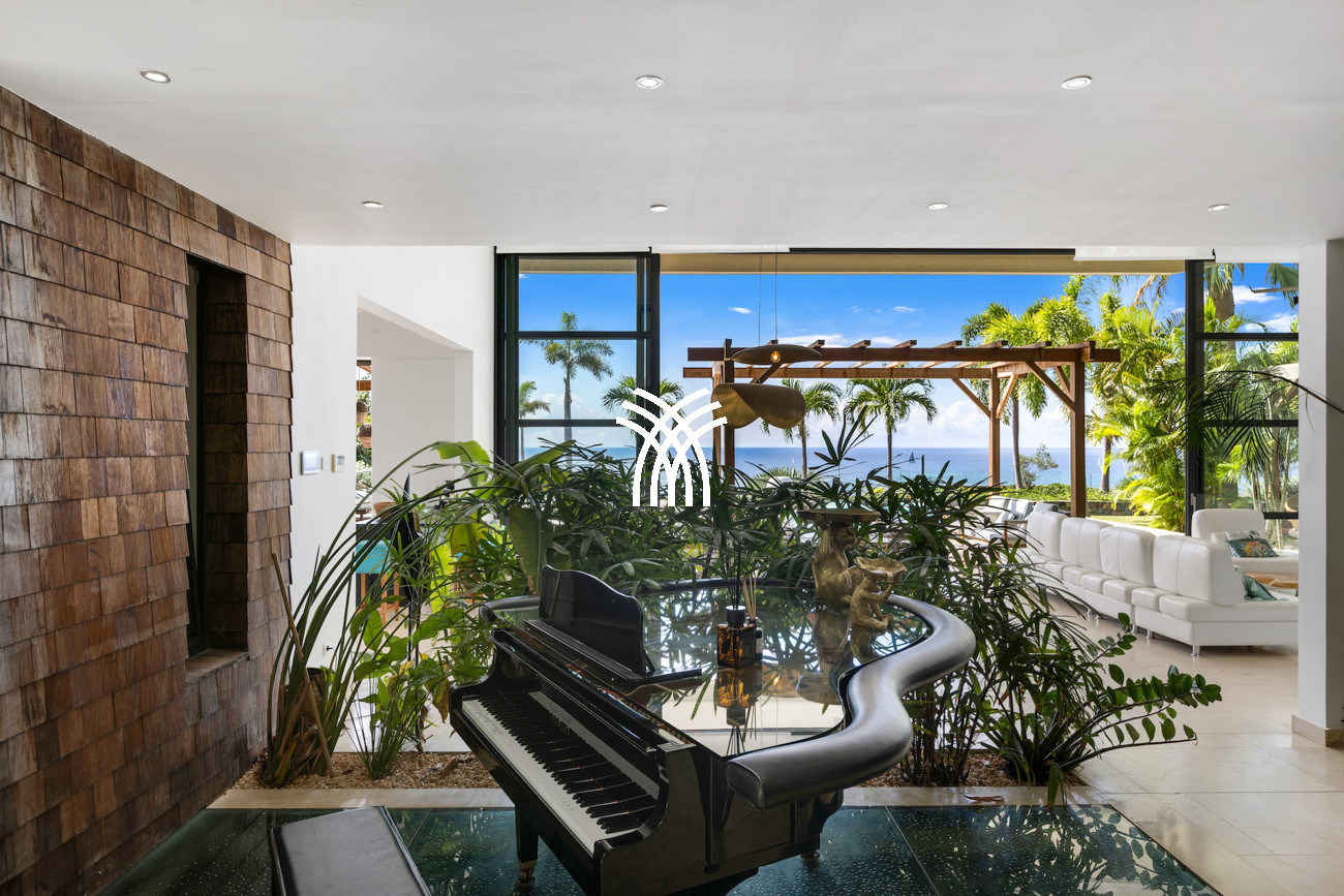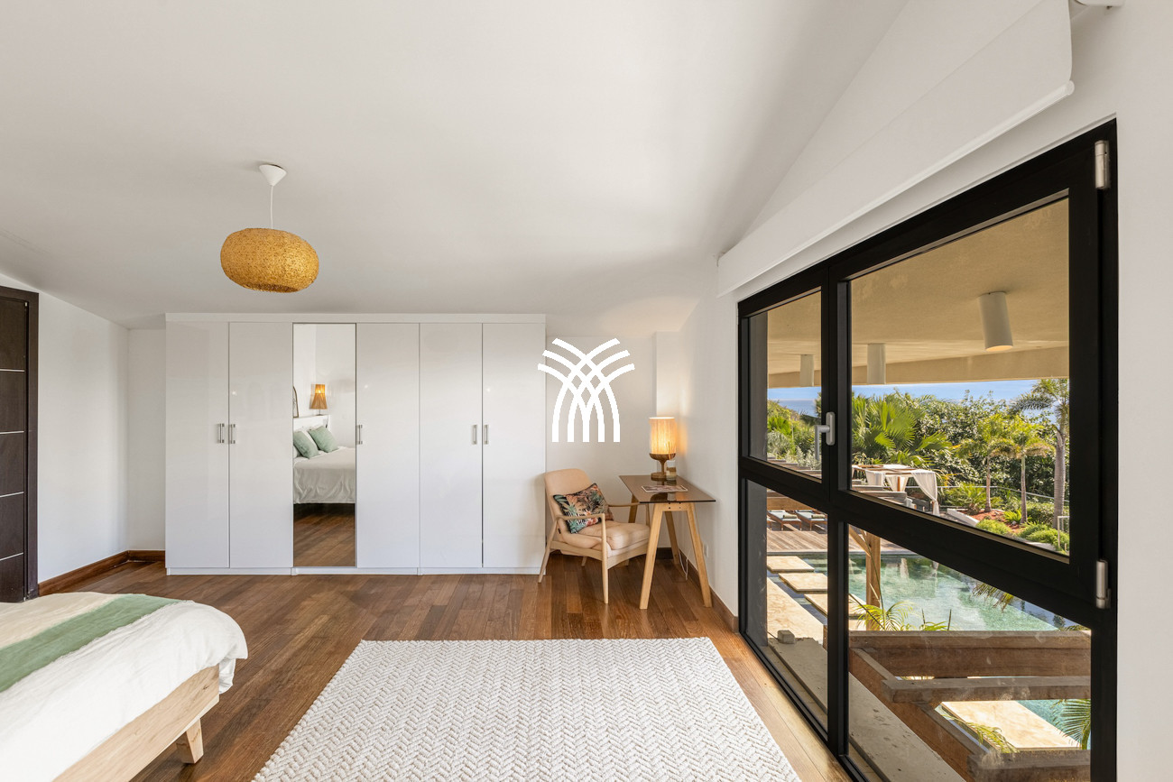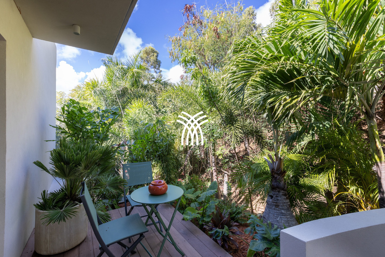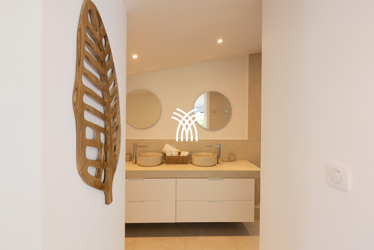 Le niveau principal abrite deux chambres pratiquement connectées, dont une suite principale qui s'ouvre directement sur le jardin tropical pour des matins paisibles au lever du soleil, aux côtés d'une chambre d'enfants confortable avec des lits superposés spacieux idéaux pour les séjours en famille. À l'étage, deux chambres magnifiquement aménagées disposent chacune de salles de bains privatives, dont l'une offre sa propre terrasse et son jacuzzi où les invités peuvent se détendre en toute intimité tout en profitant de la douce brise de l'île. Une cinquième chambre positionnée près de l'entrée offre un accès extérieur indépendant, ce qui la rend idéale pour les invités recherchant discrétion et calme supplémentaires.