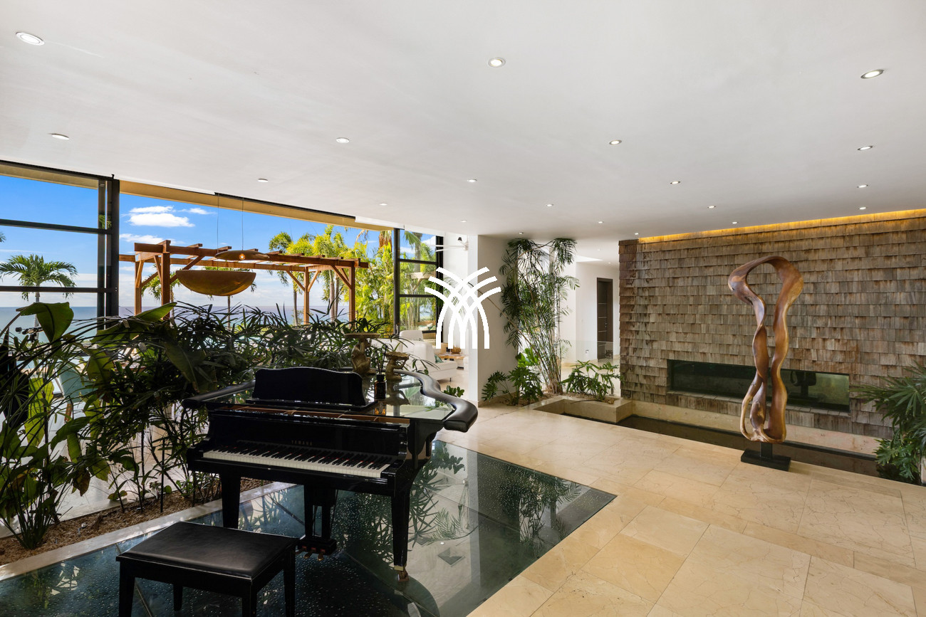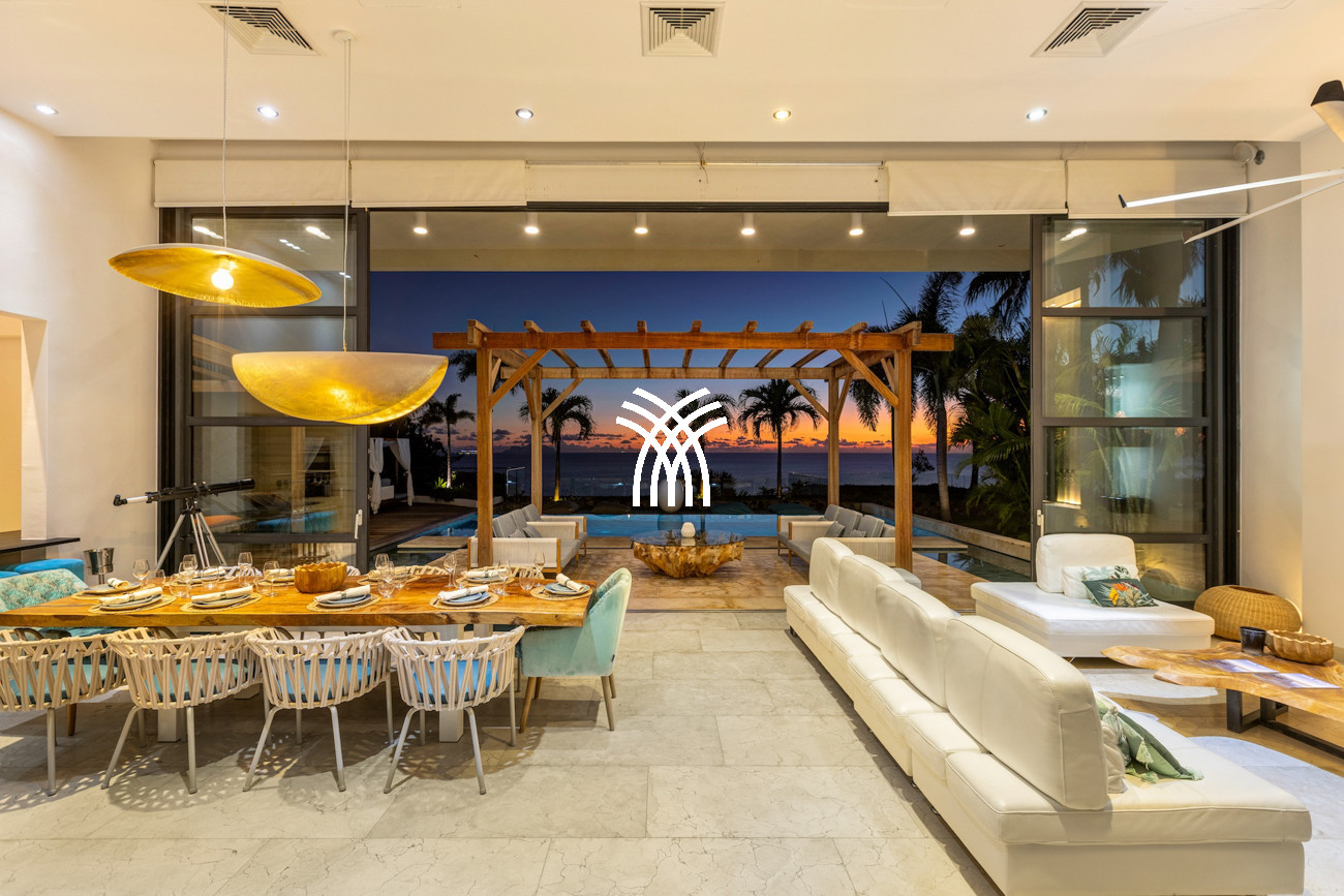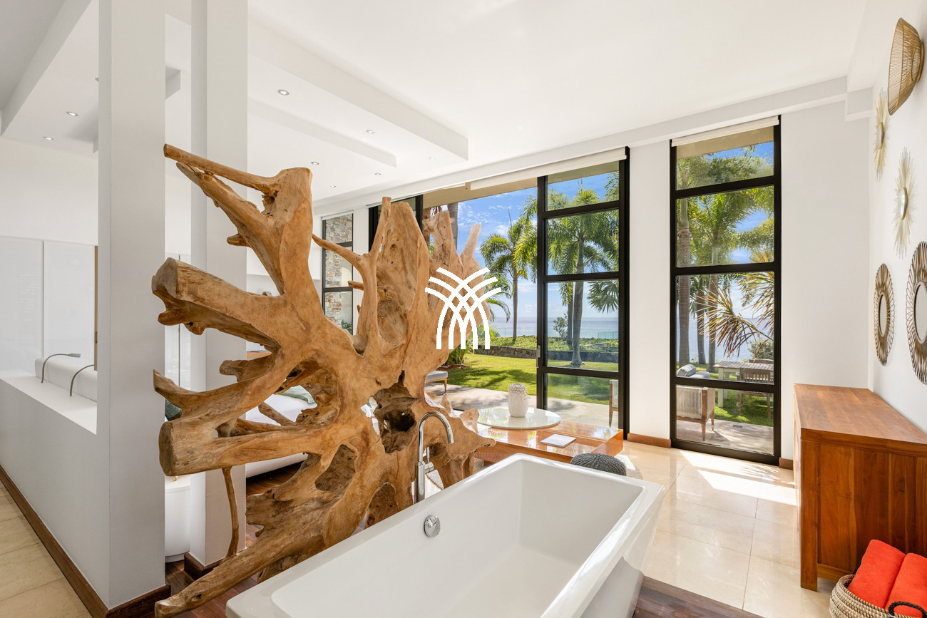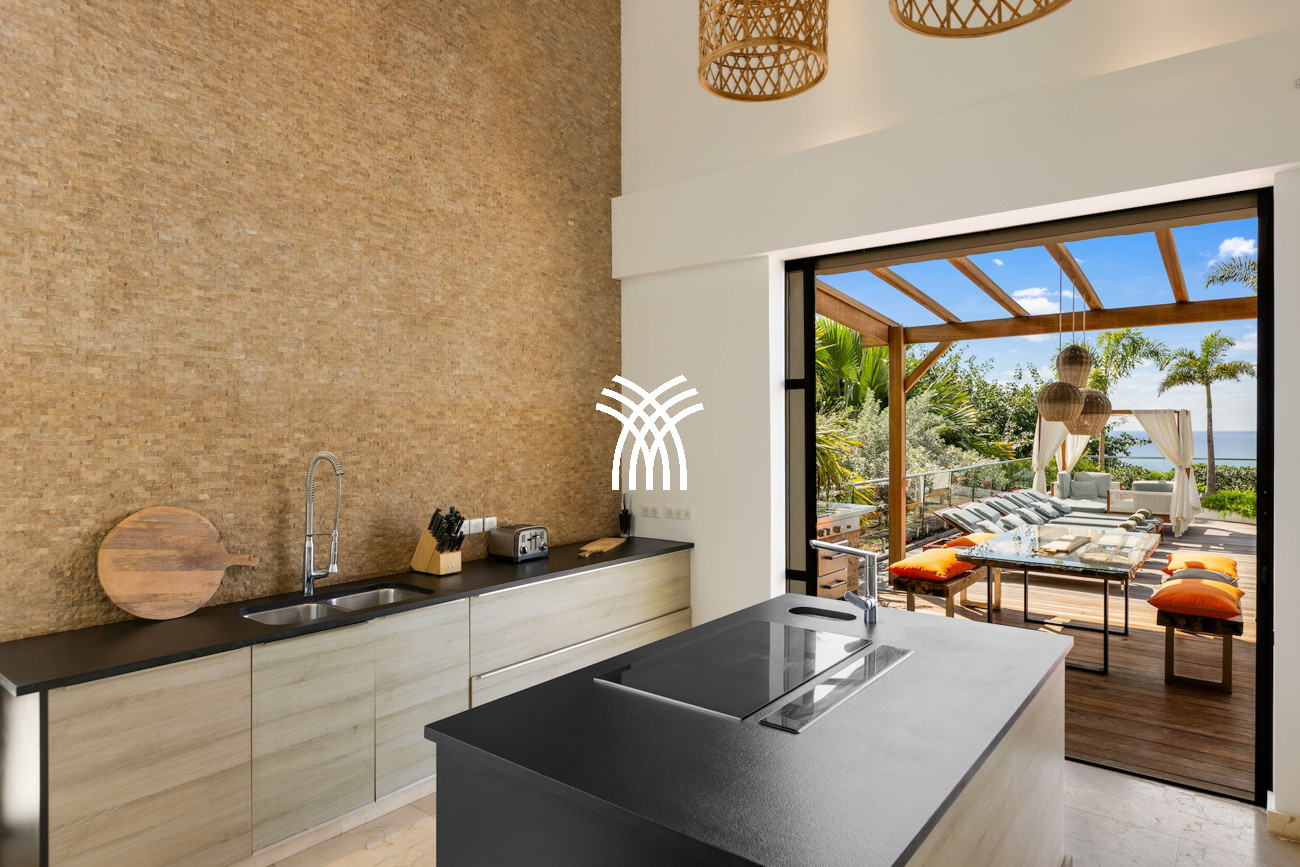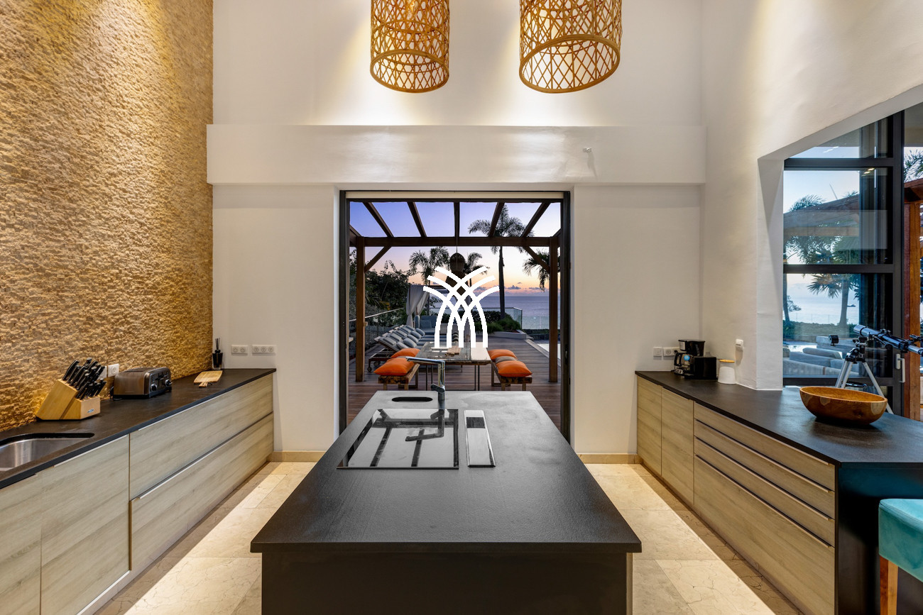 Conçue pour capturer la lumière naturelle et l'esprit apaisant de l'océan, la villa s'ouvre sur des espaces de vie spacieux où le design contemporain rencontre des textures naturelles chaleureuses. Le salon accueillant reflète les tons bleu profond des eaux environnantes, tandis qu'une magnifique table de salle à manger en bois massif s'écoule sans effort vers une cuisine moderne entièrement équipée, créant un environnement harmonieux pour des moments partagés et des divertissements décontractés. Dans toute la maison, le mélange harmonieux de bois et de pierre enrichit les intérieurs, donnant du caractère, de la chaleur et un luxe intemporel à chaque pièce.