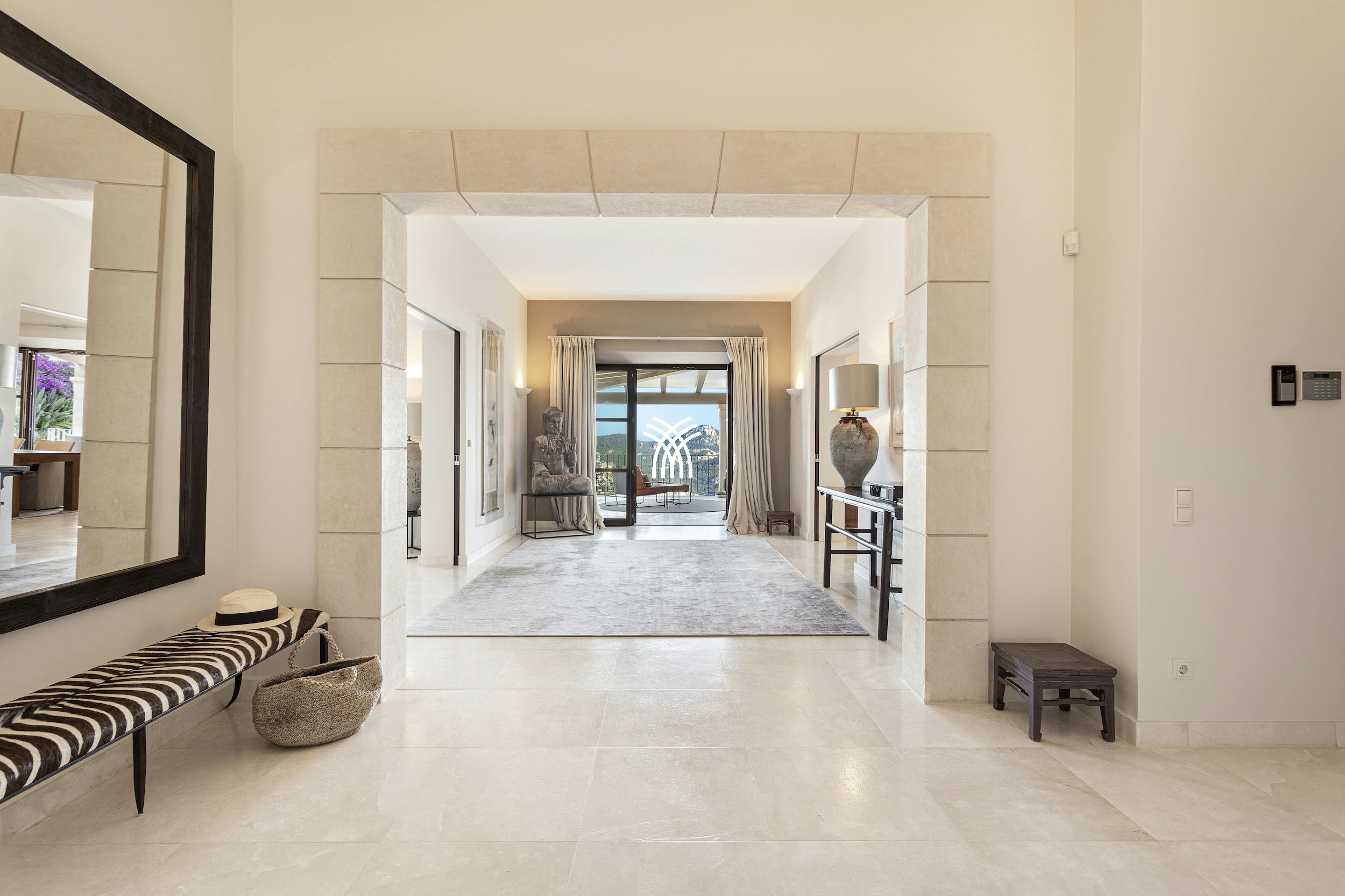 Franchissez l'entrée majestueuse et pénétrez dans des espaces de vie et de salle à manger élégamment aménagés qui s'ouvrent naturellement sur des terrasses extérieures. De là, profitez de vues panoramiques sur le port et la côte, ou dirigez-vous vers la piscine à débordement chauffée et le jacuzzi pour le summum du luxe extérieur.
