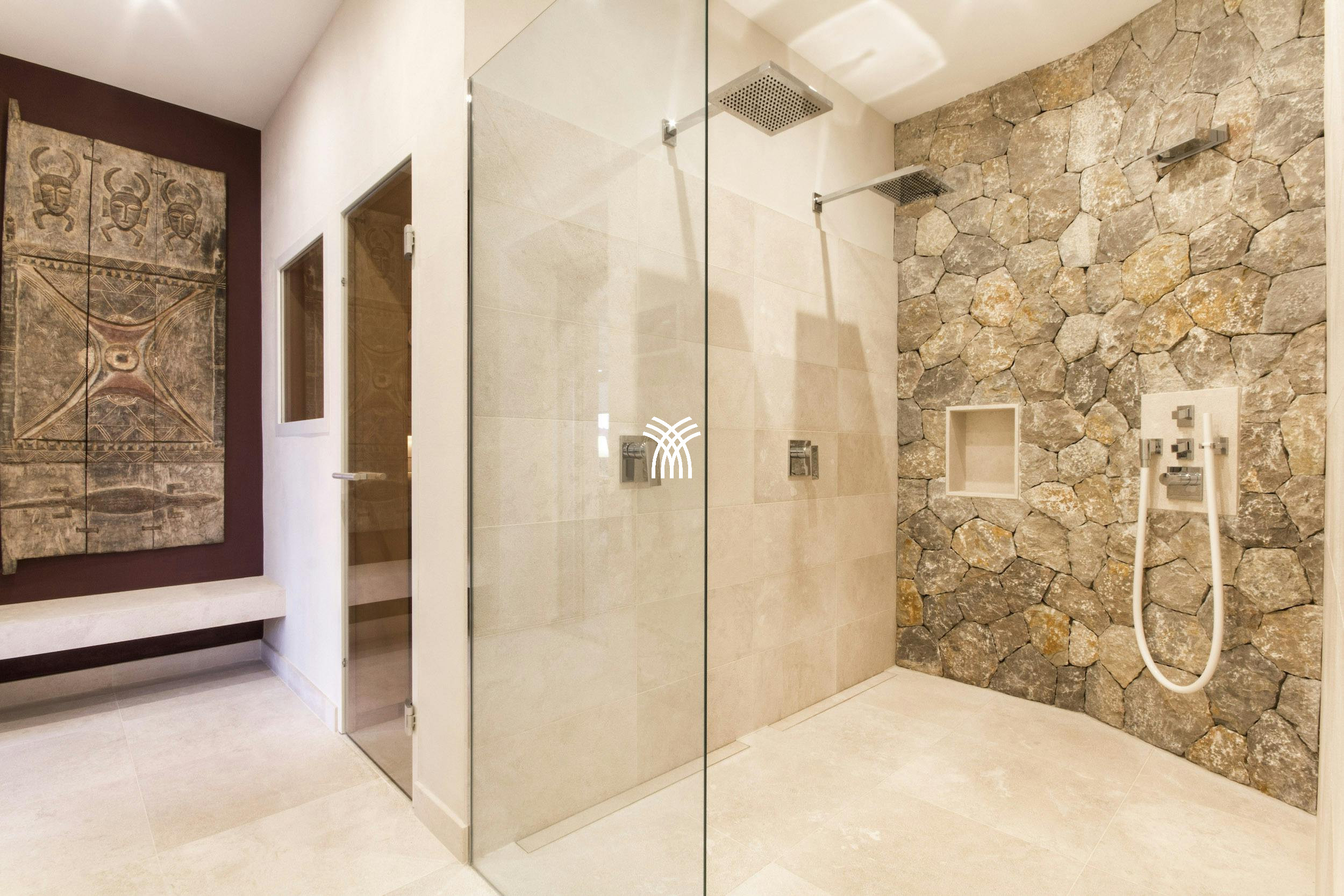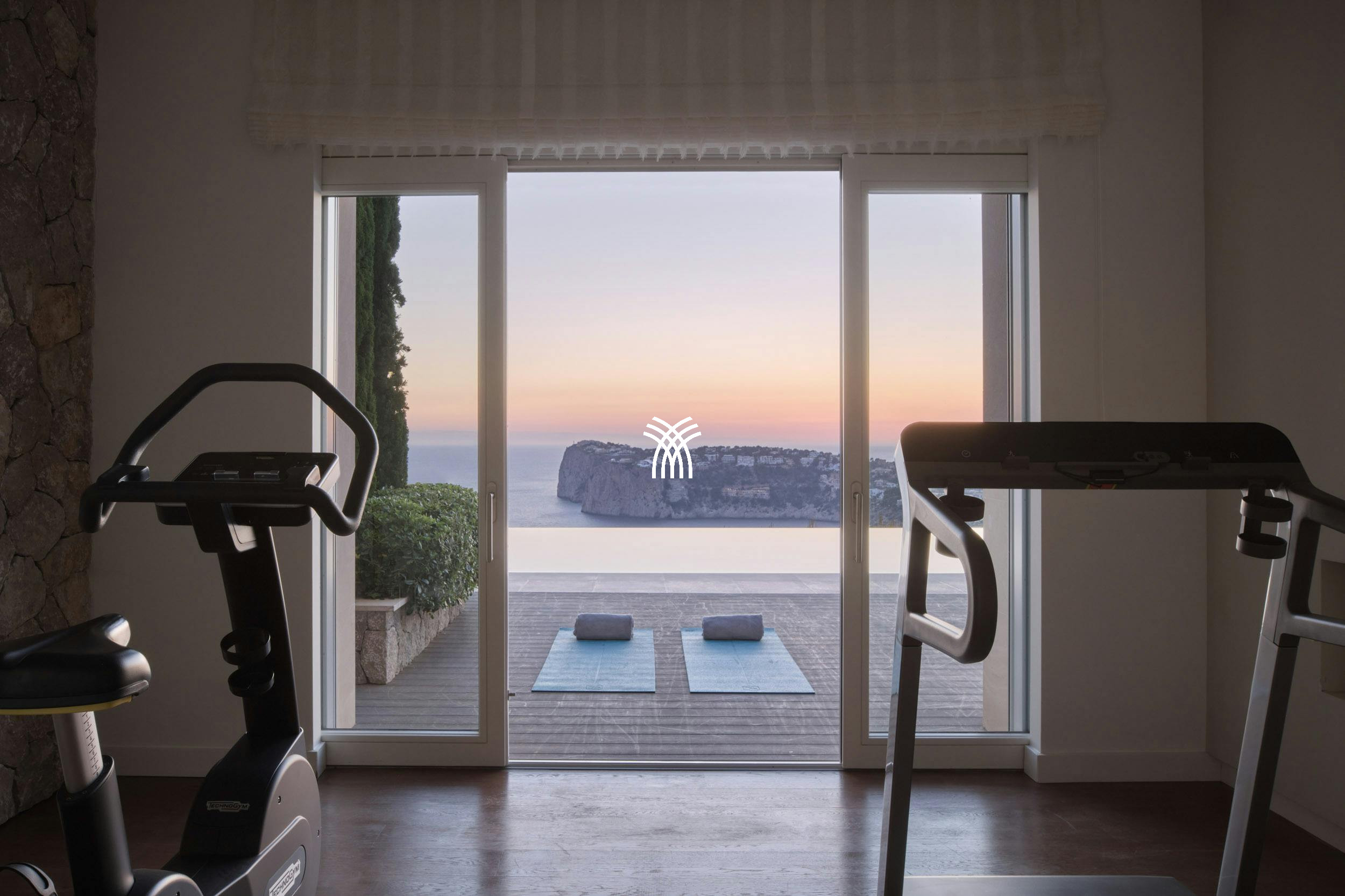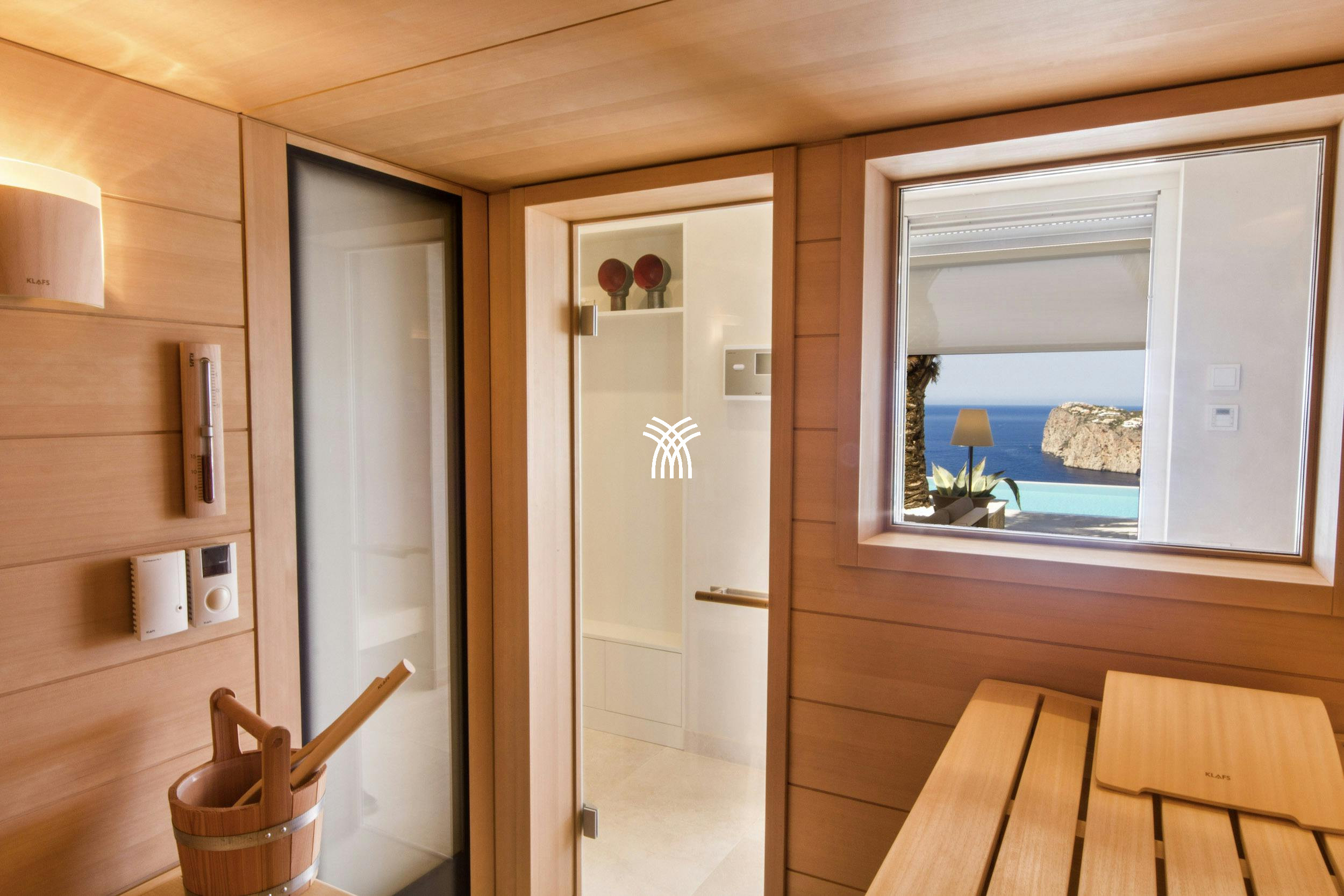 À l'intérieur, la villa dispose d'un sanctuaire spa avec un sauna KLAFS comprenant un SANARIUM®, une salle de gym équipée d'appareils Technogym avec vue sur la mer, et un espace bien-être avec douche et WC. La cuisine principale est dotée d'appareils Gaggenau et d'un réfrigérateur à vin, complétés par des cuisines supplémentaires pour plus de commodité et de divertissement.