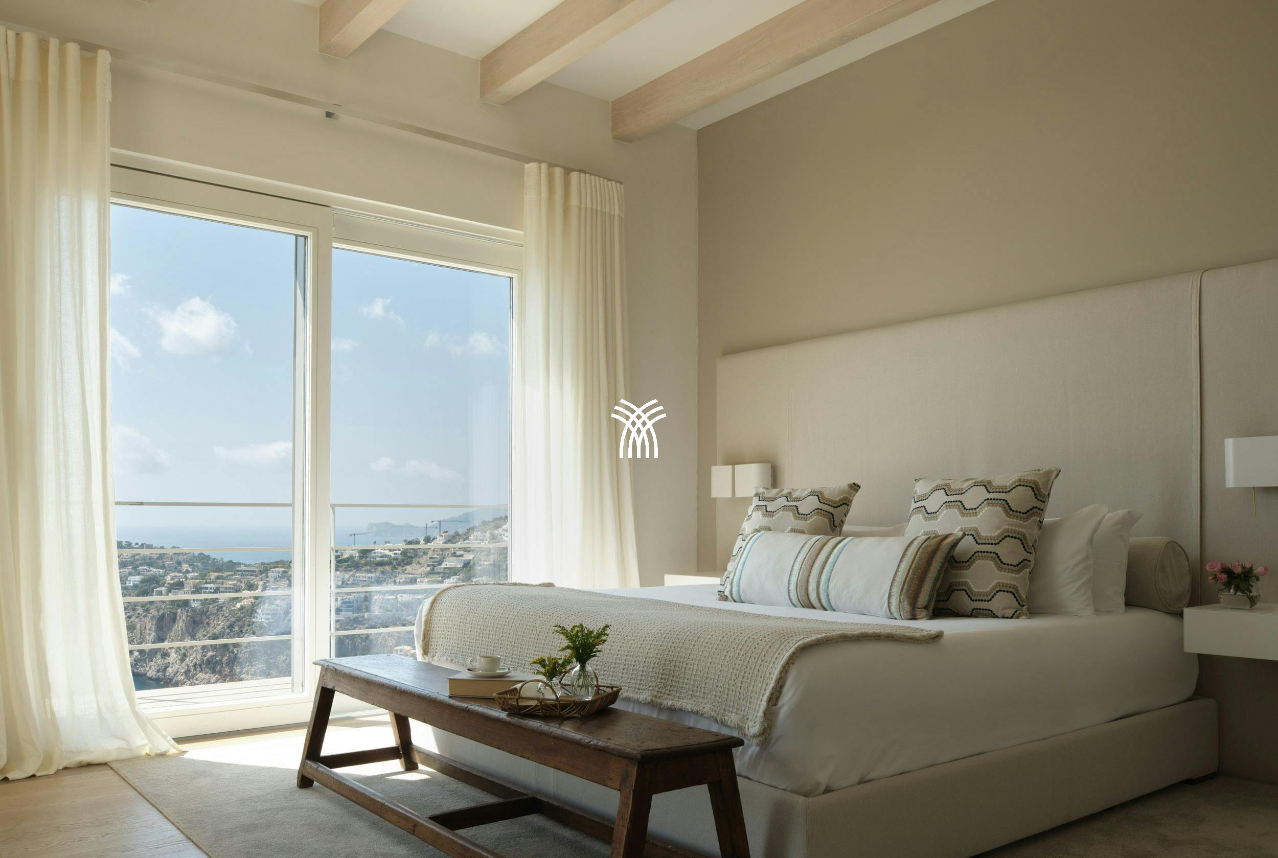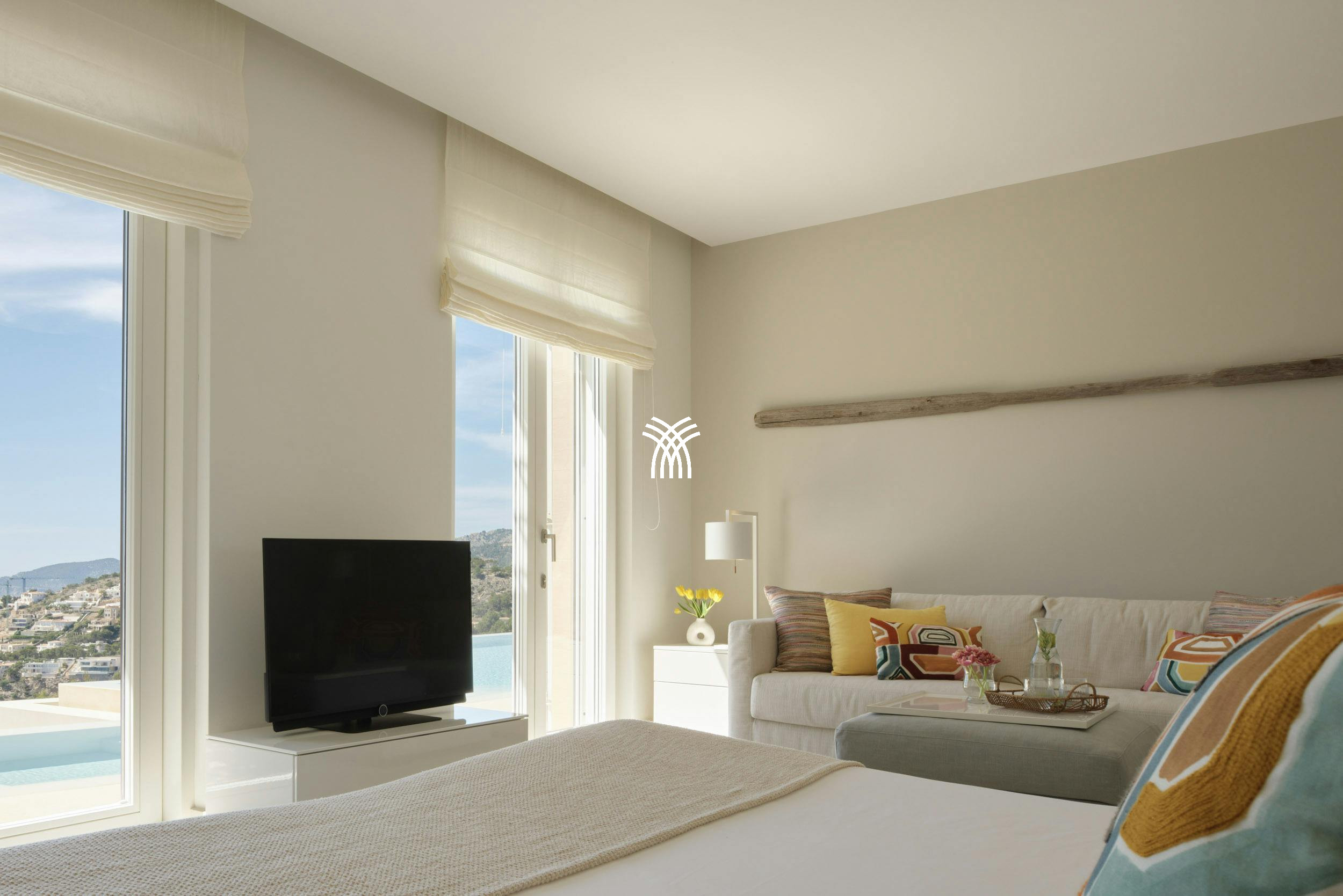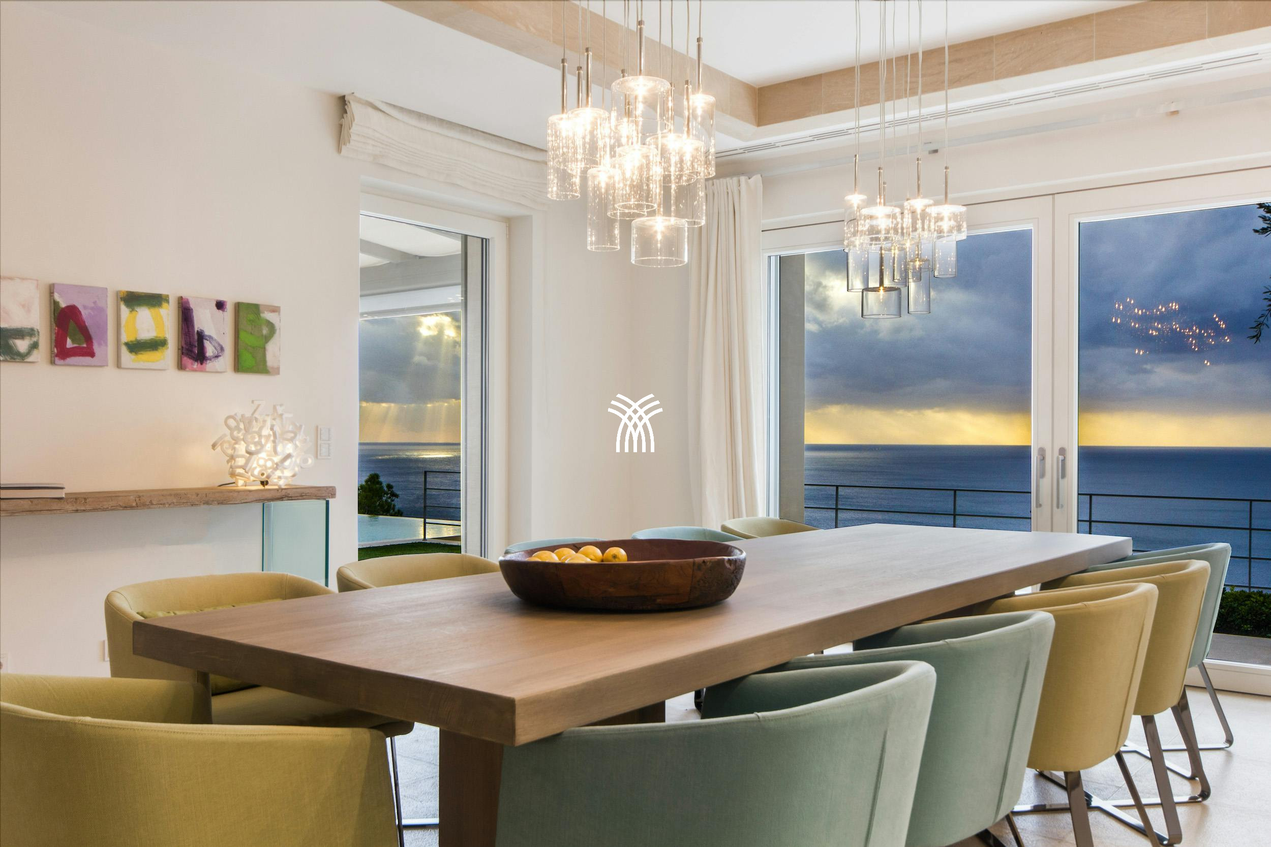 À l'intérieur, la villa passe sans effort entre le confort luxueux et la splendeur scénique. Le salon et la zone cuisine-salle à manger en plan ouvert sont encadrés par de grandes fenêtres qui intègrent l'extérieur, offrant des vues sur mer à couper le souffle depuis presque tous les angles. Des tons neutres doux, des meubles de qualité et des œuvres d'art vibrantes créent une atmosphère de tranquillité raffinée.