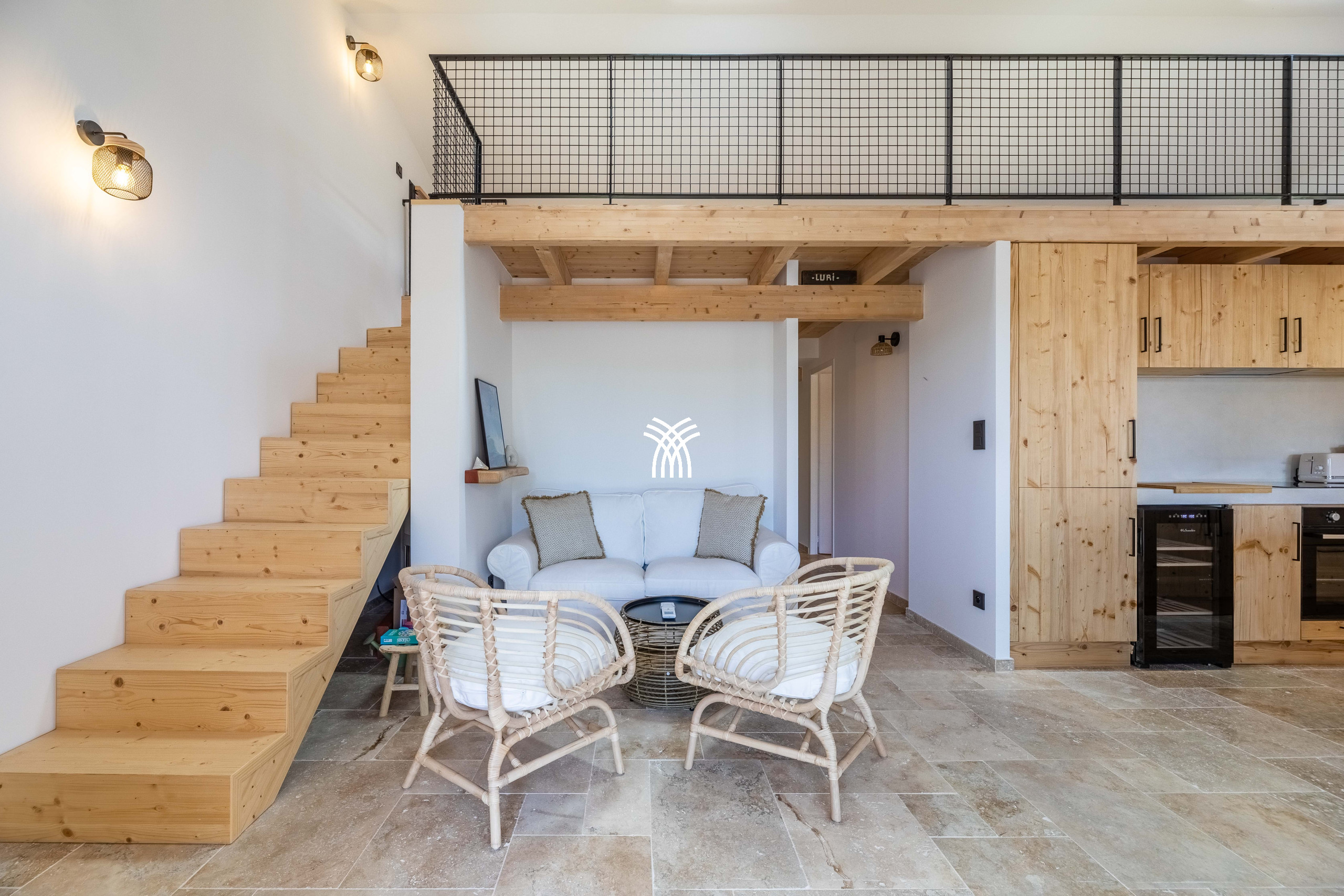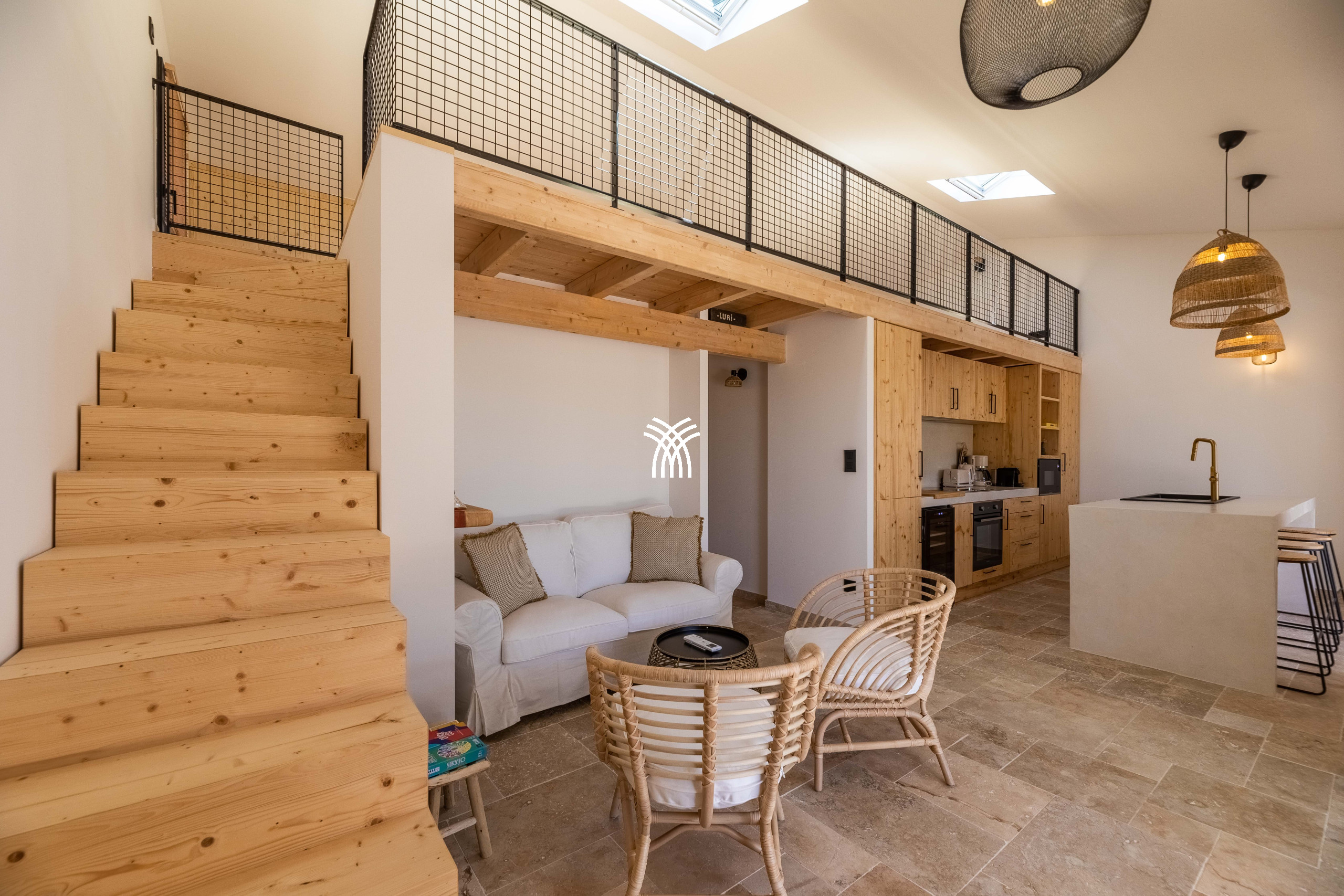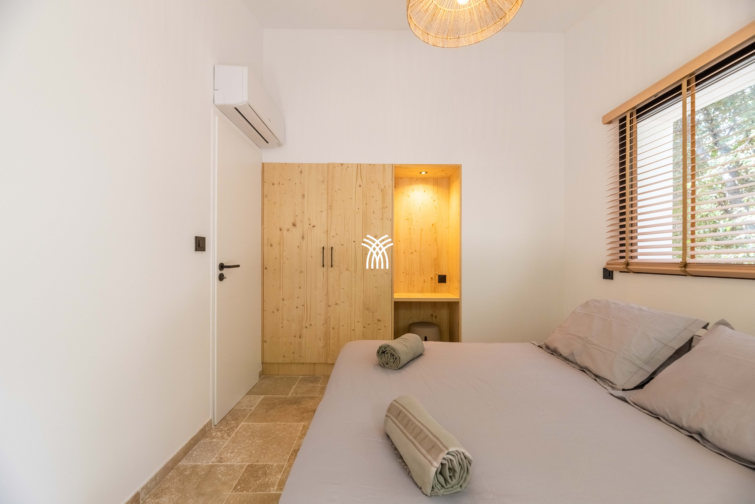 La villa dispose de deux belles chambres climatisées avec literie premium (160x200) et rangements intégrés. Chacune s’ouvre sur une terrasse ou un espace privatif. Une mezzanine spacieuse accueille un troisième couchage ou un espace bureau, parfait pour le télétravail ou pour les enfants. La salle de bain moderne combine baignoire, douche à l’italienne, vasque design et toilettes séparées.