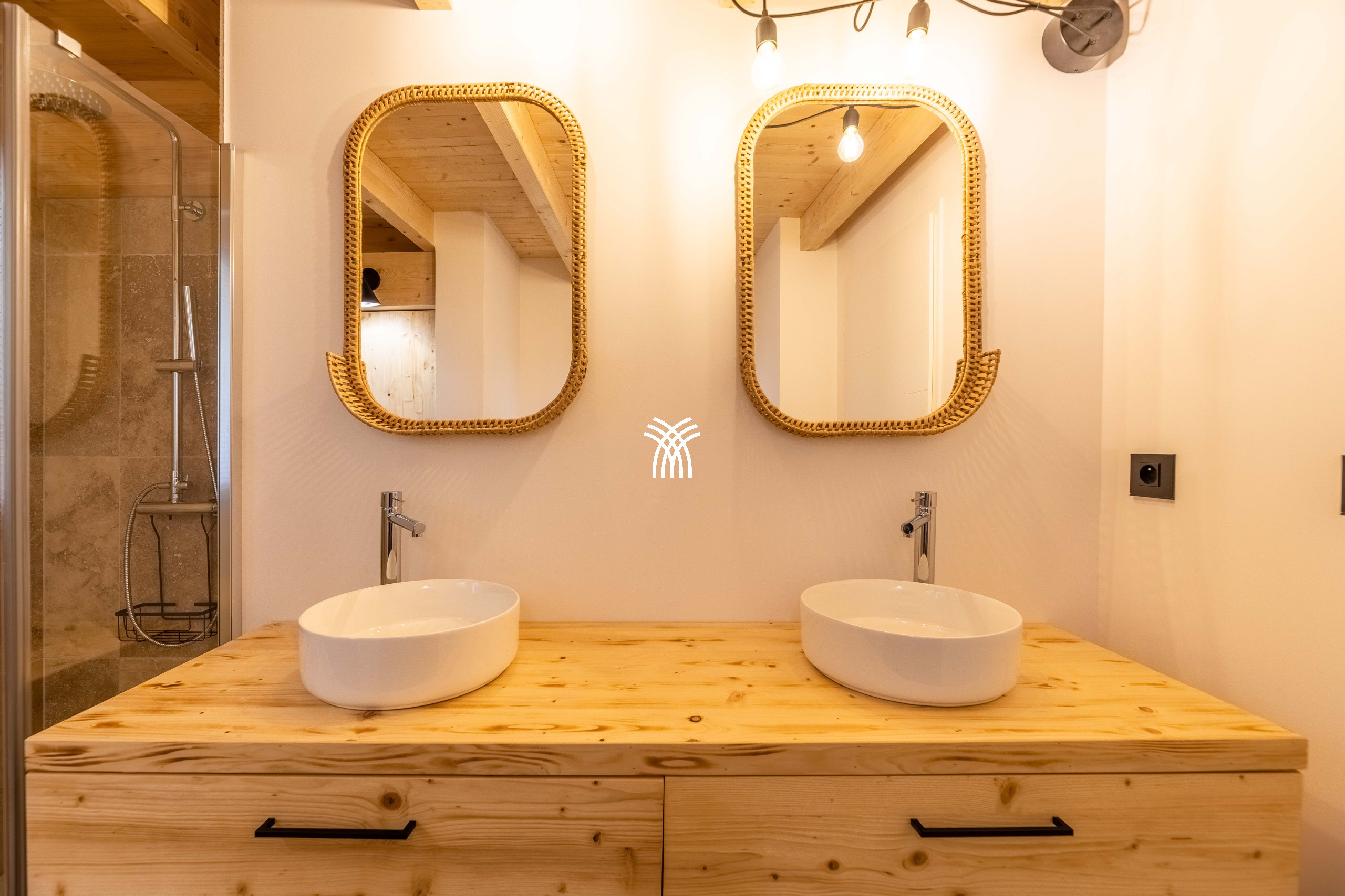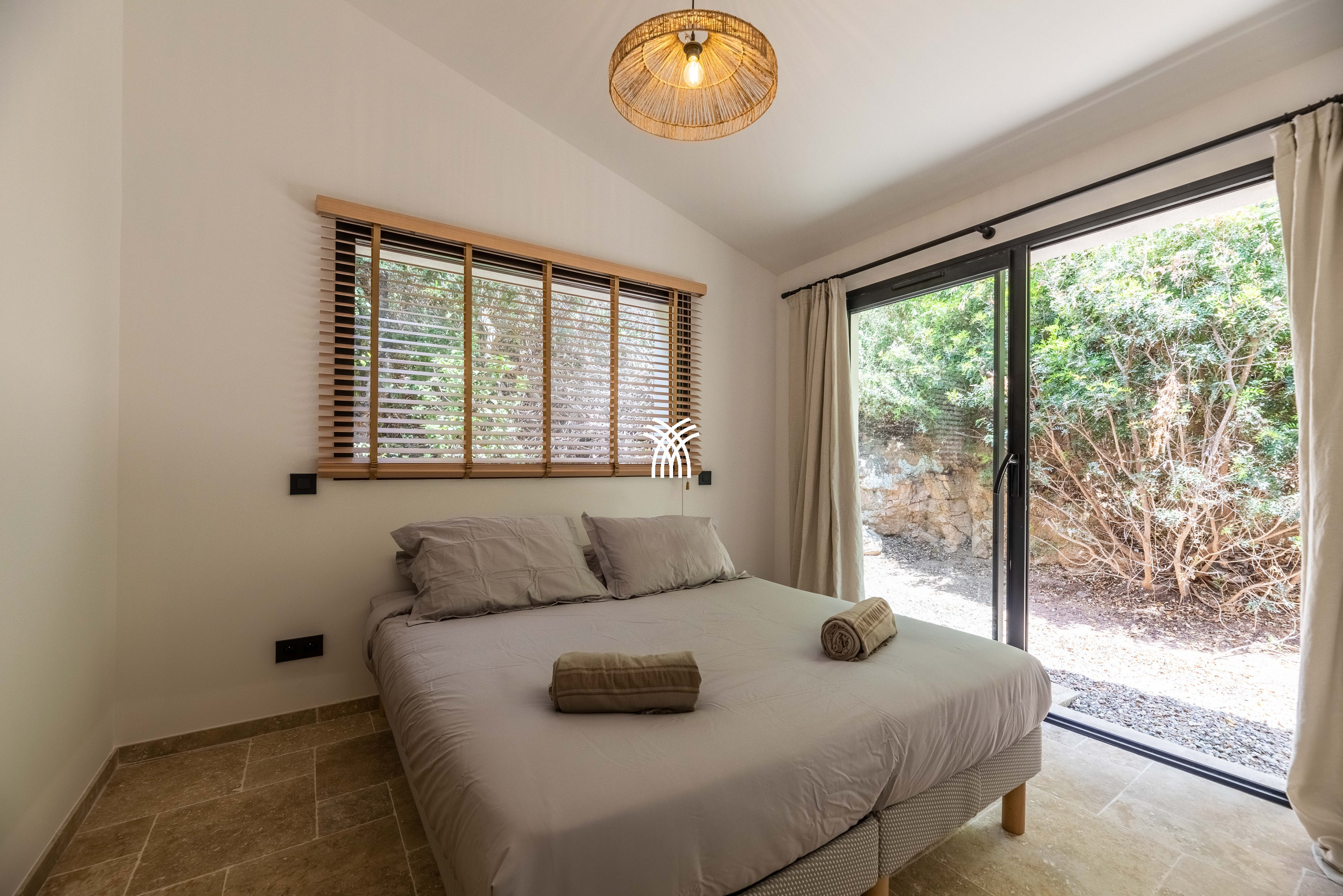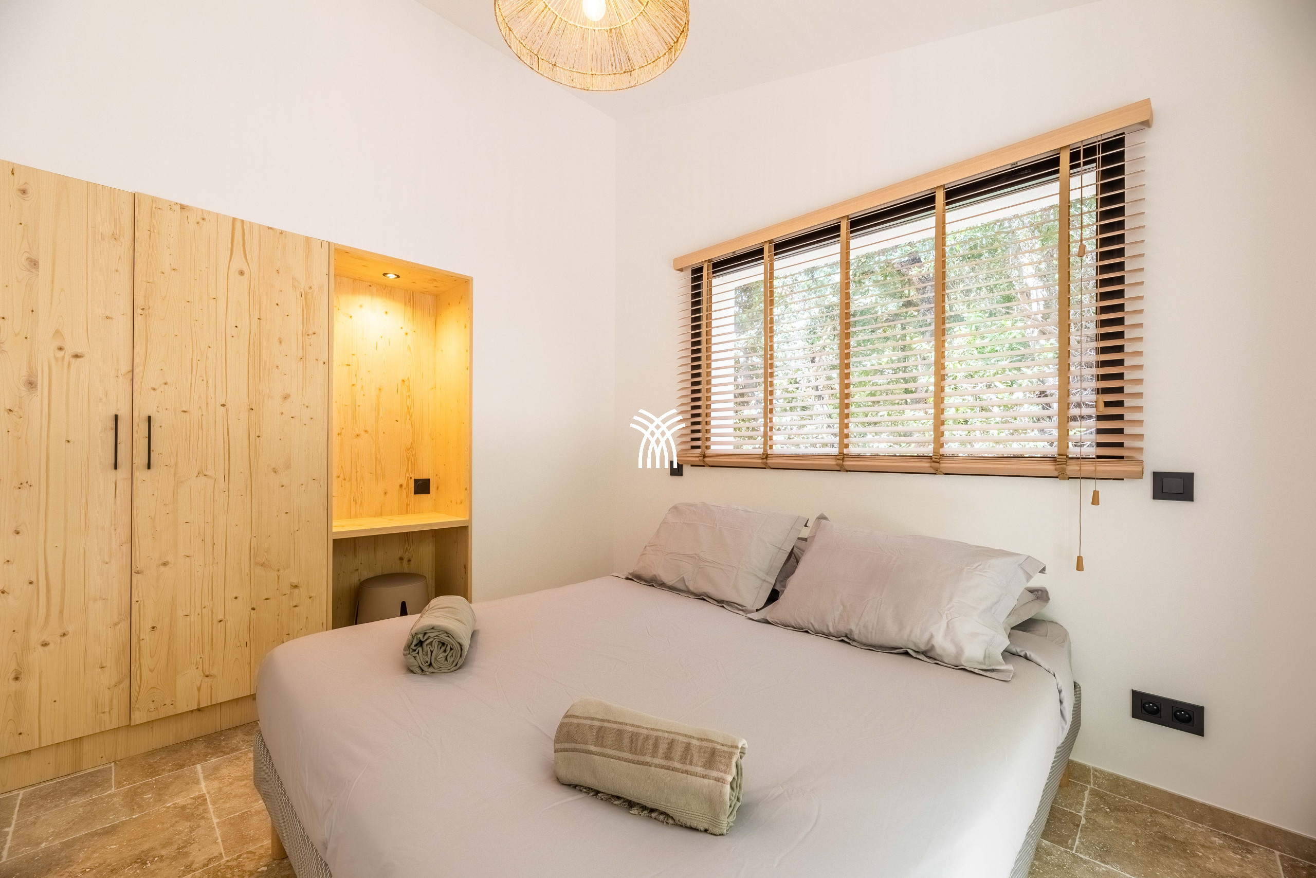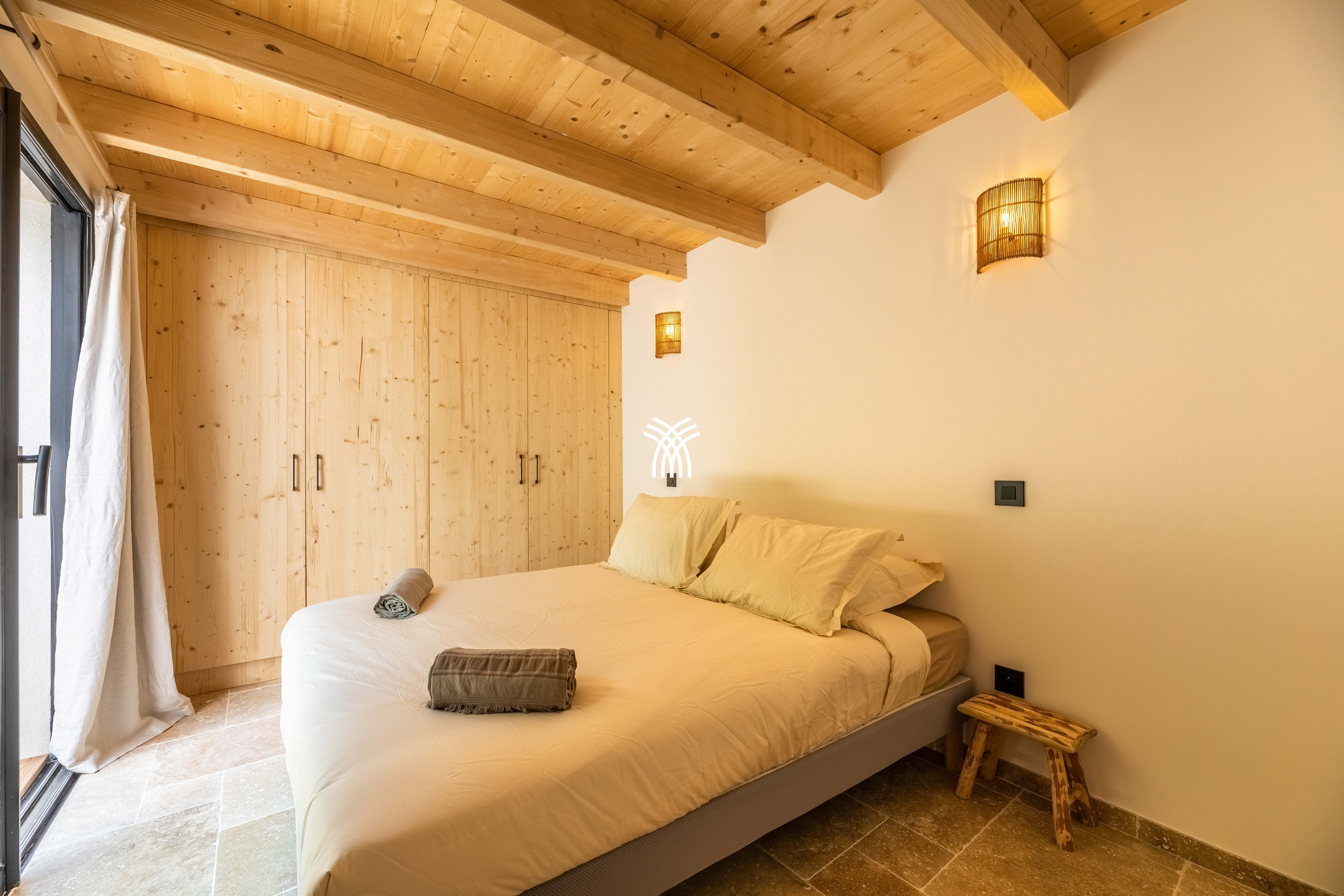La villa dispose de deux belles chambres climatisées avec literie premium (160x200) et rangements intégrés. Chacune s’ouvre sur une terrasse ou un espace privatif. Une mezzanine spacieuse accueille un troisième couchage ou un espace bureau, parfait pour le télétravail ou pour les enfants. La salle de bain moderne combine baignoire, douche à l’italienne, vasque design et toilettes séparées.
