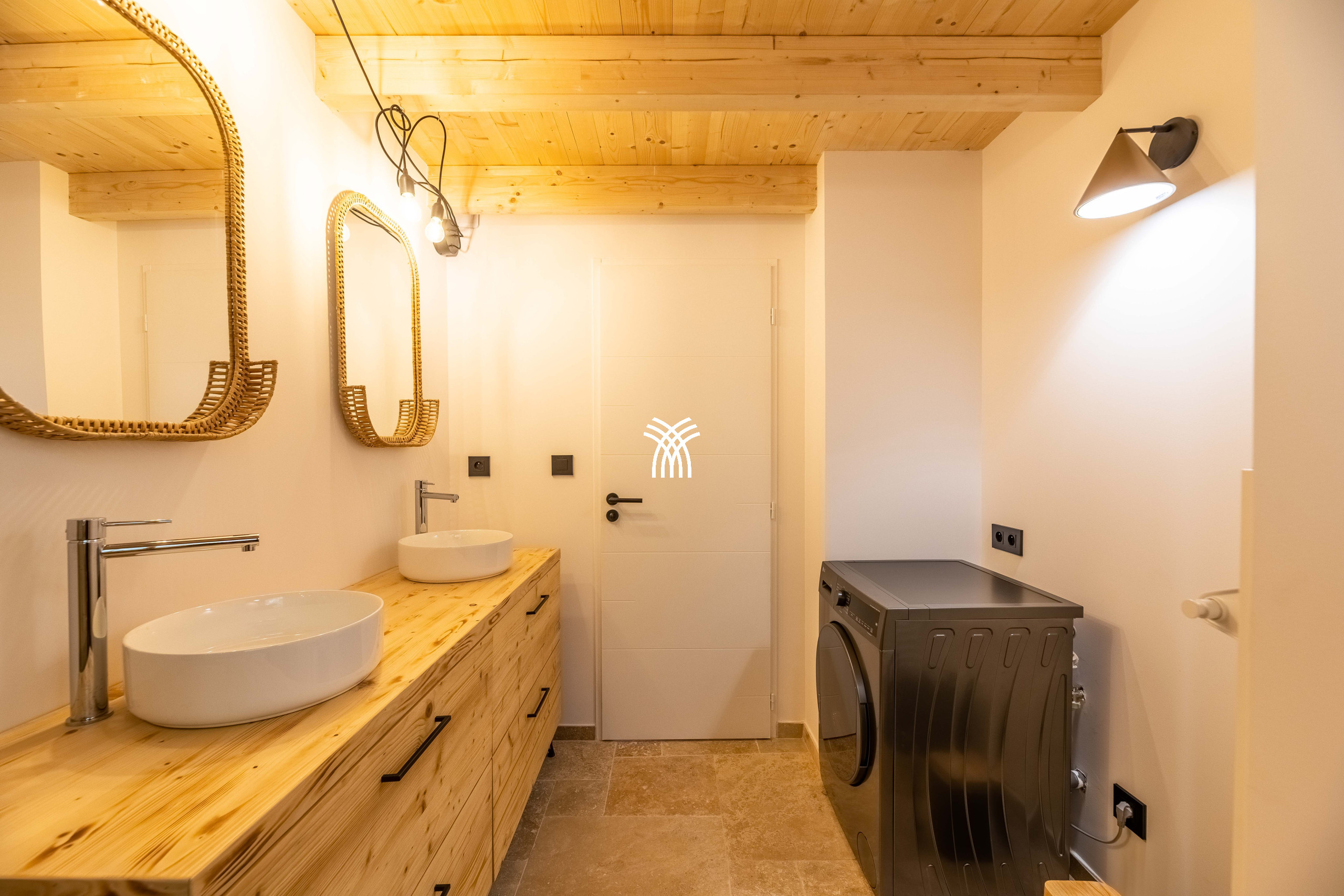 Dès l’entrée, les lignes épurées et les matières nobles donnent le ton. L’espace de vie, baigné de lumière naturelle, s’ouvre sur une terrasse ombragée où chaque repas devient un moment suspendu. La cuisine, ultra-équipée avec cave à vin, grand four, gazinière 5 feux, micro-ondes, lave-vaisselle et machine à café, ravira autant les épicuriens que les amateurs de simplicité.