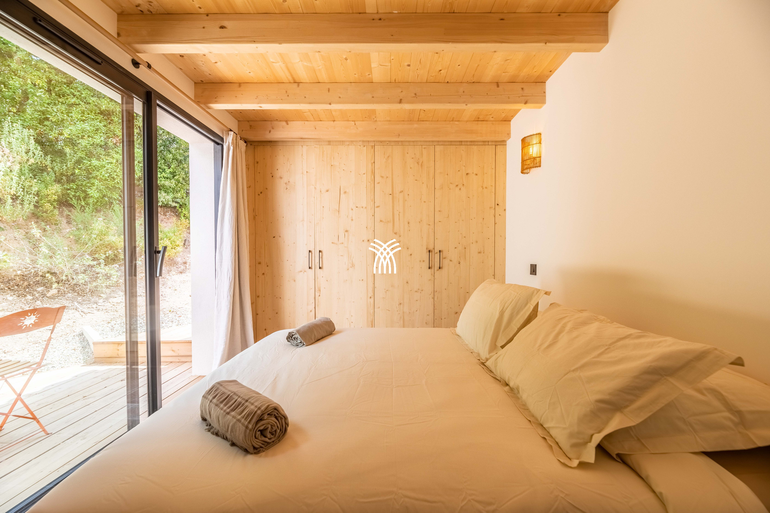 La villa dispose de deux chambres chaleureuses aux literies haut de gamme (160x200), chacune prolongée par une terrasse privative avec mobilier extérieur pour profiter d’instants intimes en pleine nature. Une mezzanine ouverte propose un espace détente inspirant et un coin bureau pour ceux qui souhaitent allier évasion et télétravail dans un cadre enchanteur.